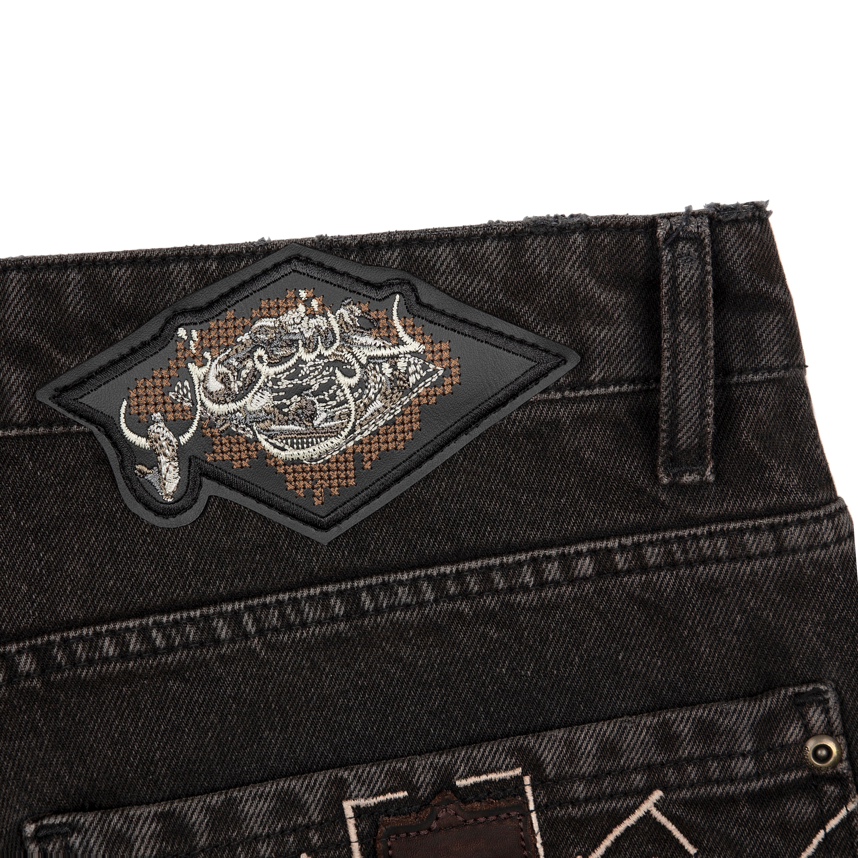 14,5oz denim / 100% cotton / genuine leather applique embroidery on back pocket / embroidered leather patch / custom button / brown washed effect / wash inside out / fits true to size