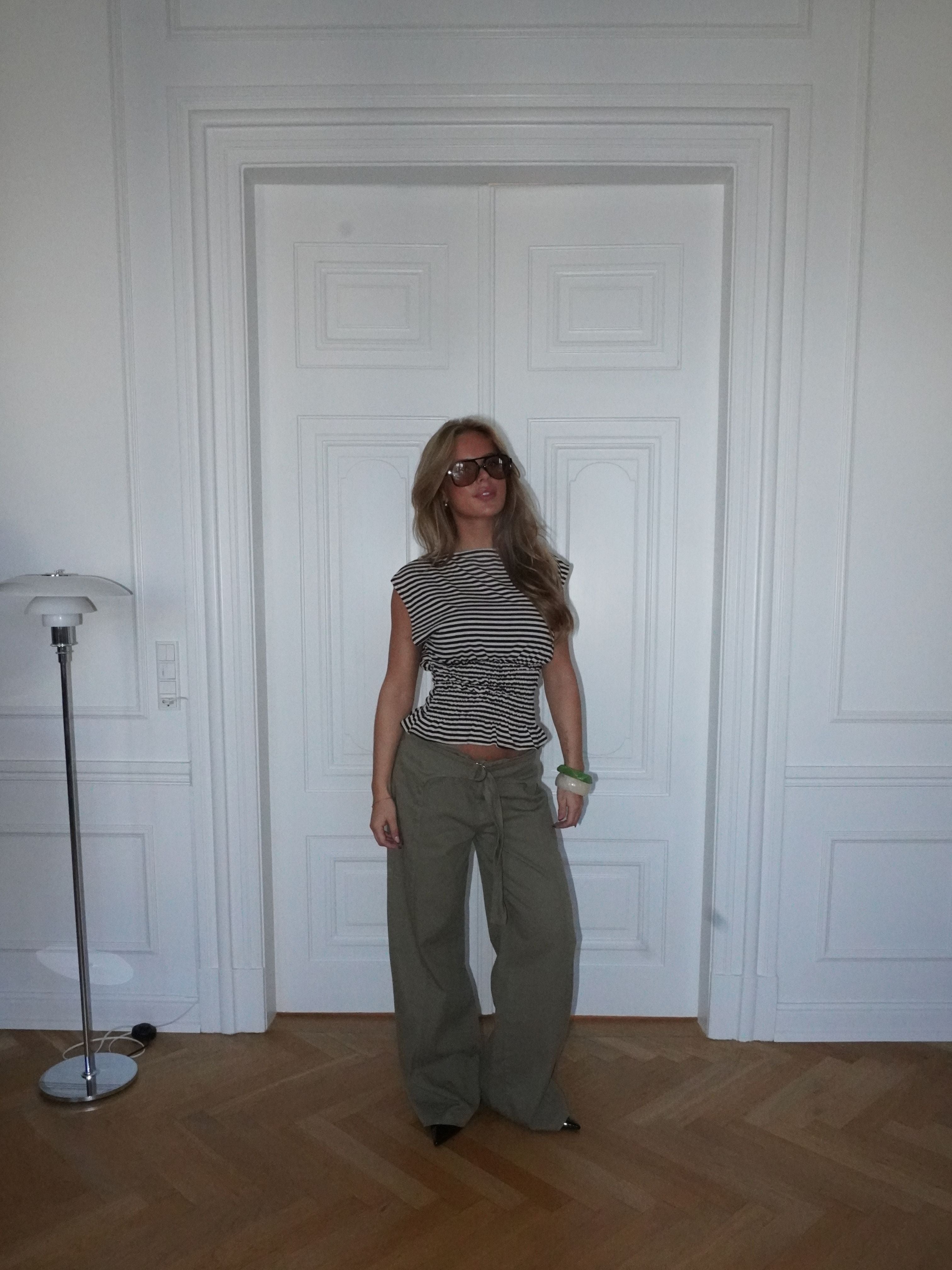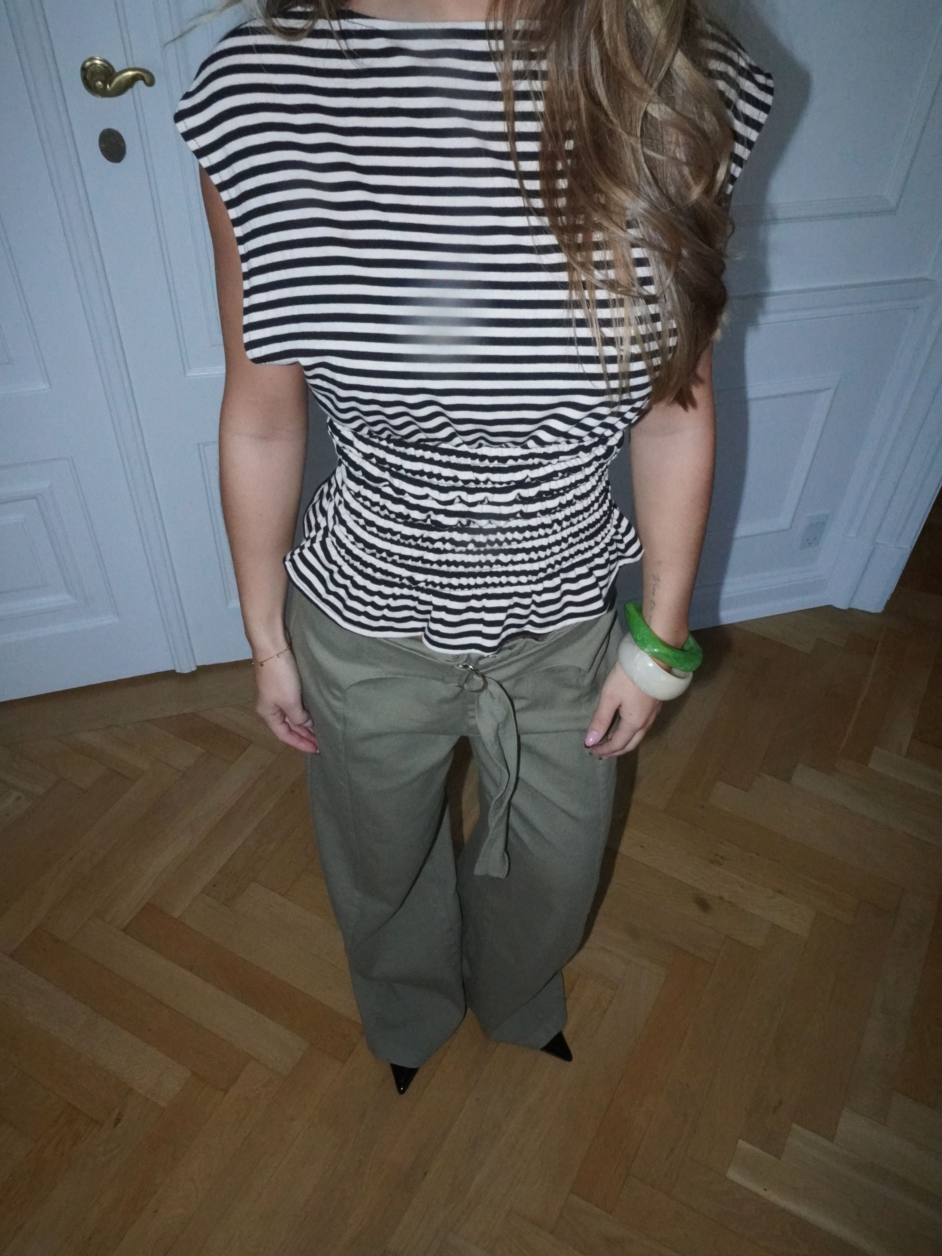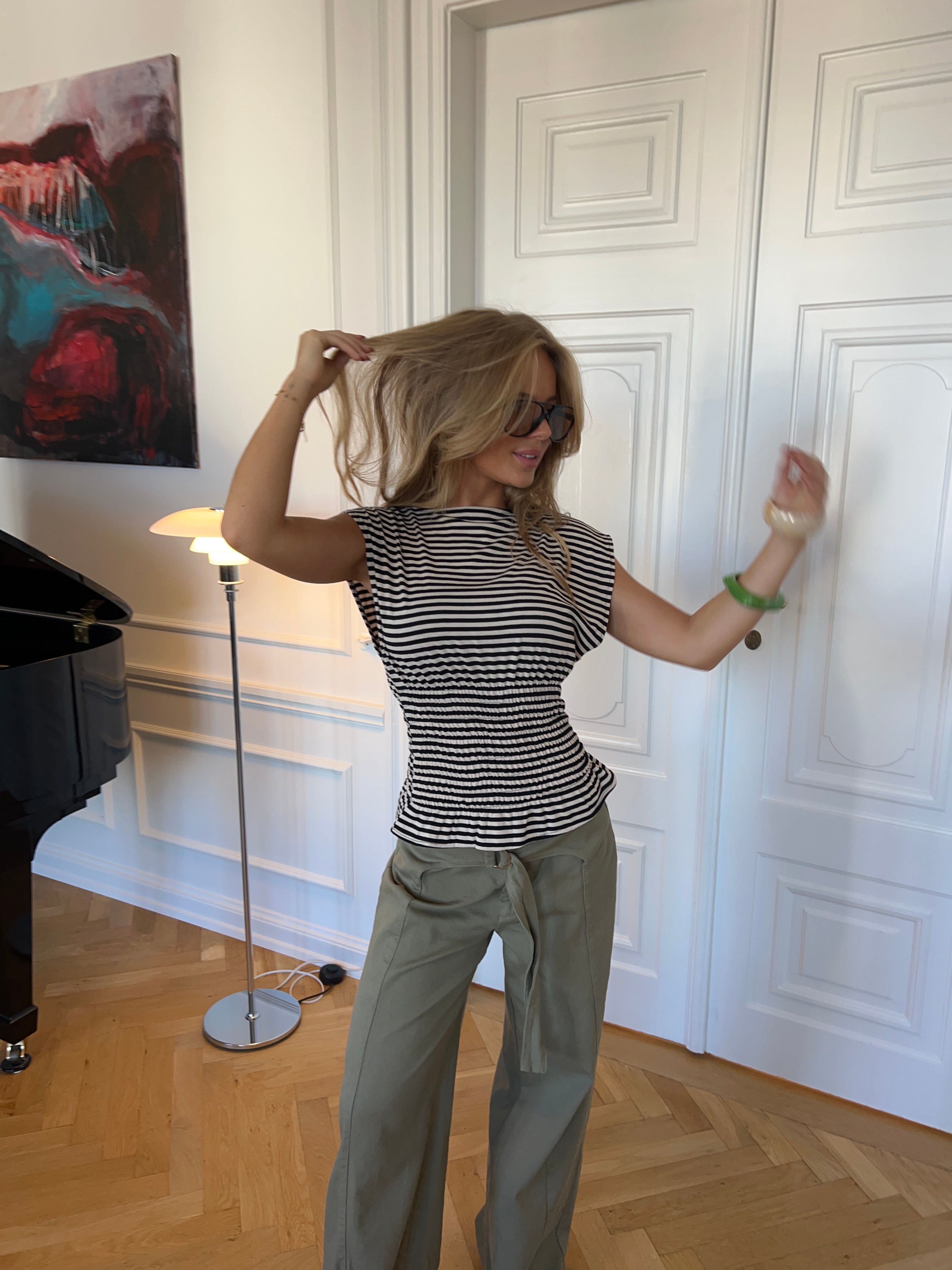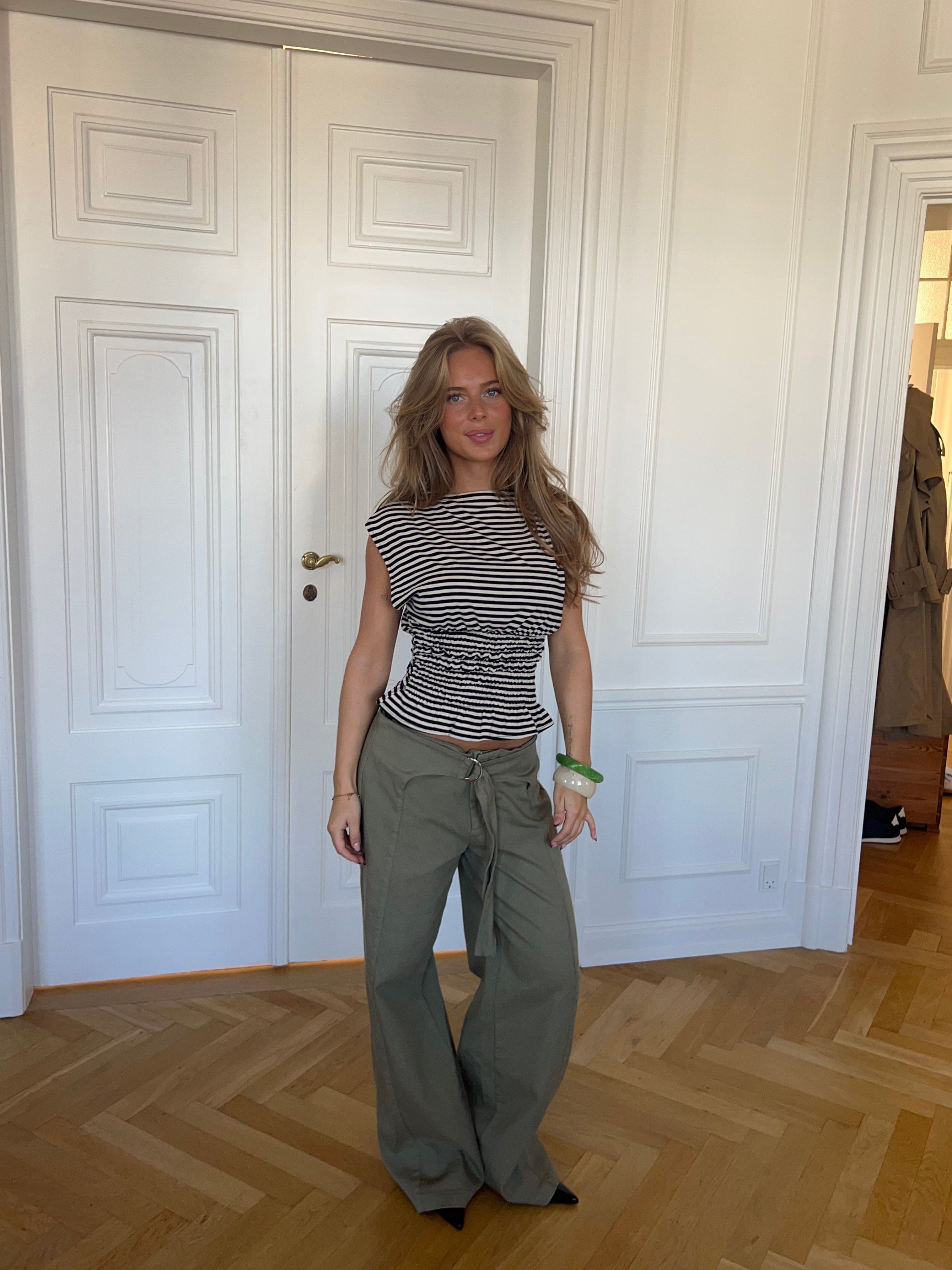 The Bianca top in brown and white combines a classic striped design with feminine details. The top has a straight neckline and short, slanted sleeves that give it a modern and relaxed look. The smock detail at the waist elegantly accentuates the figure, while the slightly wavy hem creates a beautiful and flattering drape. A versatile top that is perfect for both everyday wear and special occasions.