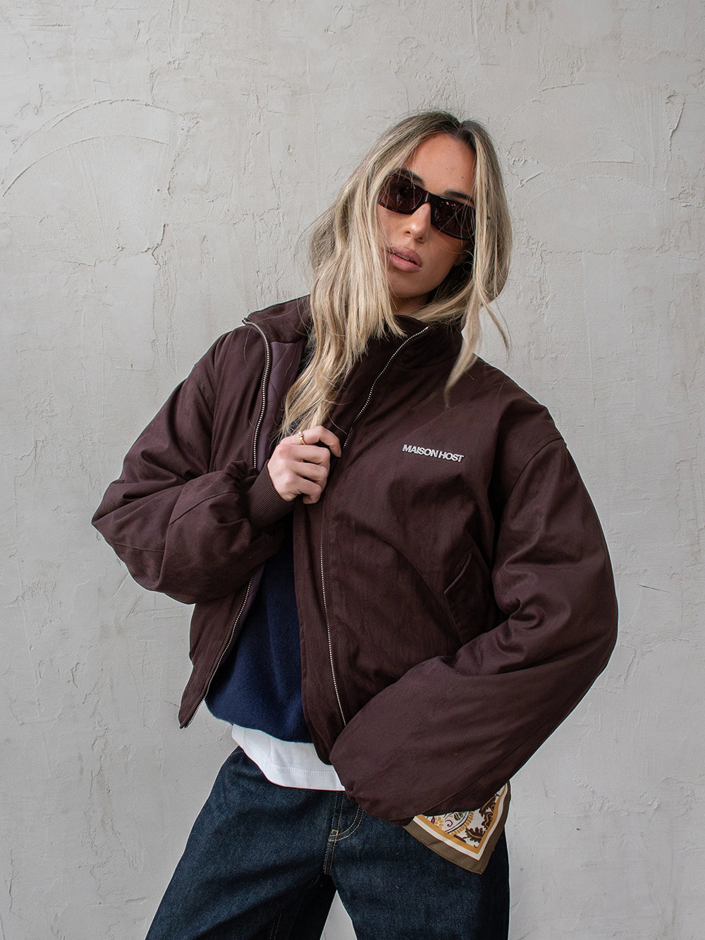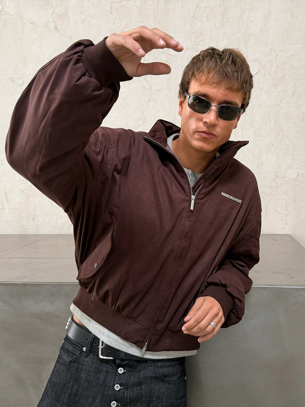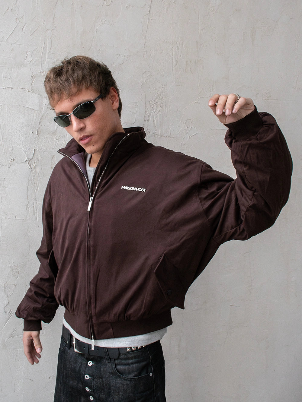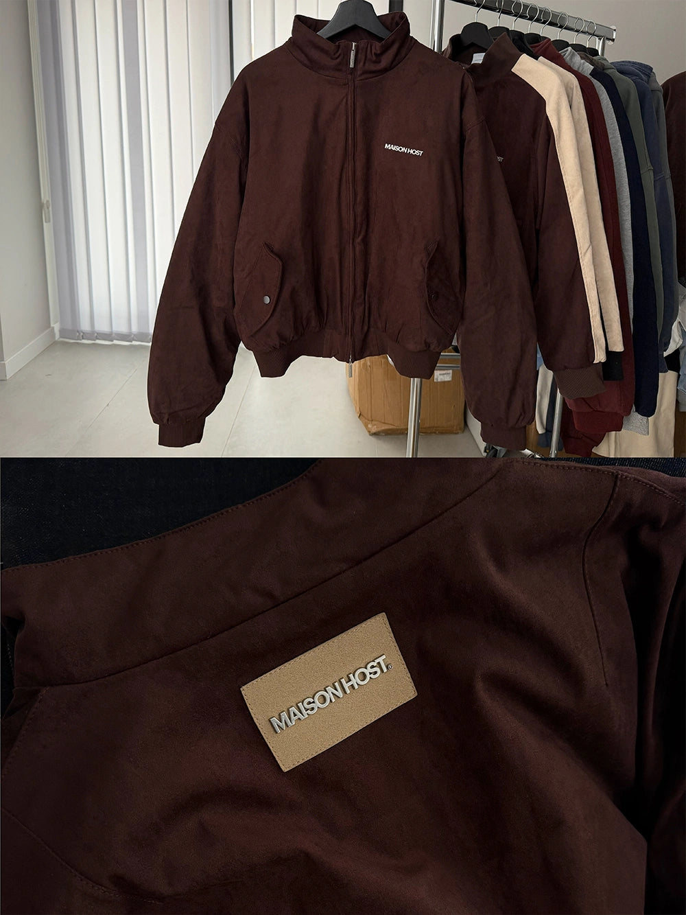 Features a double MAISON HOST metal zipper, button-closure side pockets, and inner lining. Finished with a metal MAISONHOST logo on the chest and a metallic back patch, delivering a clean yet premium look.