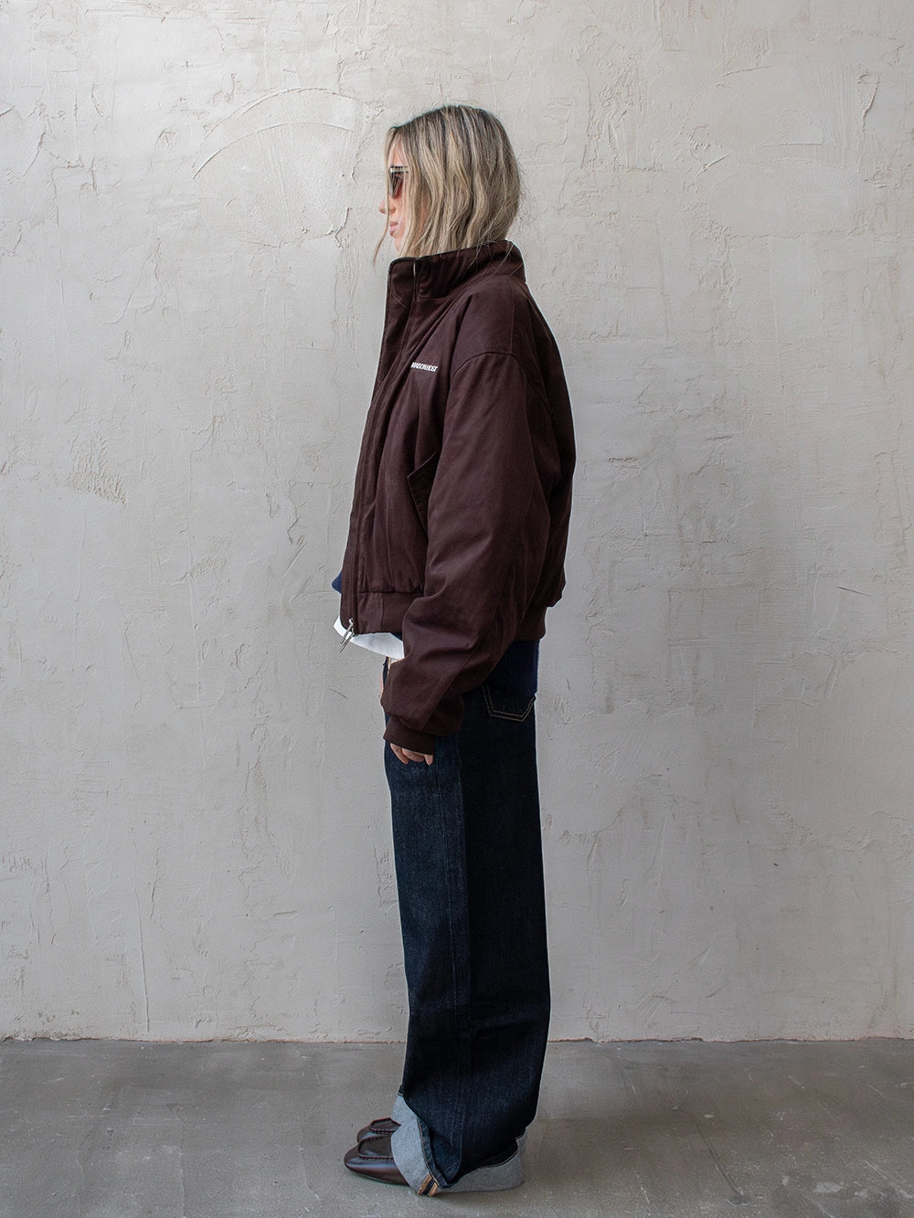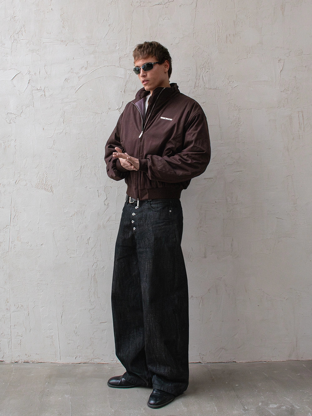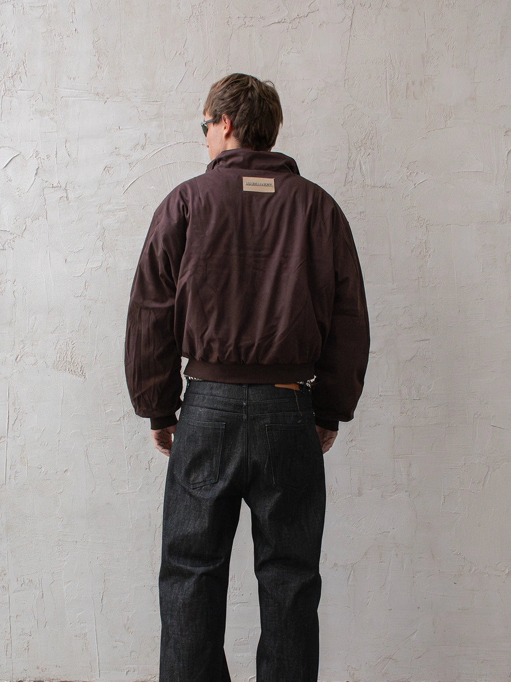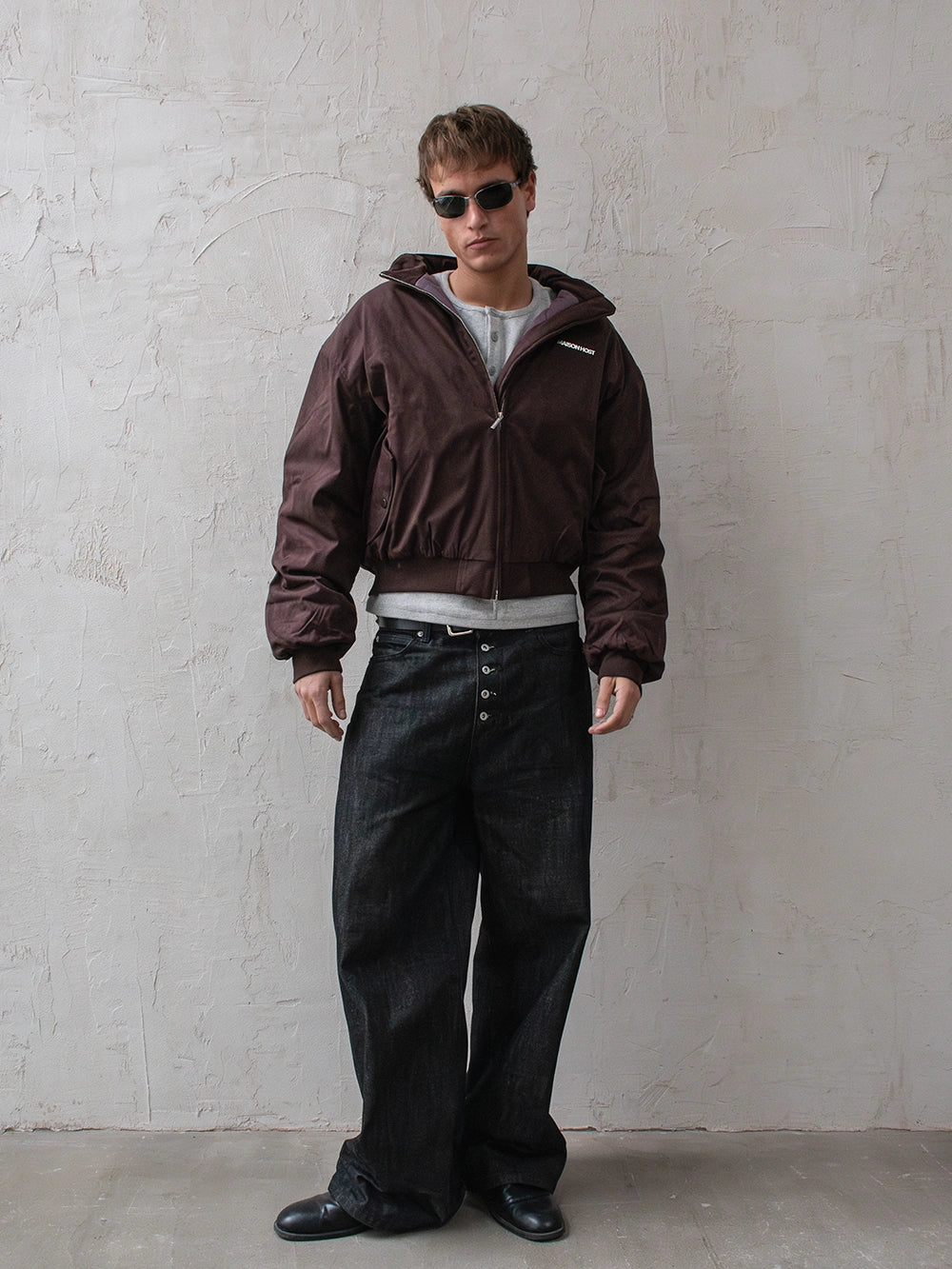 Features a double MAISON HOST metal zipper, button-closure side pockets, and inner lining. Finished with a metal MAISONHOST logo on the chest and a metallic back patch, delivering a clean yet premium look.