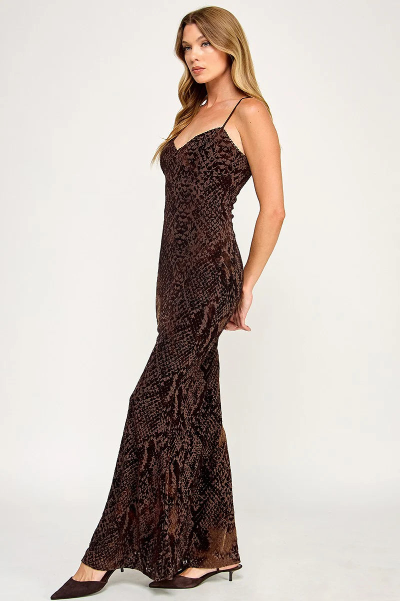 Designed to sculpt and seduce. This deep brown snake-print gown features a waist-cinching silhouette and a dramatic mermaid hem that flows with every step. Bold yet refined, it’s made for nights when confidence speaks louder than words.