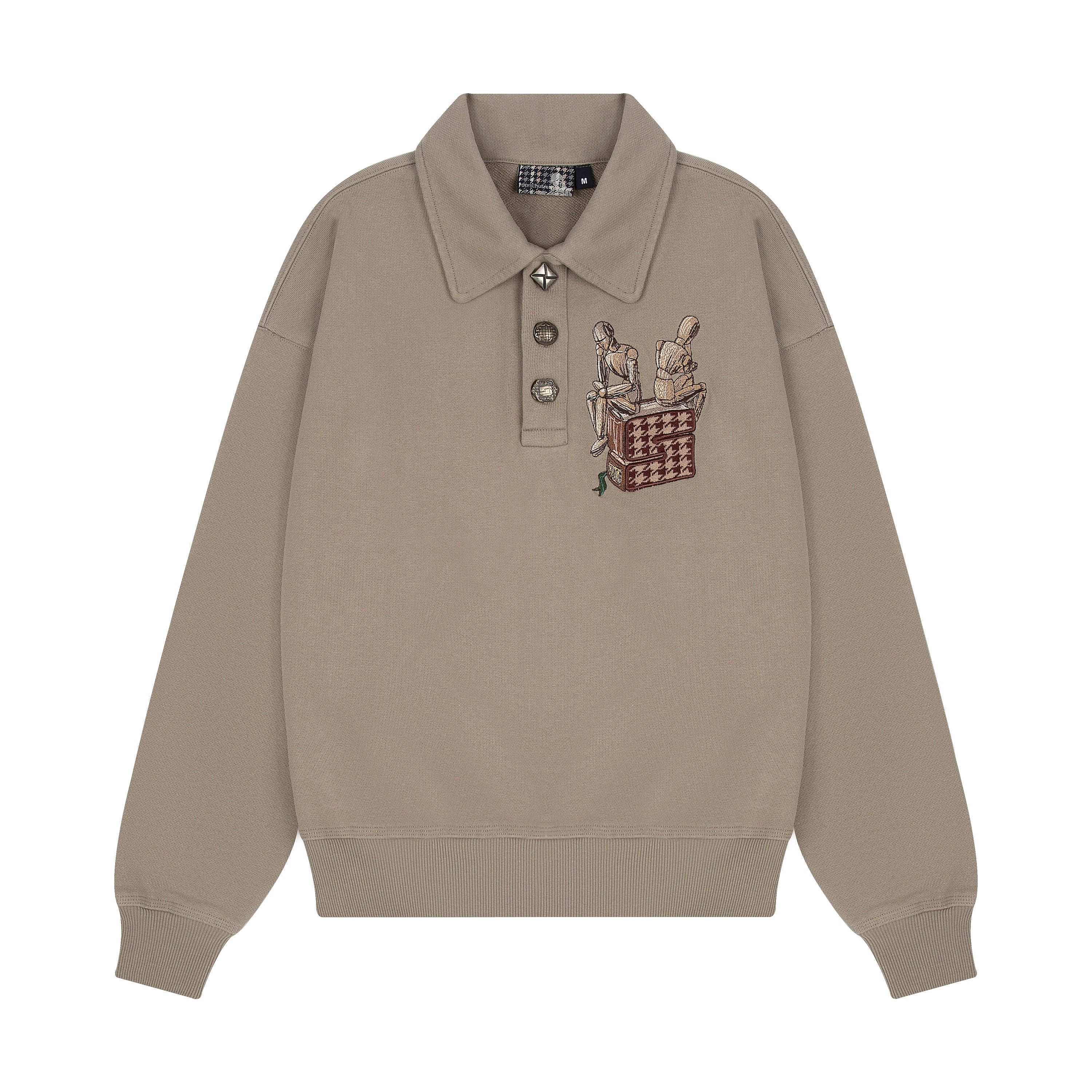 480gsm / 100% preshrunk cotton / embroidery on front with appliqué made from pied-de-poule patterned knit / custom buttons / fits true to size