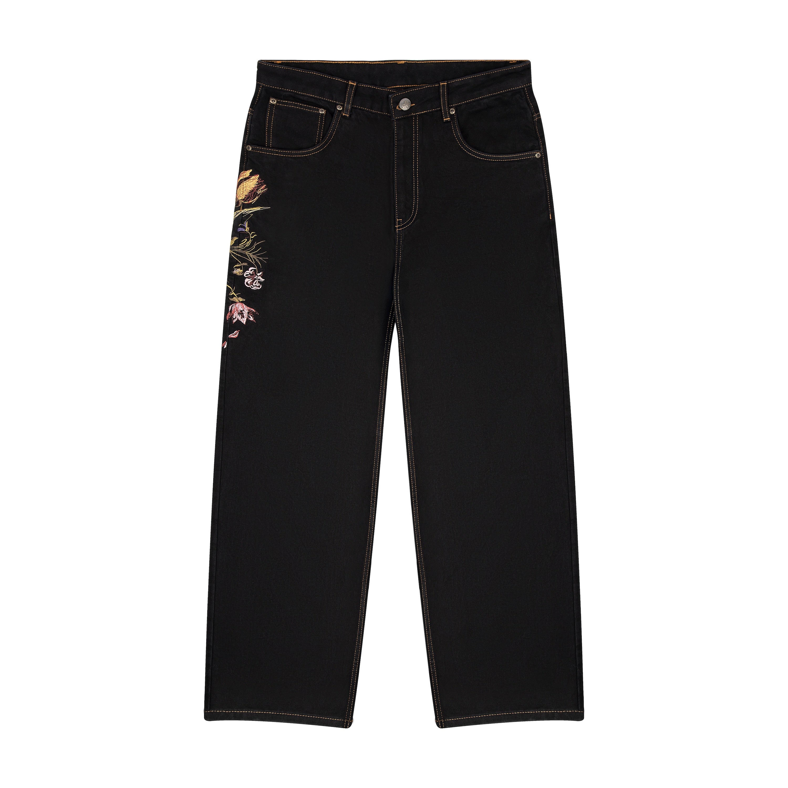 14,5oz denim / 100% cotton / embroidery on front and back / embroidered leather patch / custom button / baggy fit / fits true to size