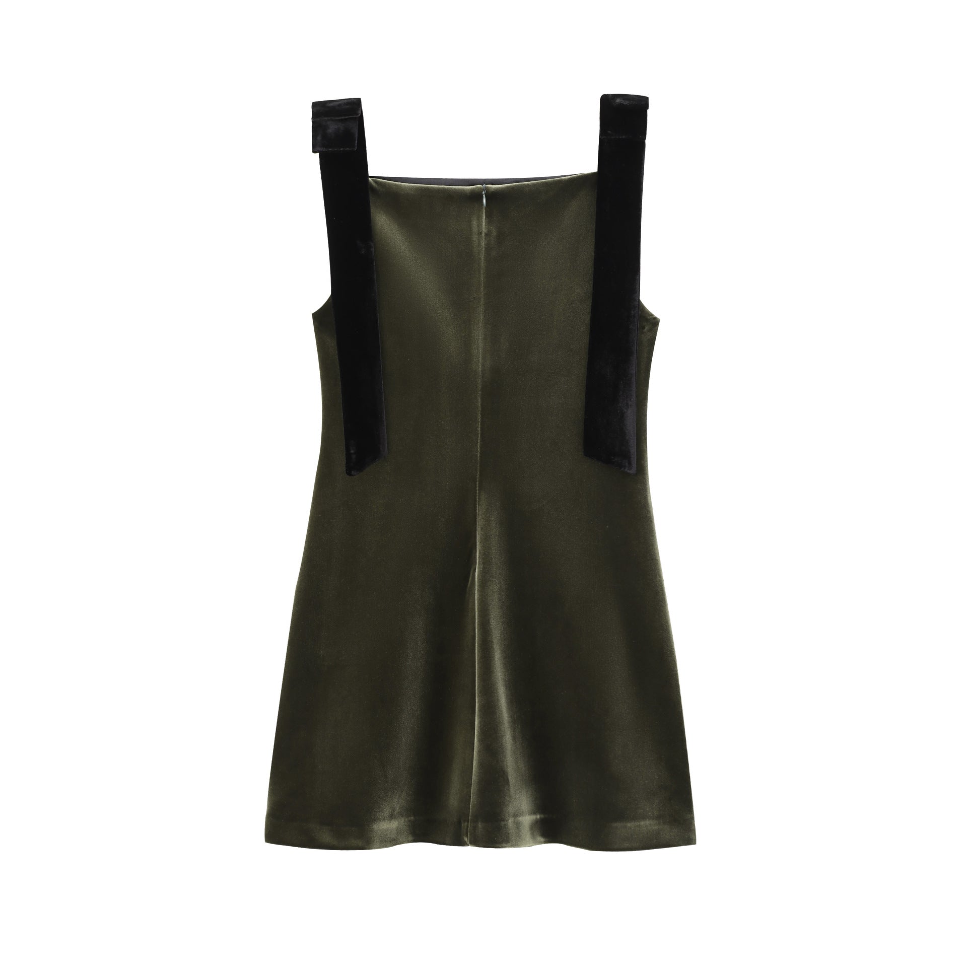 This olive green A-line mini dress features a classic square neckline accented by black velvet bow straps. The rich color and flattering silhouette offer a refined yet playful look for special occasions.