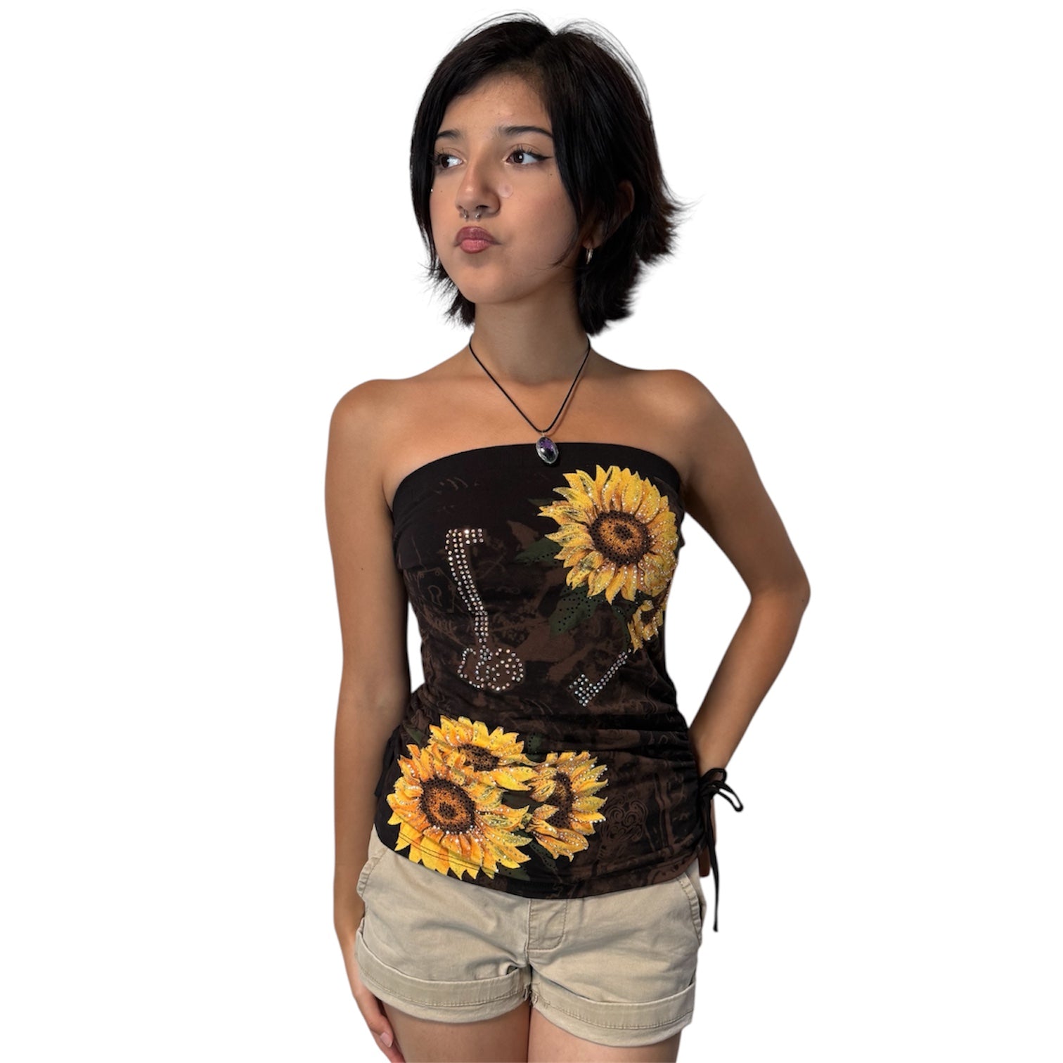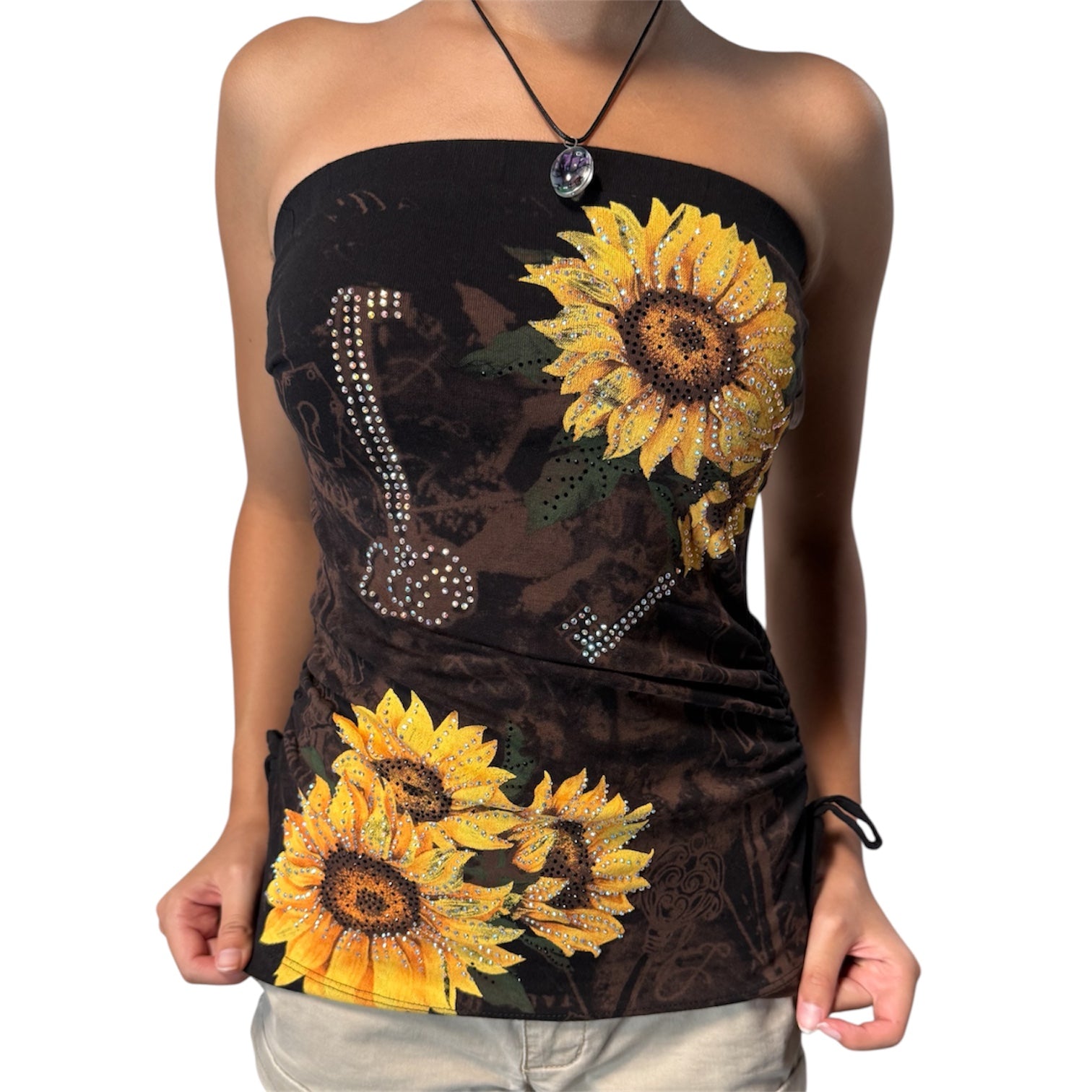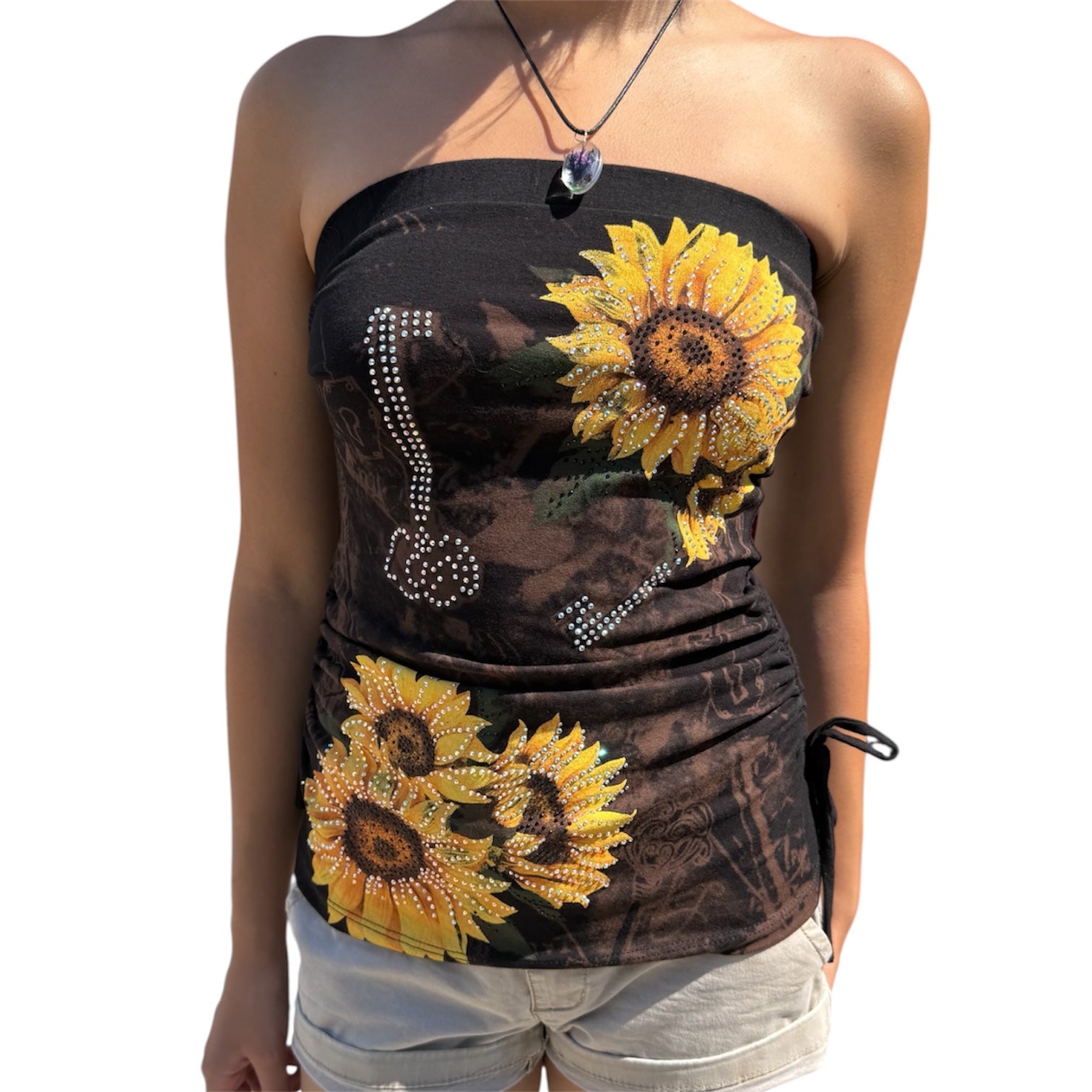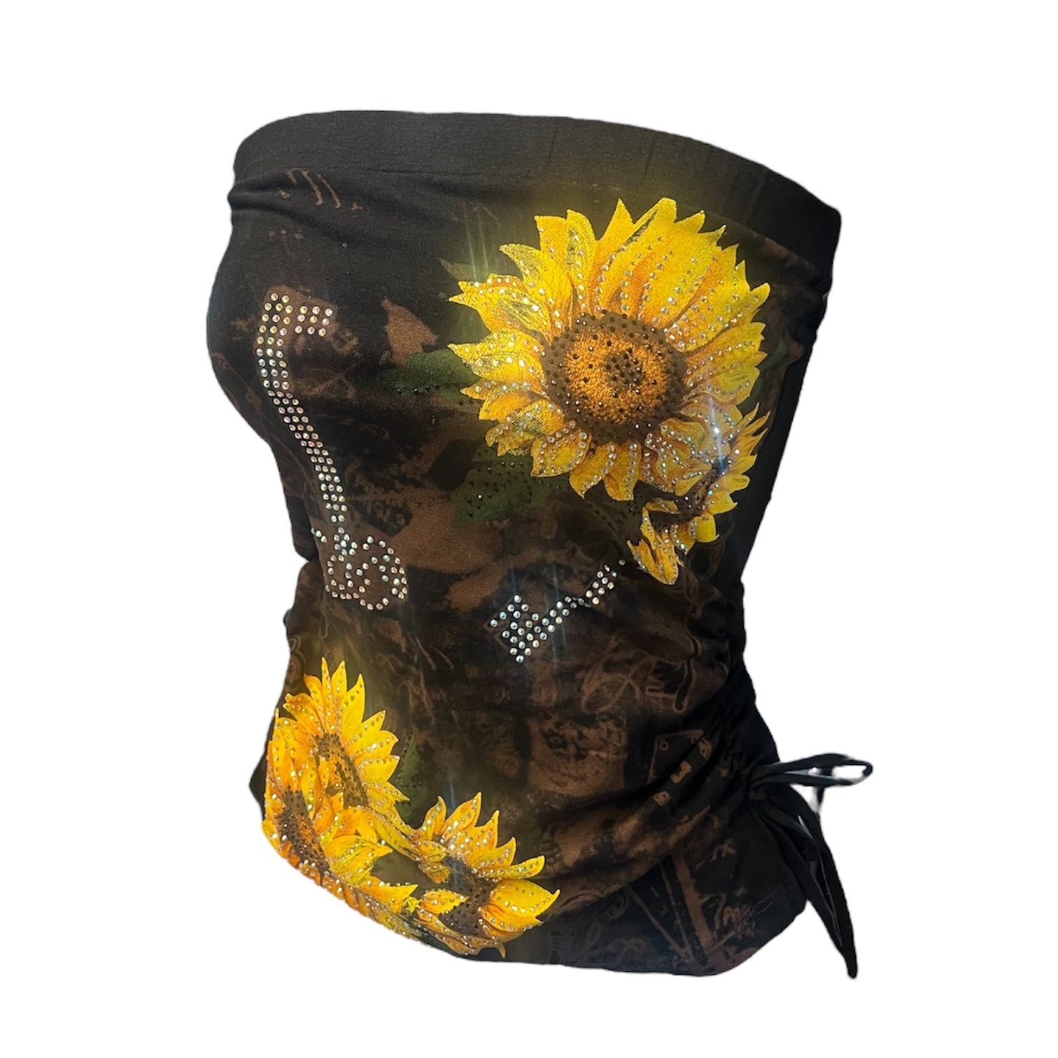 This beautiful sunflower tube top is embellished with rhinestones all over the front. It is perfect for the hot summer weather and is very comfortable to wear. It is size inclusive as this top ranges from XS-3XL!