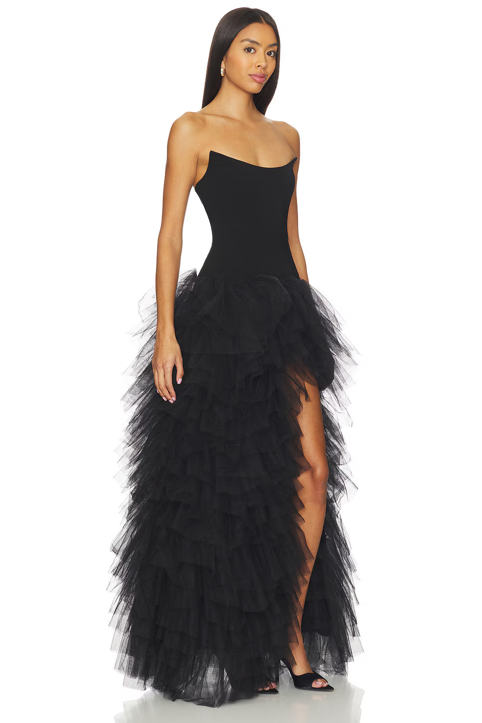 A strapless silhouette with a cinched waist and layered tulle cake skirt. The dramatic high slit adds allure, creating a bold yet elegant evening statement.