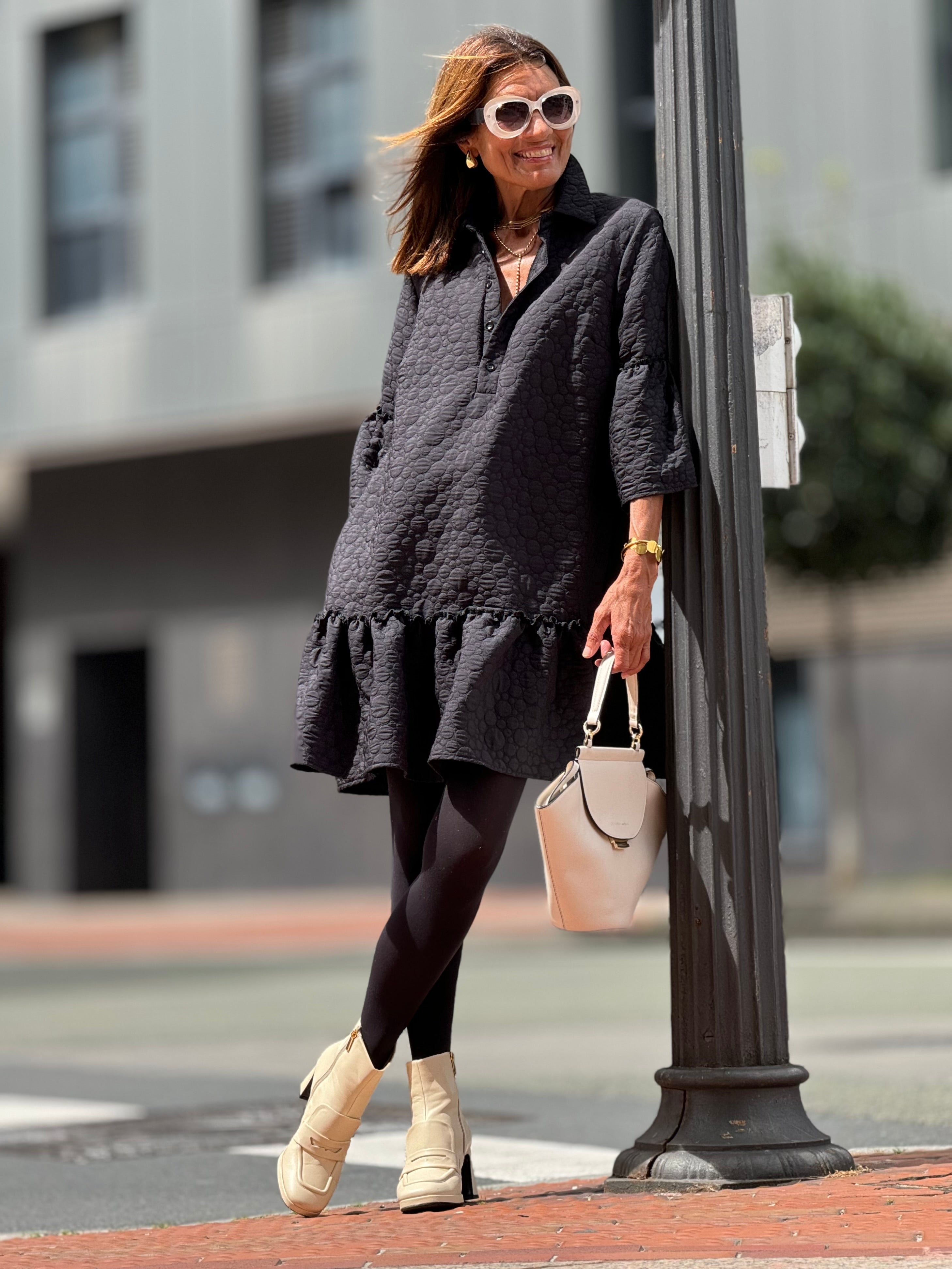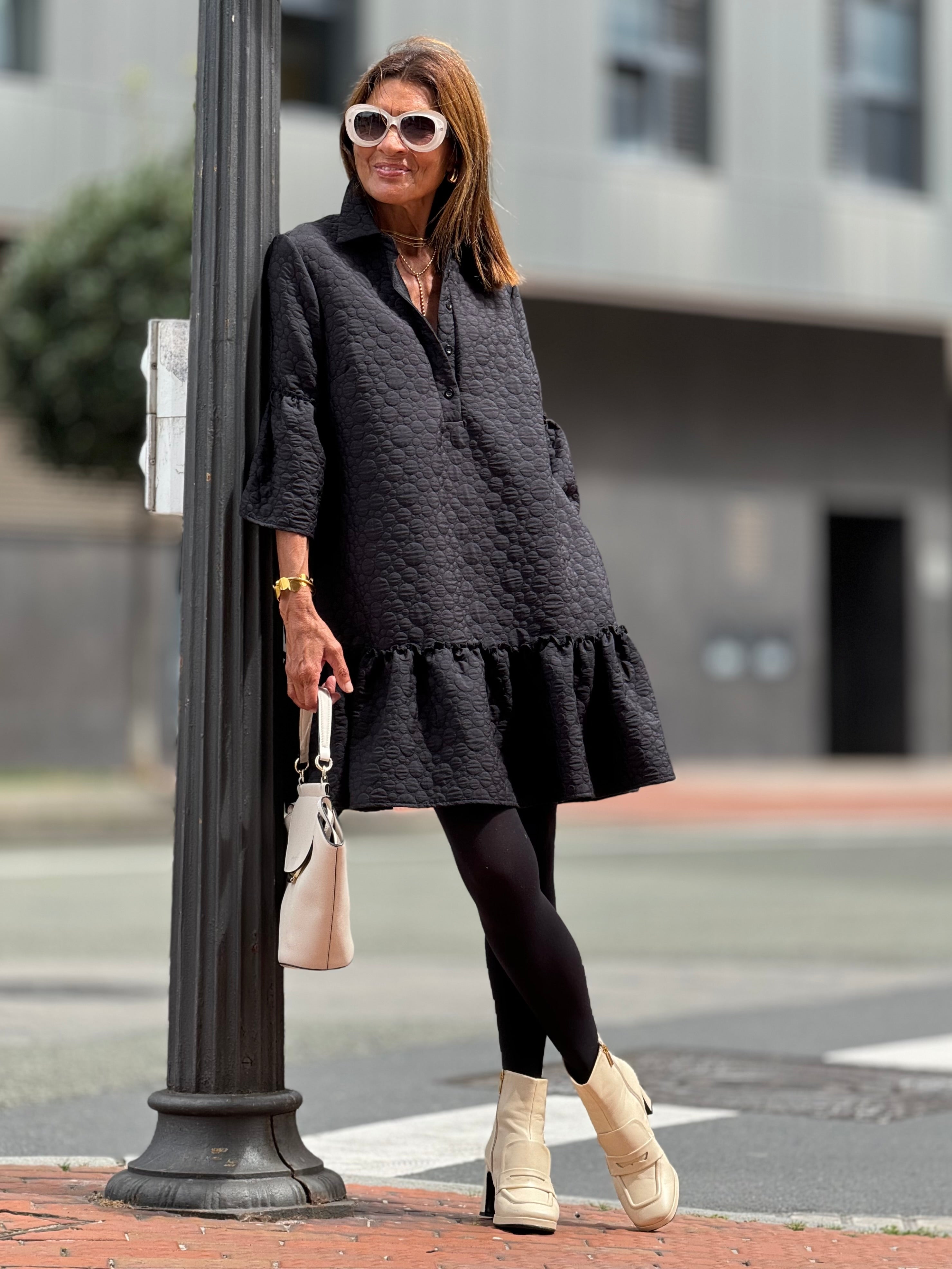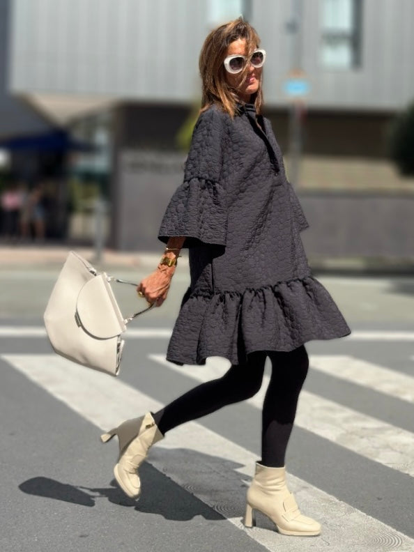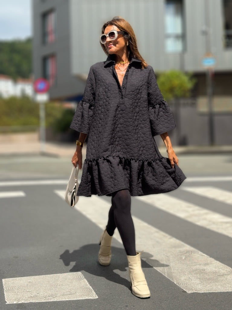 The Florentine Dress is a stunning and unique piece that will surely turn heads. This high-quality dress features a beautiful design, complete with a luxurious black special fabric for a touch of sophistication. Its relaxed fit ensures maximum comfort, making it perfect for any special occasion, whether it be a fancy event or just to make a statement. Look your best and make an impression with the Florentine Dress. Dress Florentine Bubble Black has side pockets. Length 91 cm/ 35.8 inch.