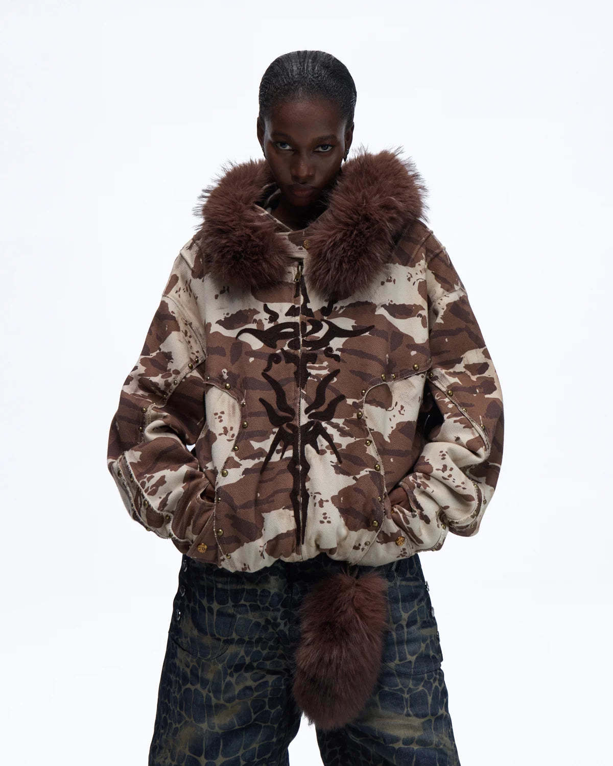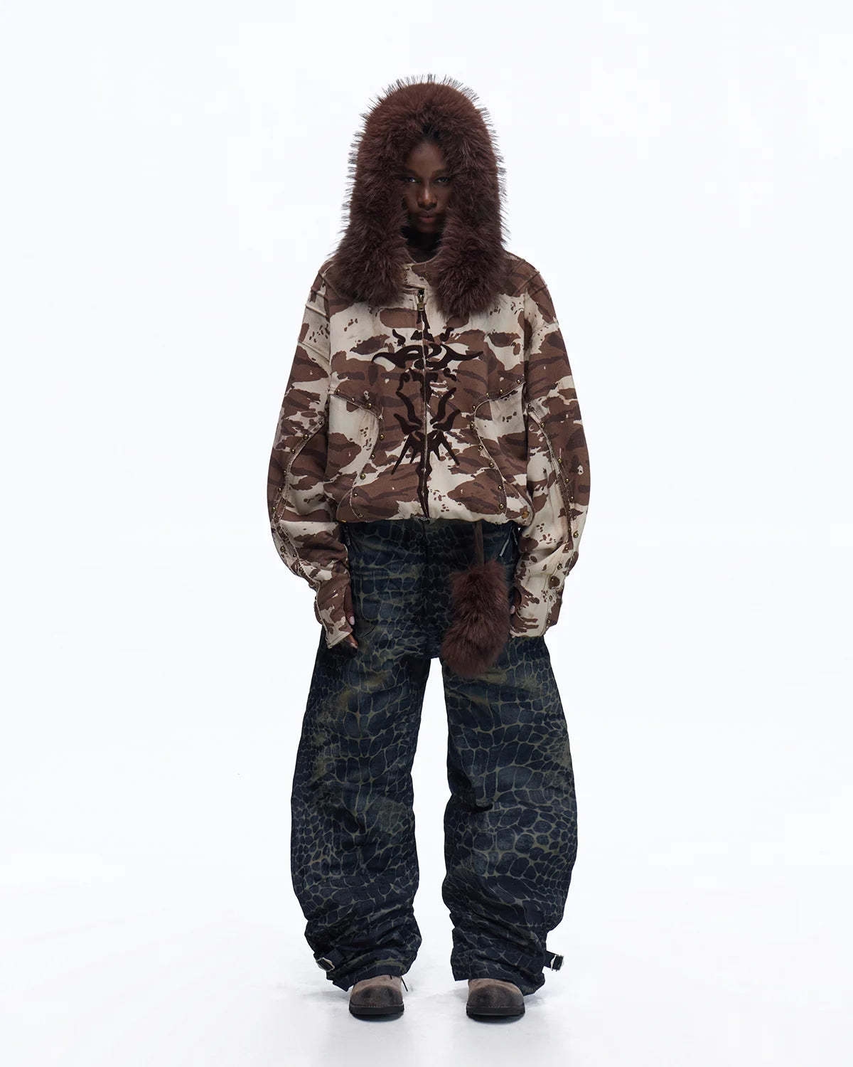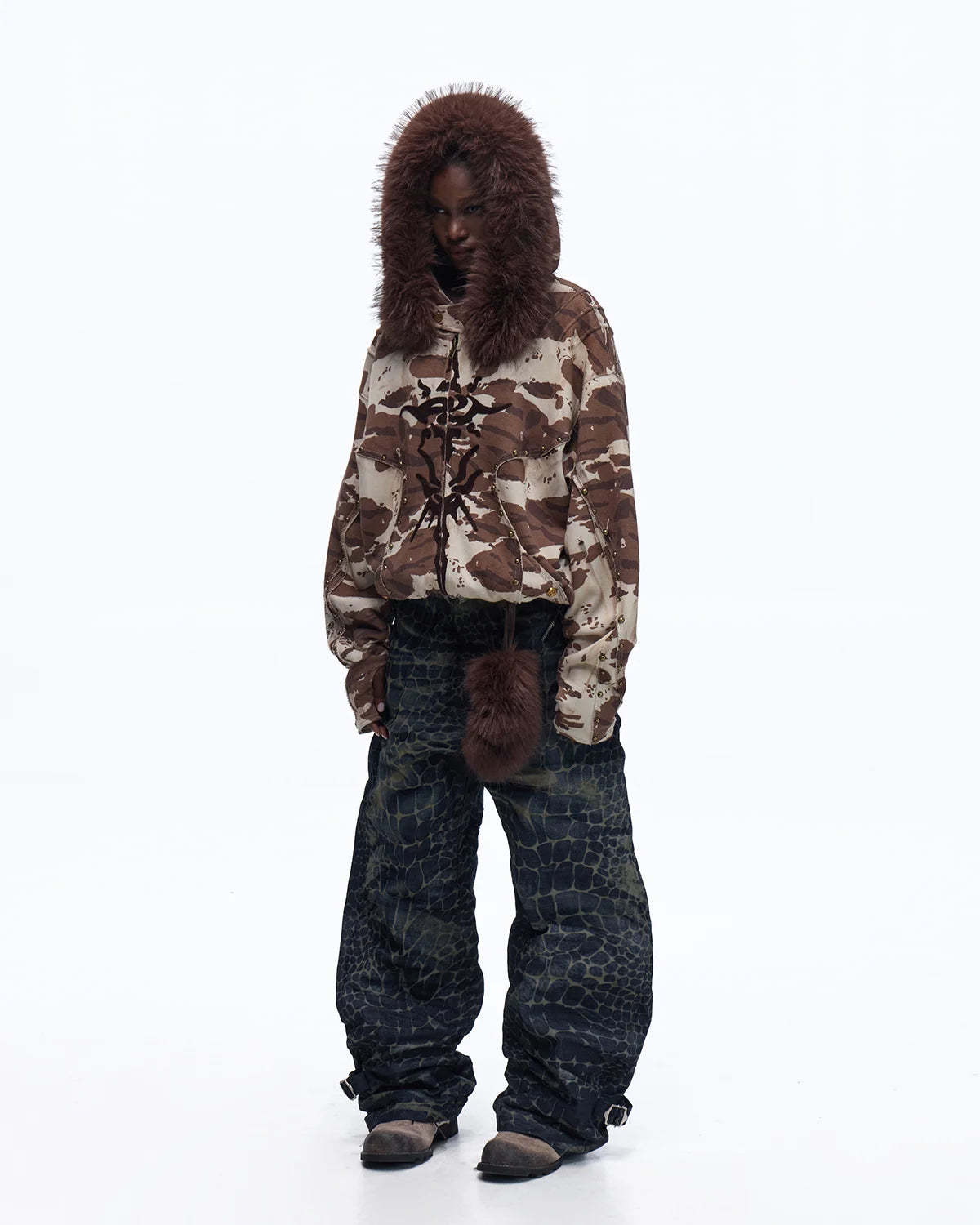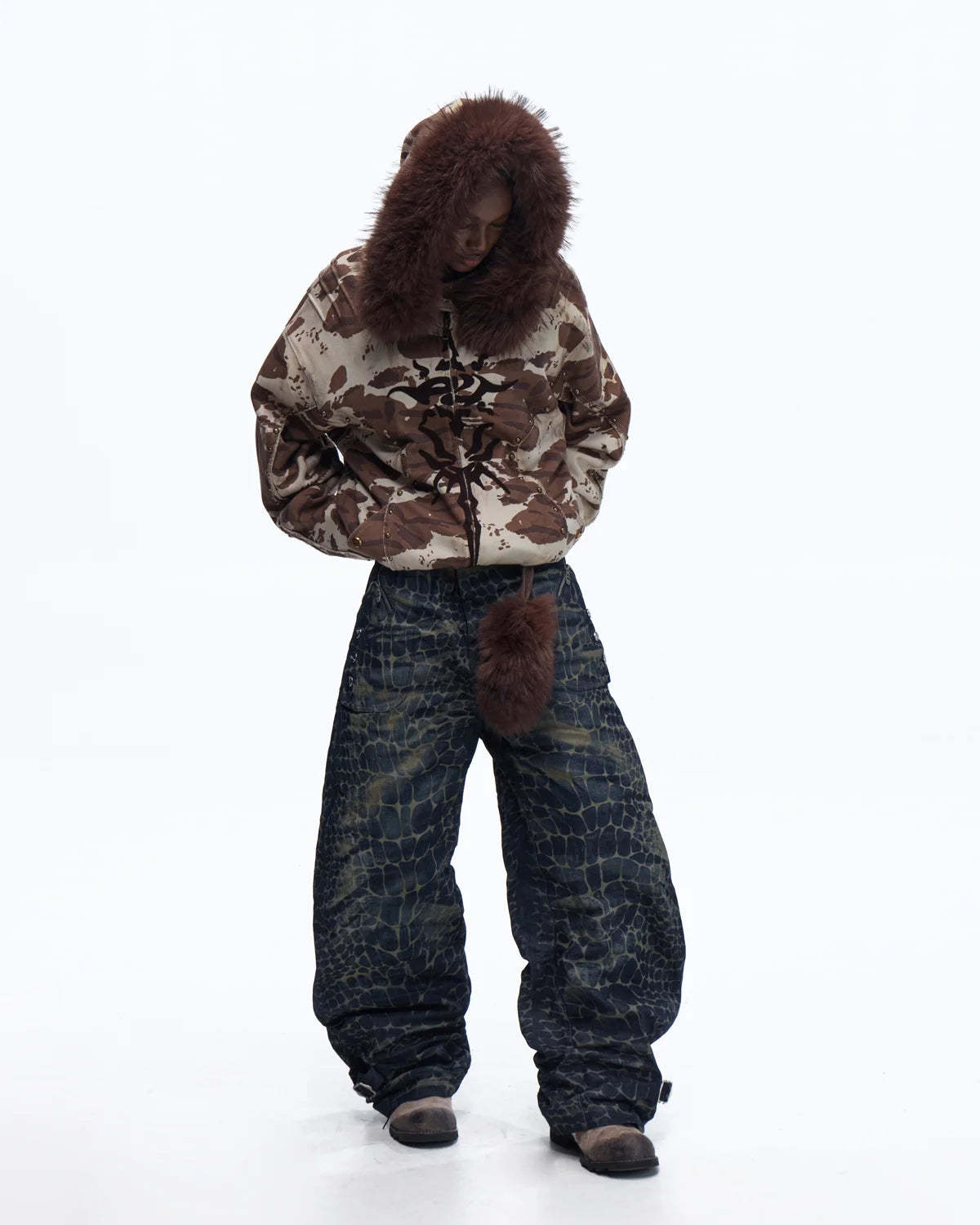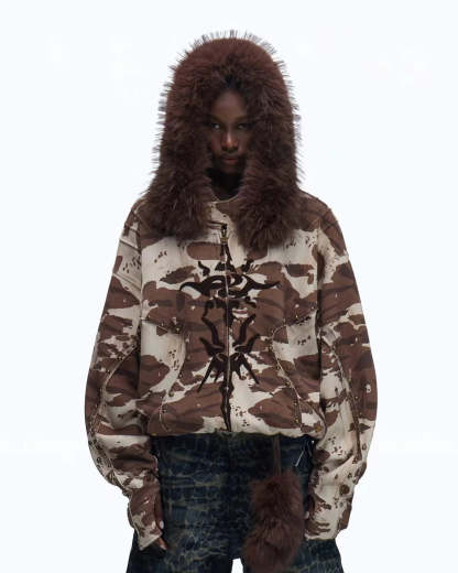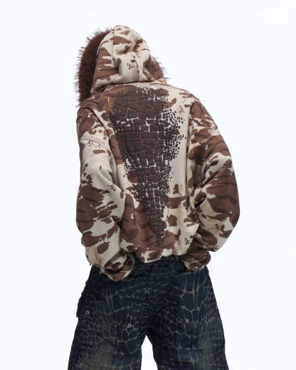 Personsoul Animal Print Hoodie with Fur-Lined Hood