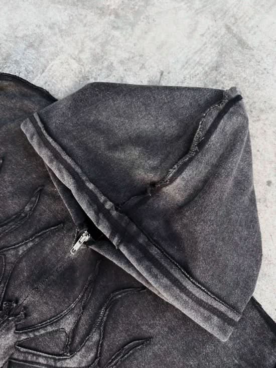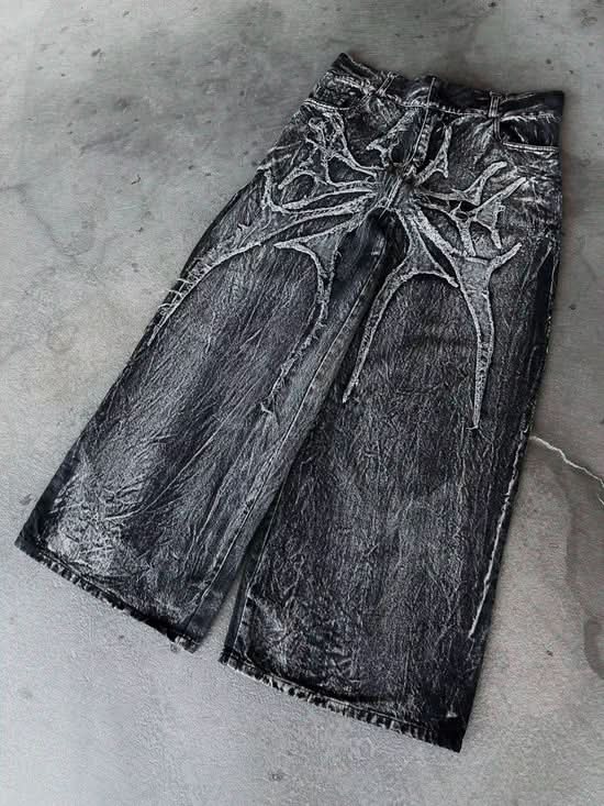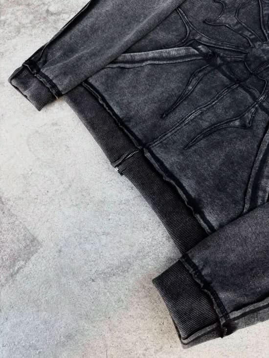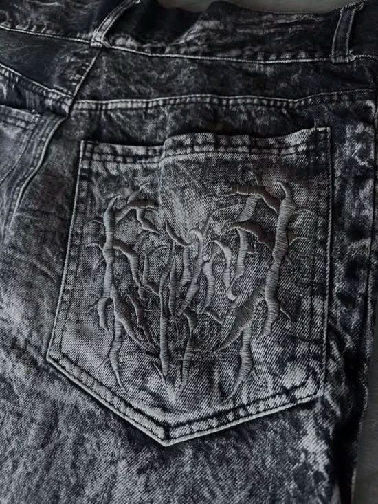 • Jeans: Embroidered spider patch (front), logo on back pocket, custom woven label