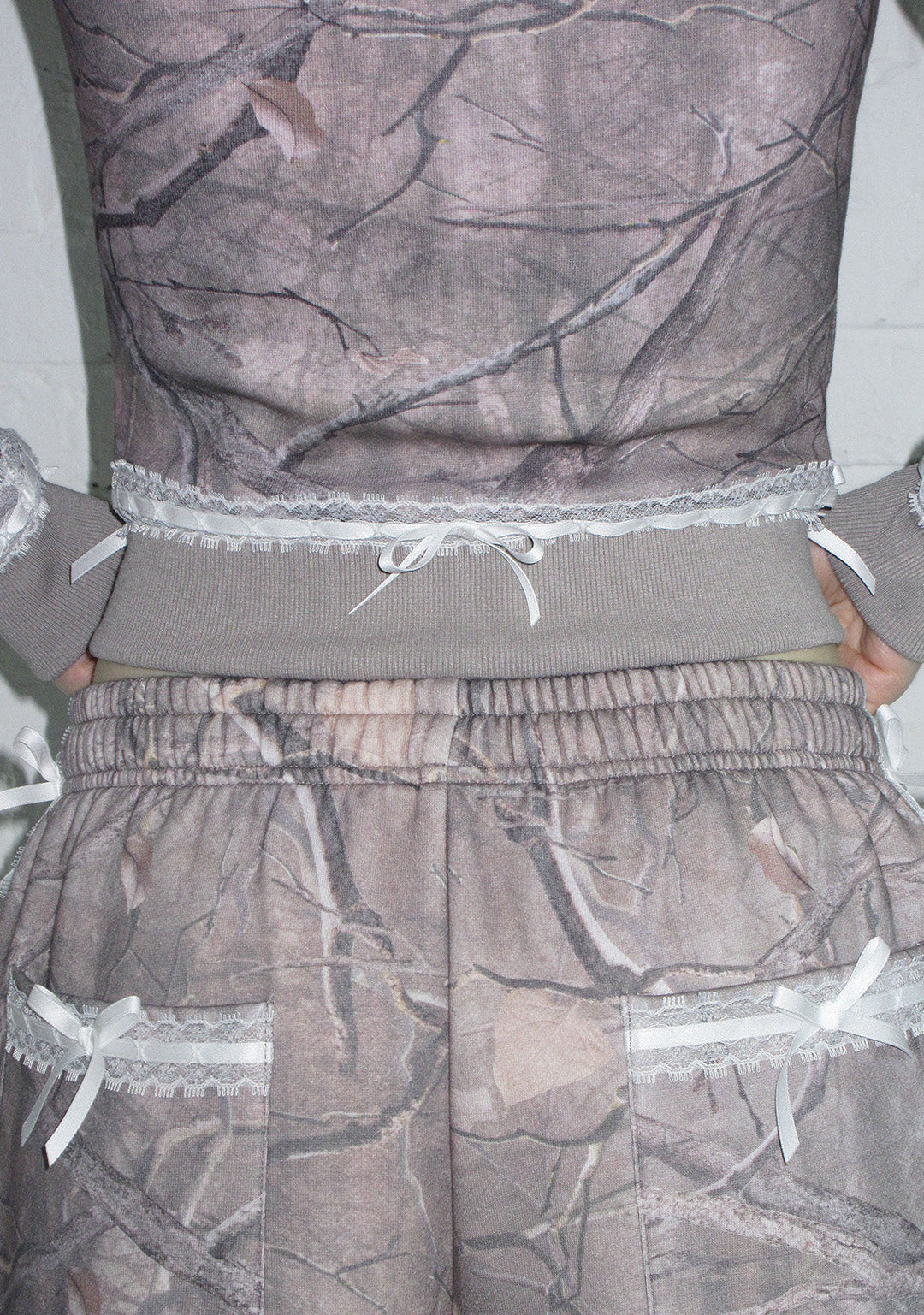★ Embellished with white layered lace trim and bow detailing along the seams