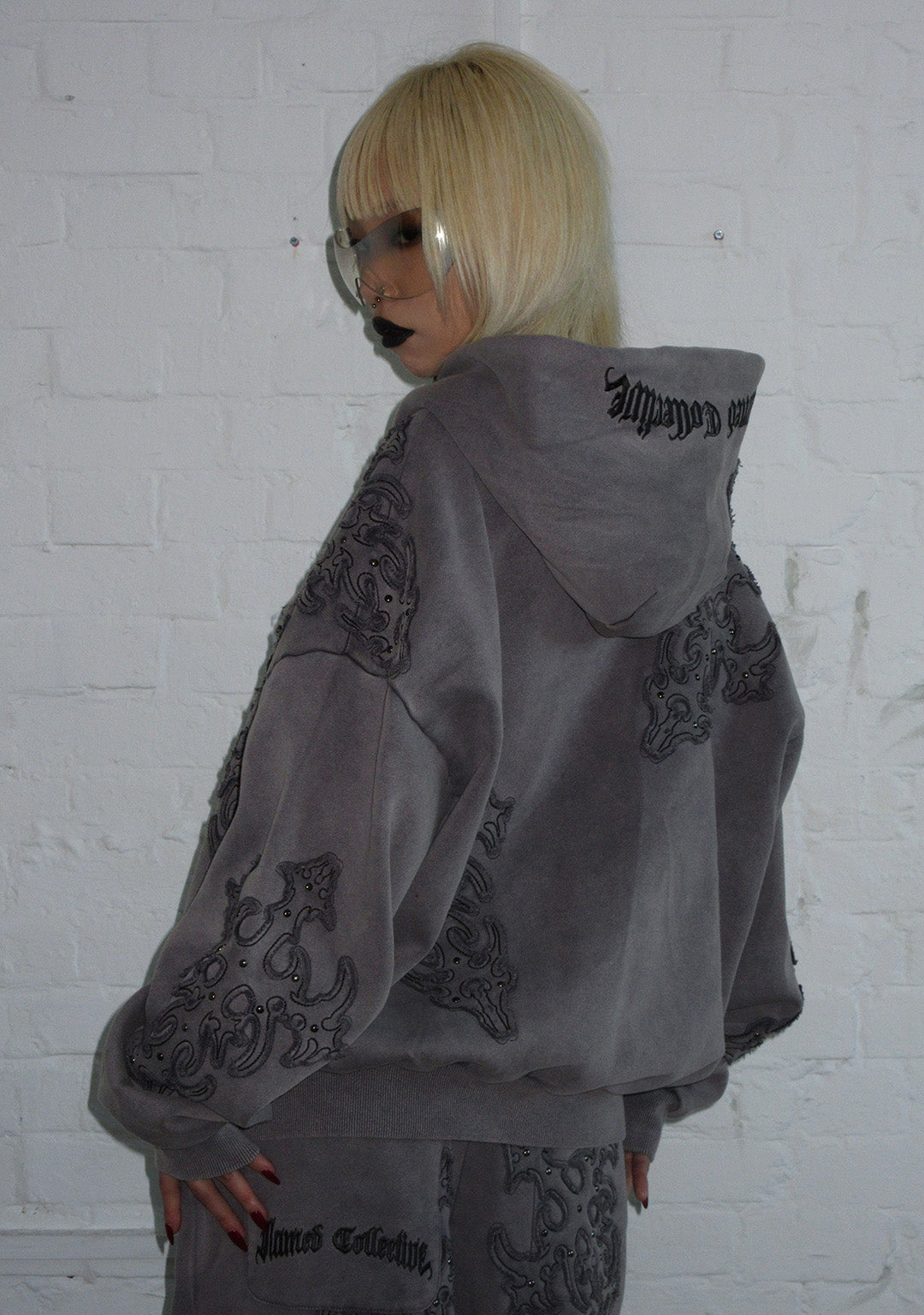 SINNER STUDDED ZIP HOODIE GREY VINTAGE WASH