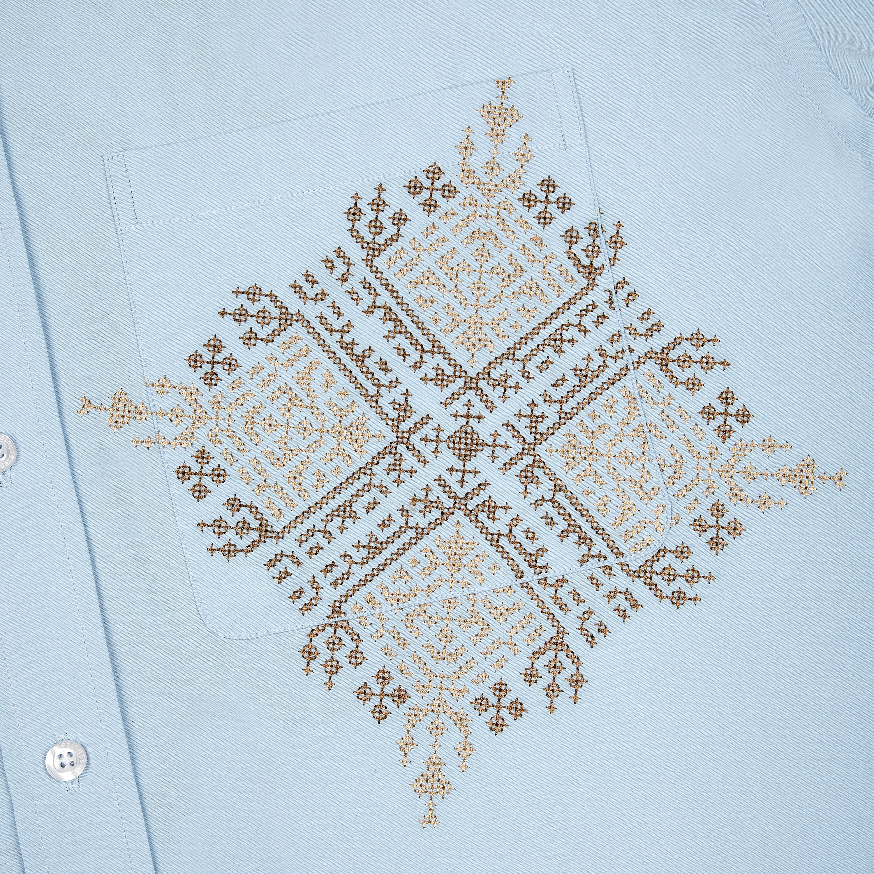poplin fabric / 100% cotton / embroidery on front and back / custom buttons / curved hem / relaxed fit / fits true to size