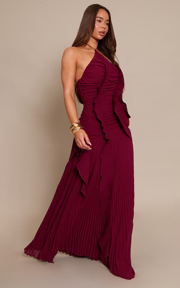 Romantic with a bold edge. This halter maxi dress features cascading ruffle details and soft ruching that flatter the waist, perfect for elevated evenings and special occasions.