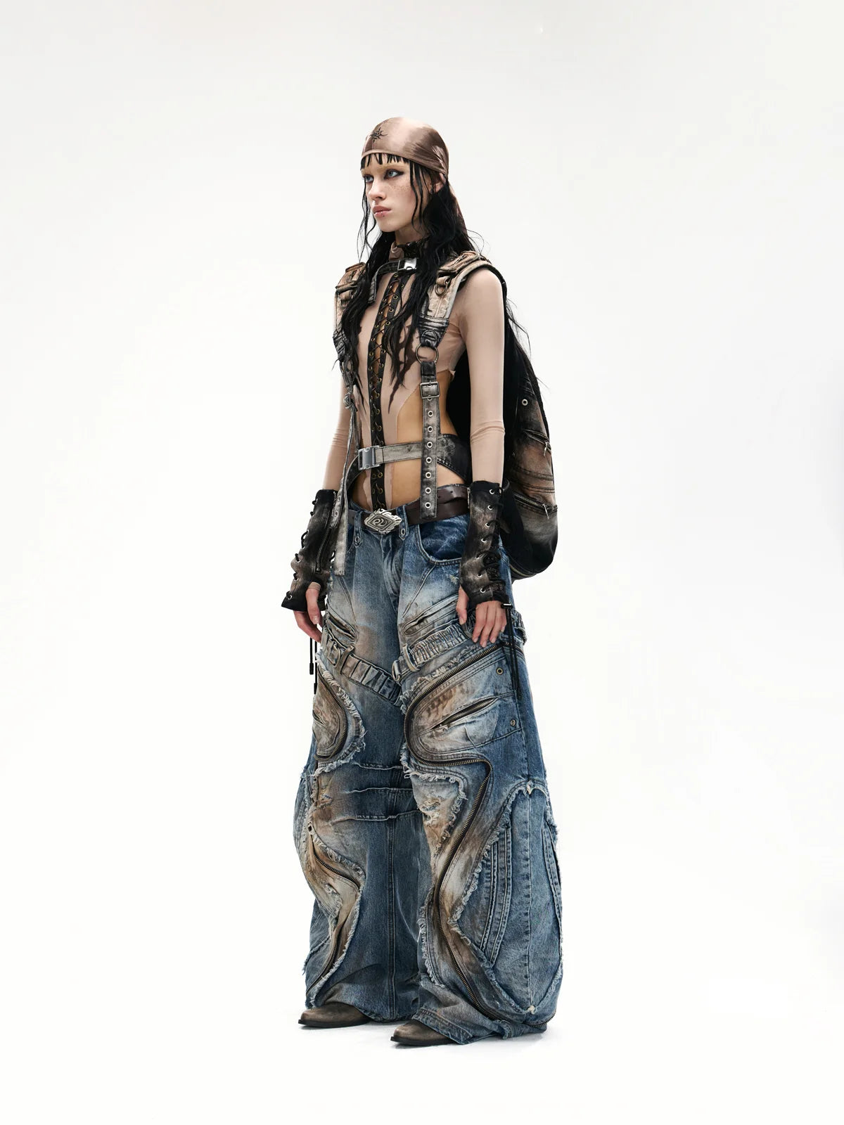 Curved Blade Pleated Jeans with Distressed Wash
