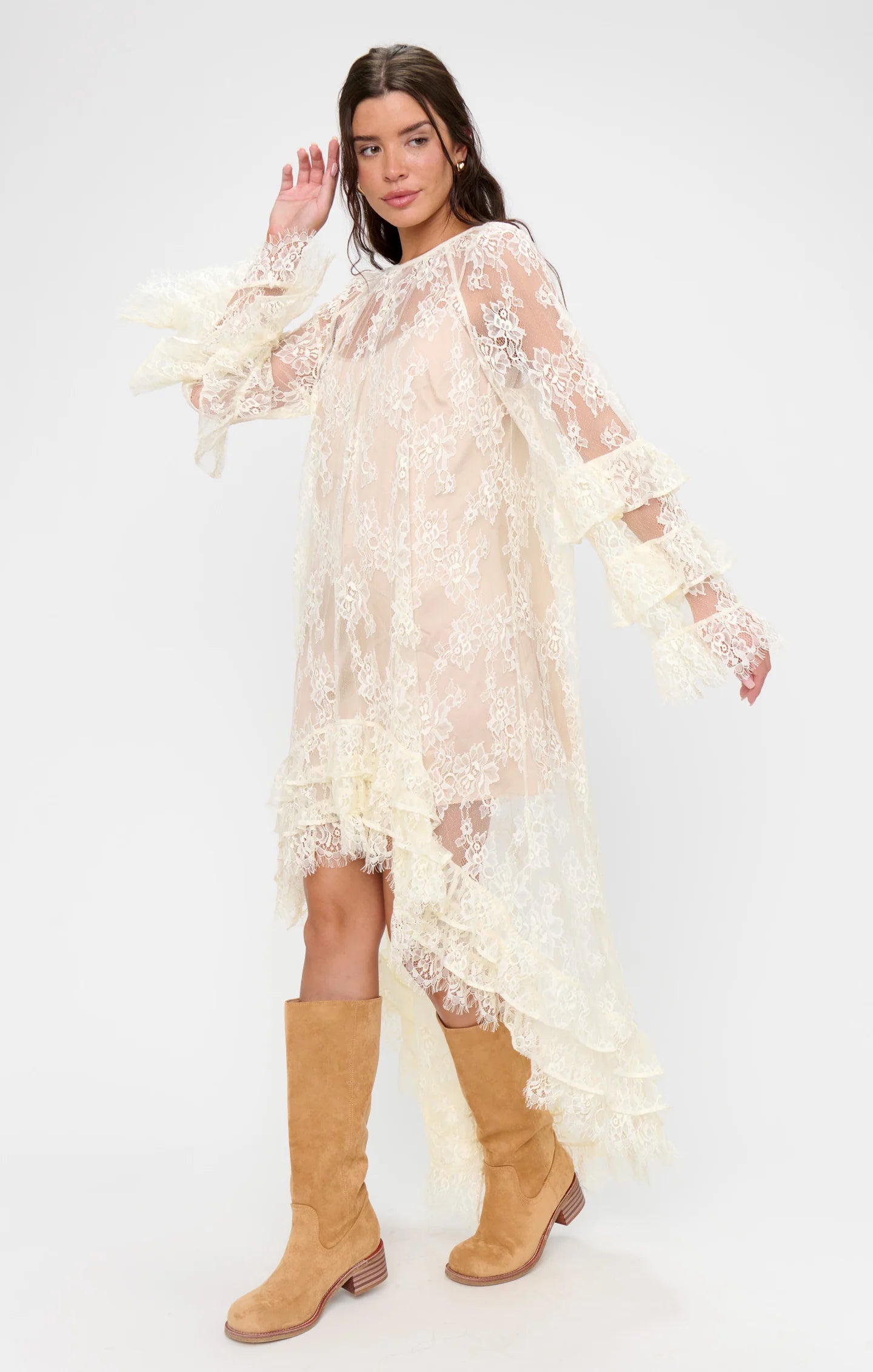 All eyes on lace in the Joelle Maxi! This romantic beauty features sheer lace, soft ruffle details, and a flowy high-low hem that moves with you. Finished with a built-in slip for just the right amount of coverage, it’s the perfect piece for making a sweeping entrance!