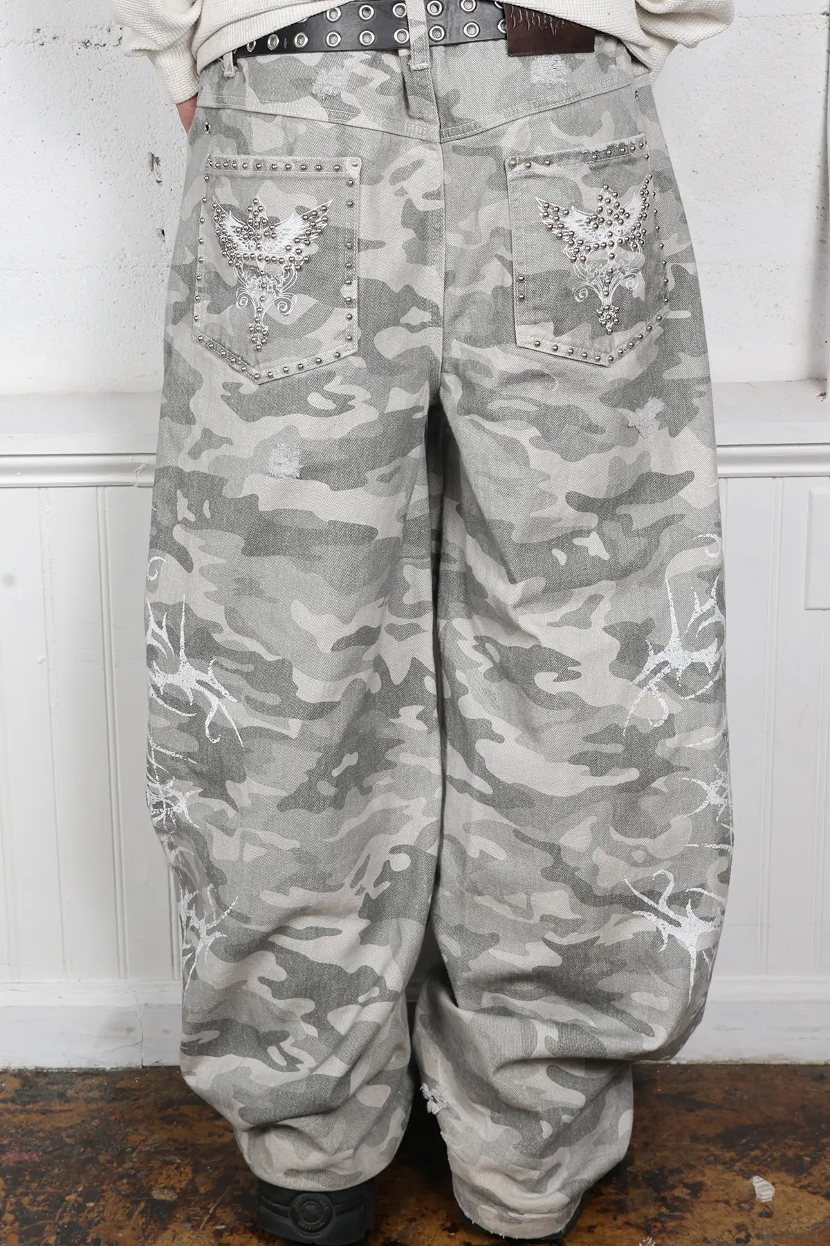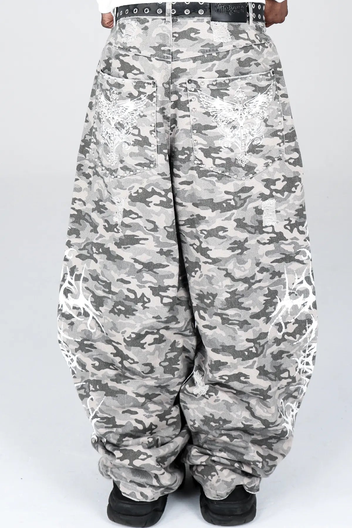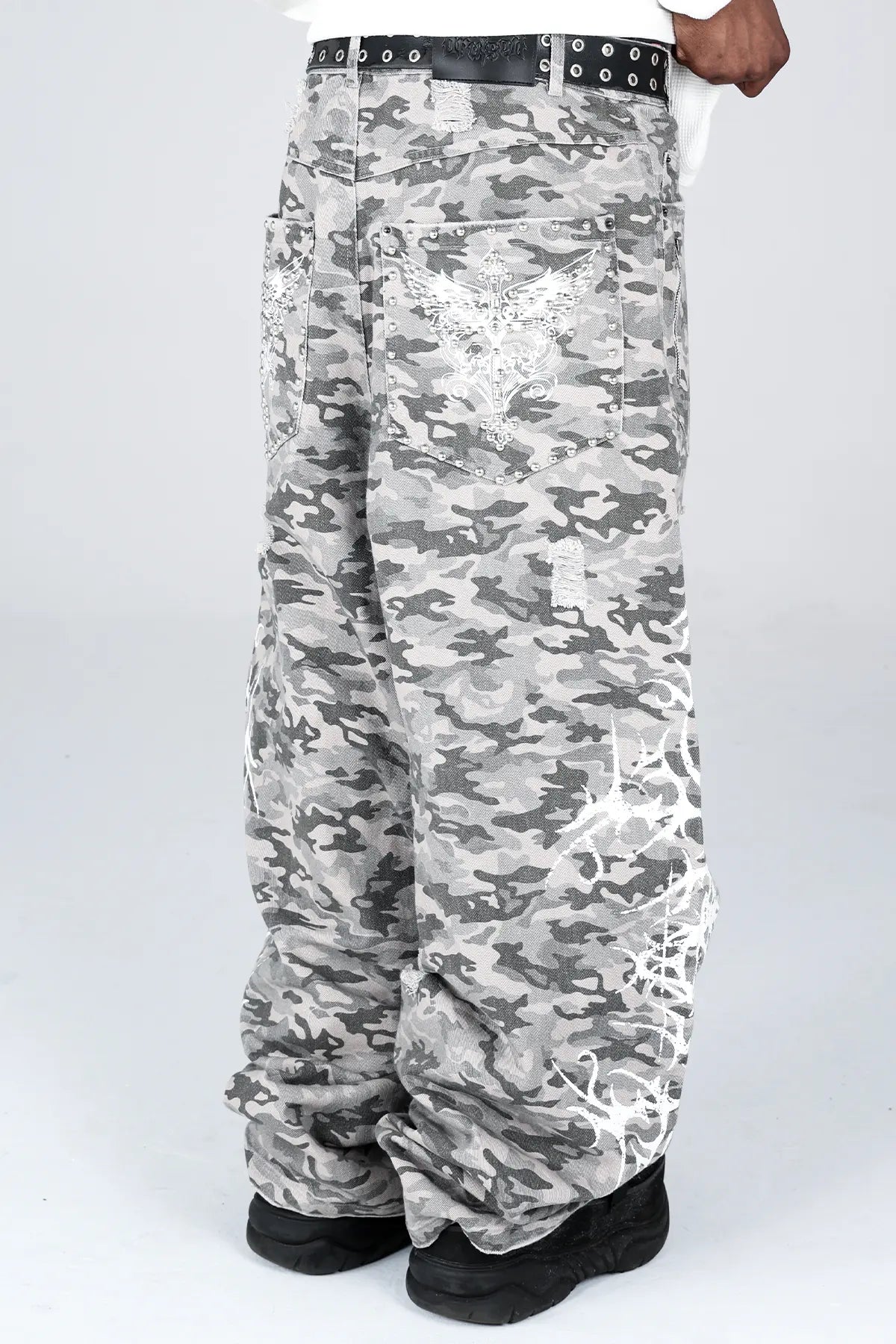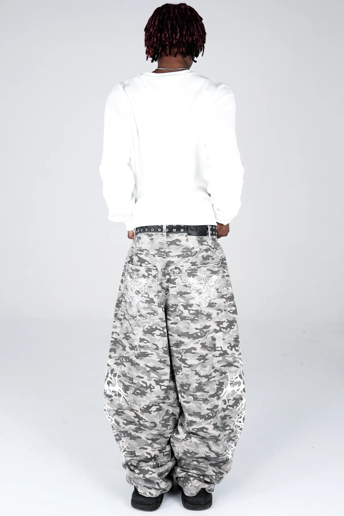 These mid-weight camouflage jeans are crafted for durability and everyday comfort, with premium cotton that feels great and lasts. Designed with a relaxed, baggy fit & a wide leg opening, they’re made to move with you. Finished with pocket gems, and a screenprint that'll last life's roughest moments.