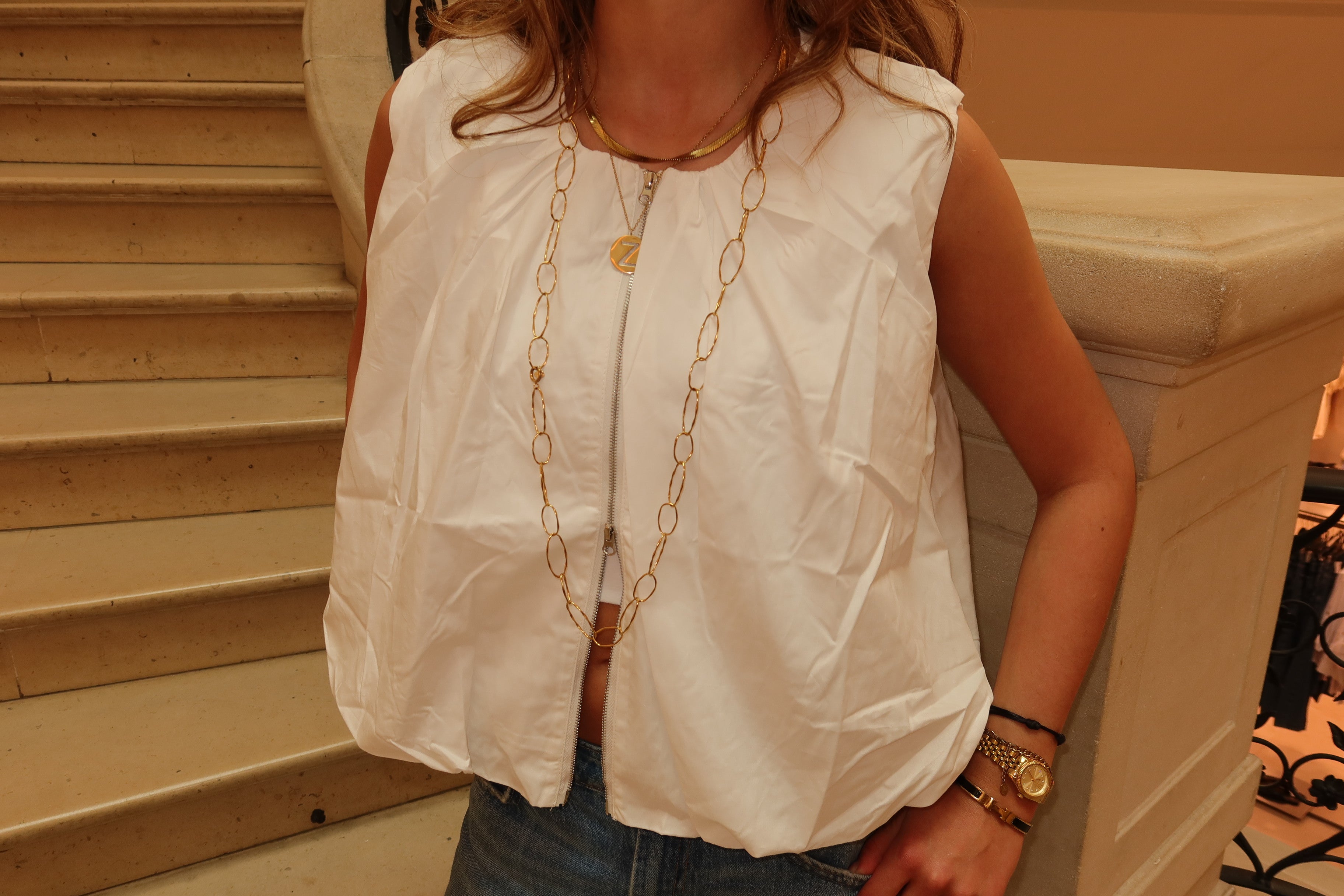 Modern statement blouse in crisp white with a front zip closure and sculptural, voluminous shape. The structured yet lightweight fabric and gathered neckline create a bold, contemporary silhouette. Perfect to elevate minimalist outfits with an architectural touch.