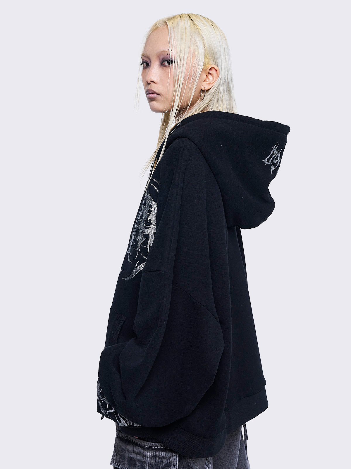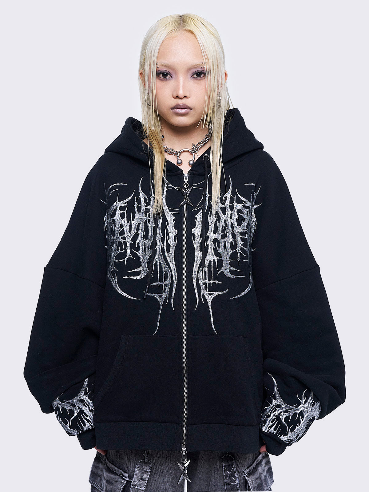 - Grey sigilism embroidery on front and sleeves