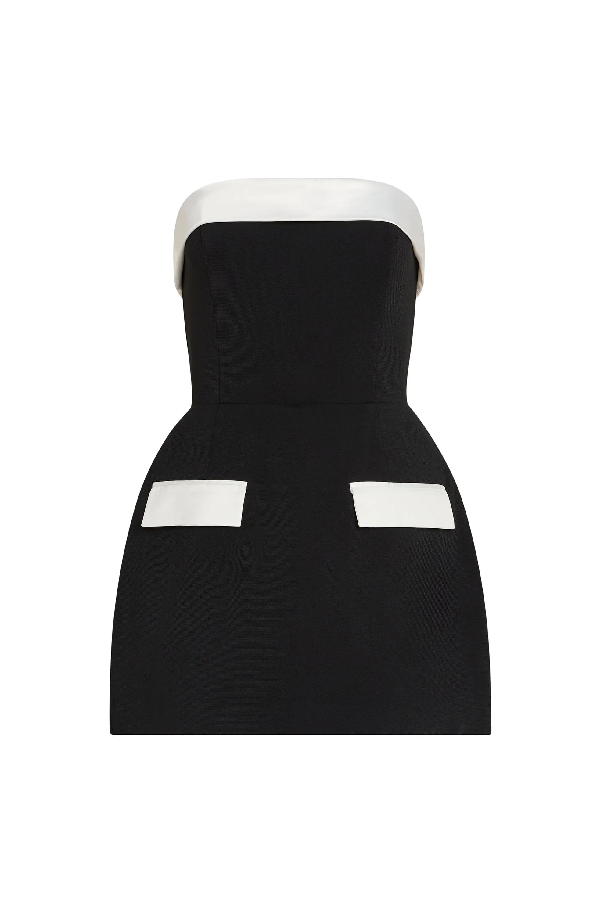 A bold strapless mini dress featuring a white contrast bust, black flared skirt, and decorative contrast pockets on each side.