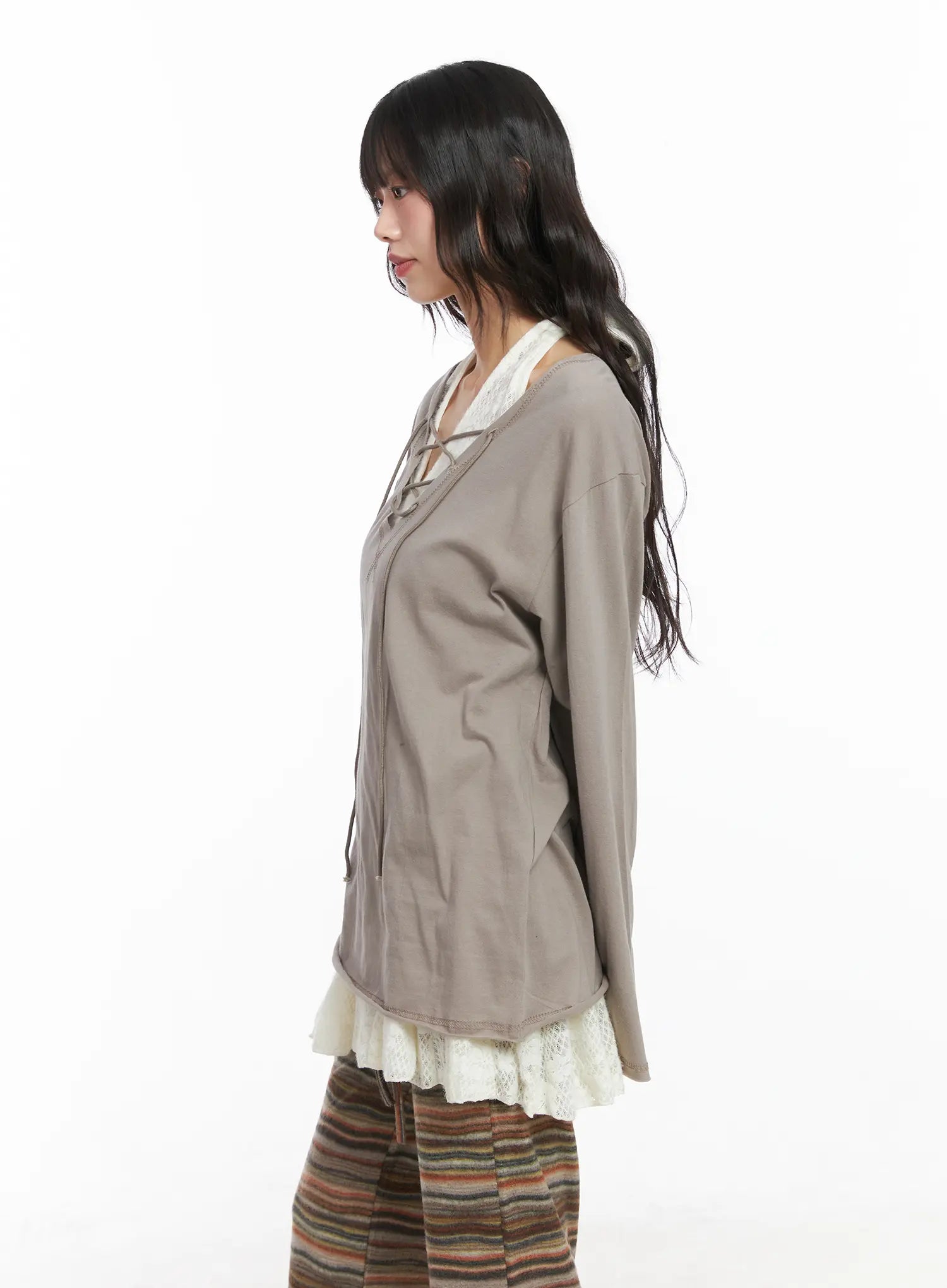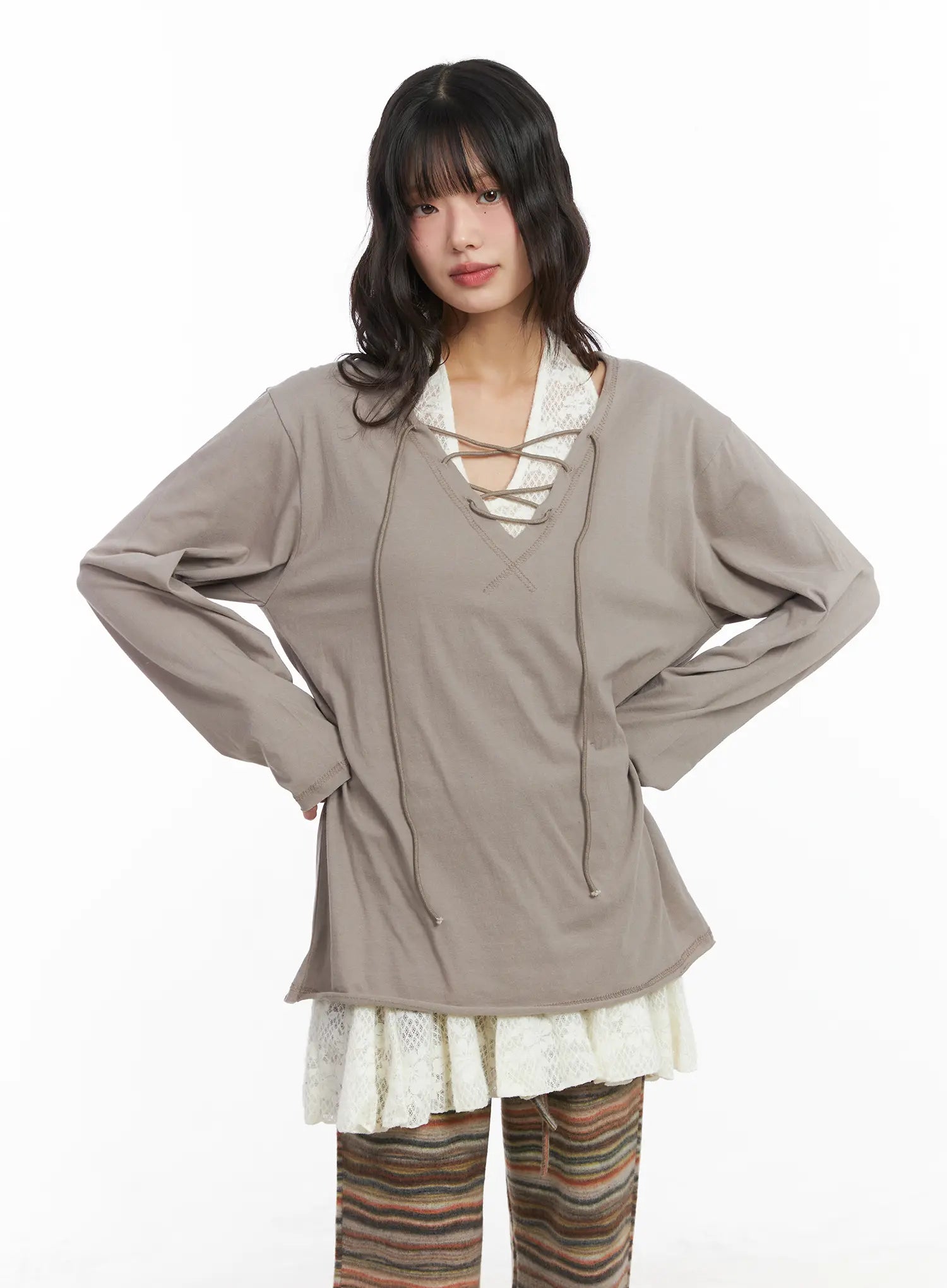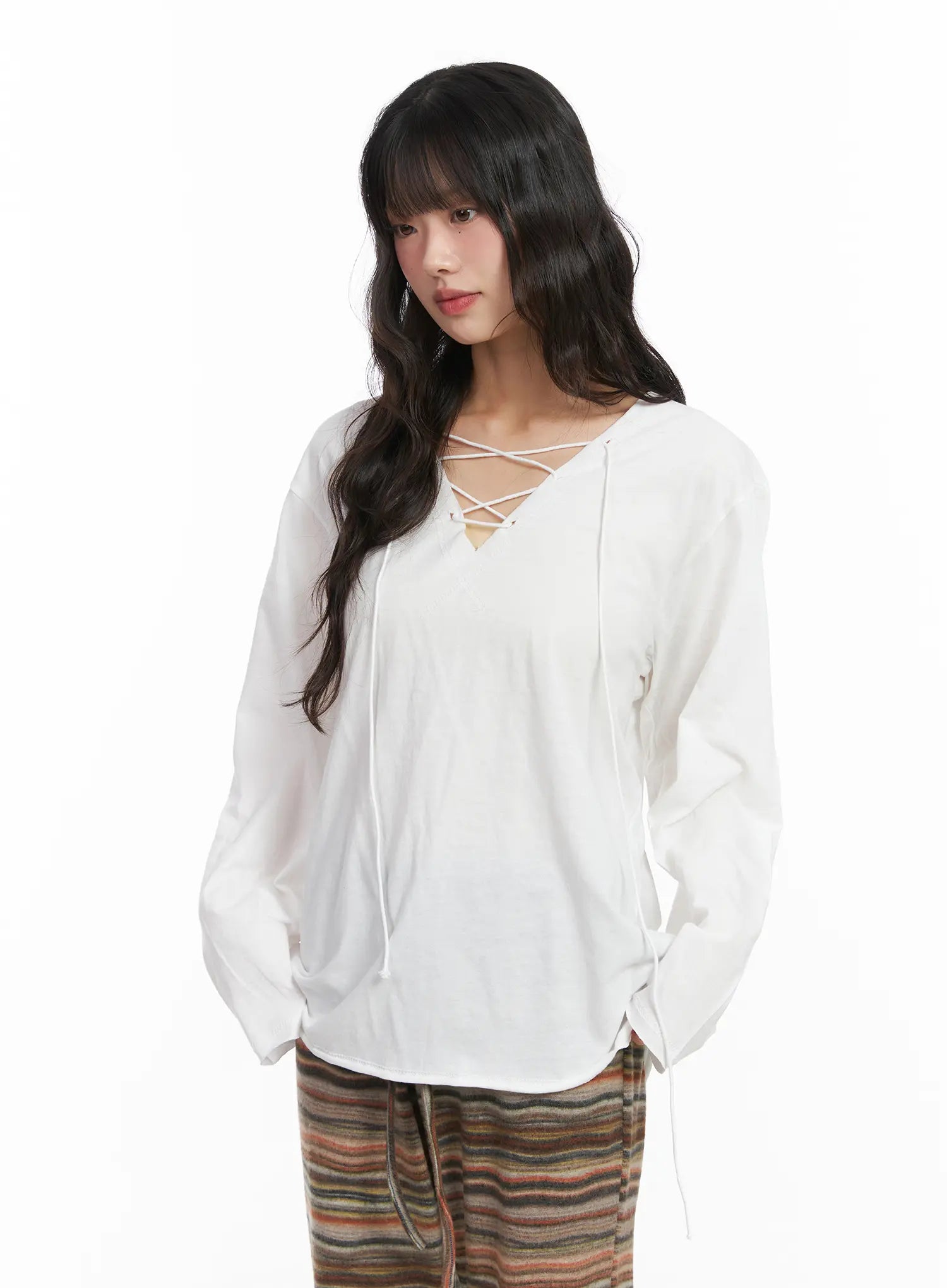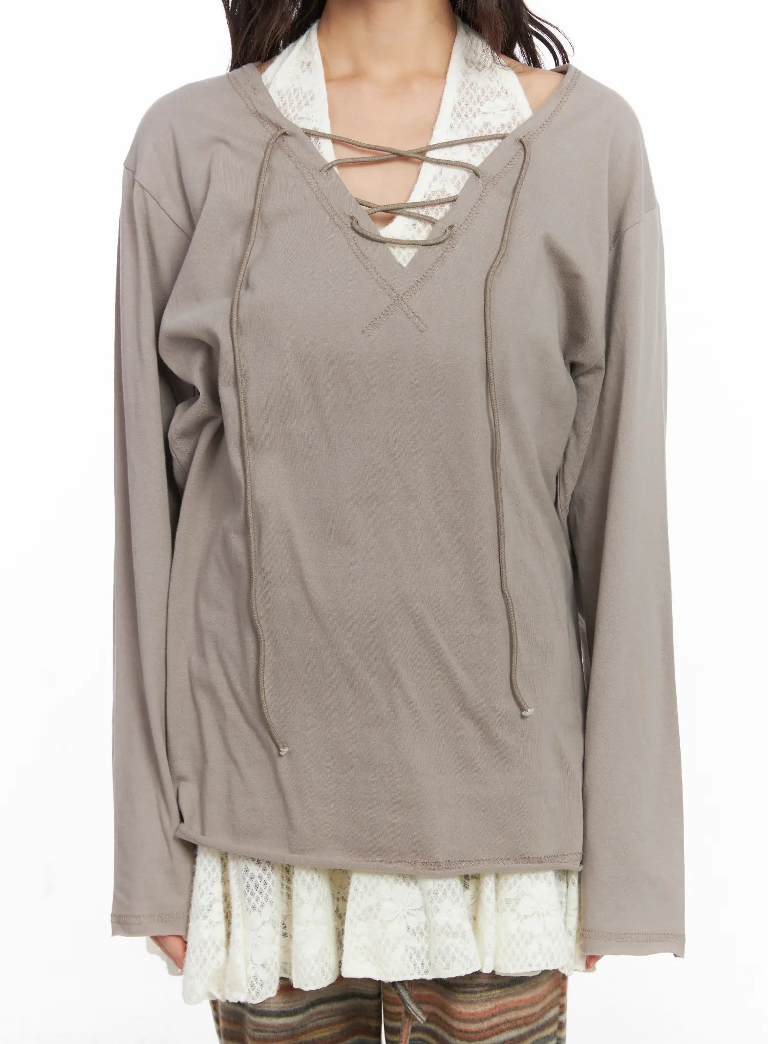 Style : Fairygrunge, BohemianOccasion : Festival, Back to schoolDetail : Lace upPrint : SolidMaterial : CottonSleeve : Long sleeveNeck : V neckFit : Loose fitCotton 100%Color : Beige, White, BlackModel Size