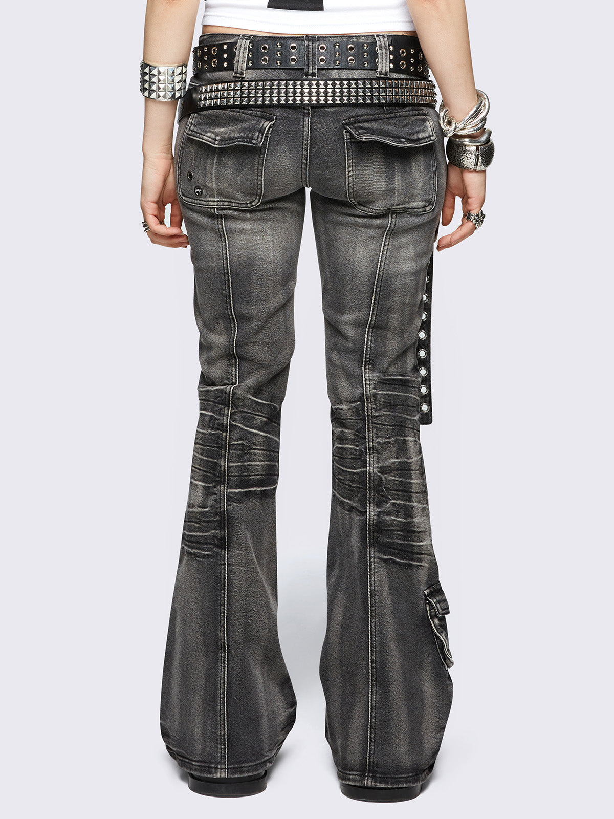 • Black washed cargo flare jeans