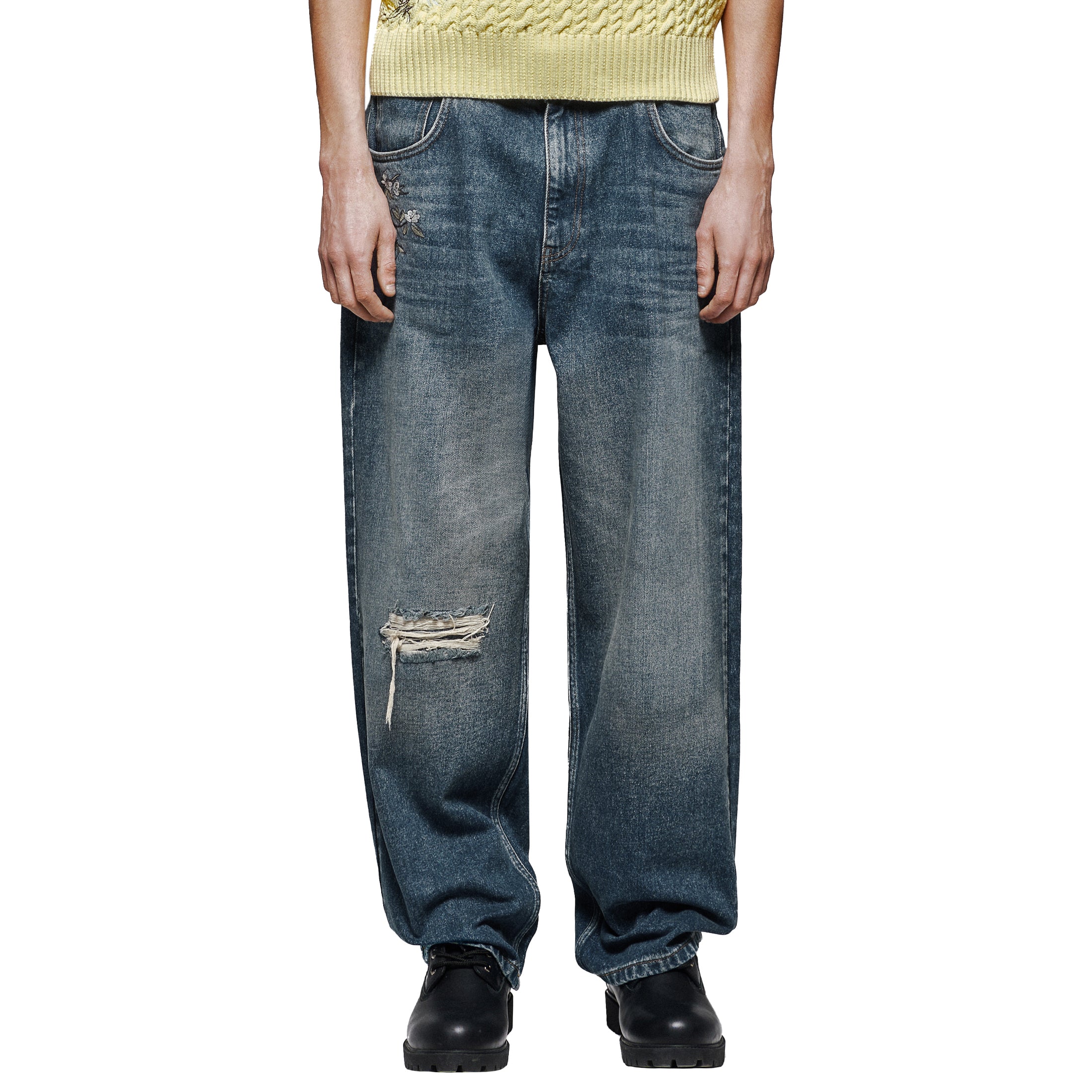 14,5oz denim / 100% cotton / embroidery on front and back / effect washing / distressing on front and back / custom button / baggy fit / fits true to size