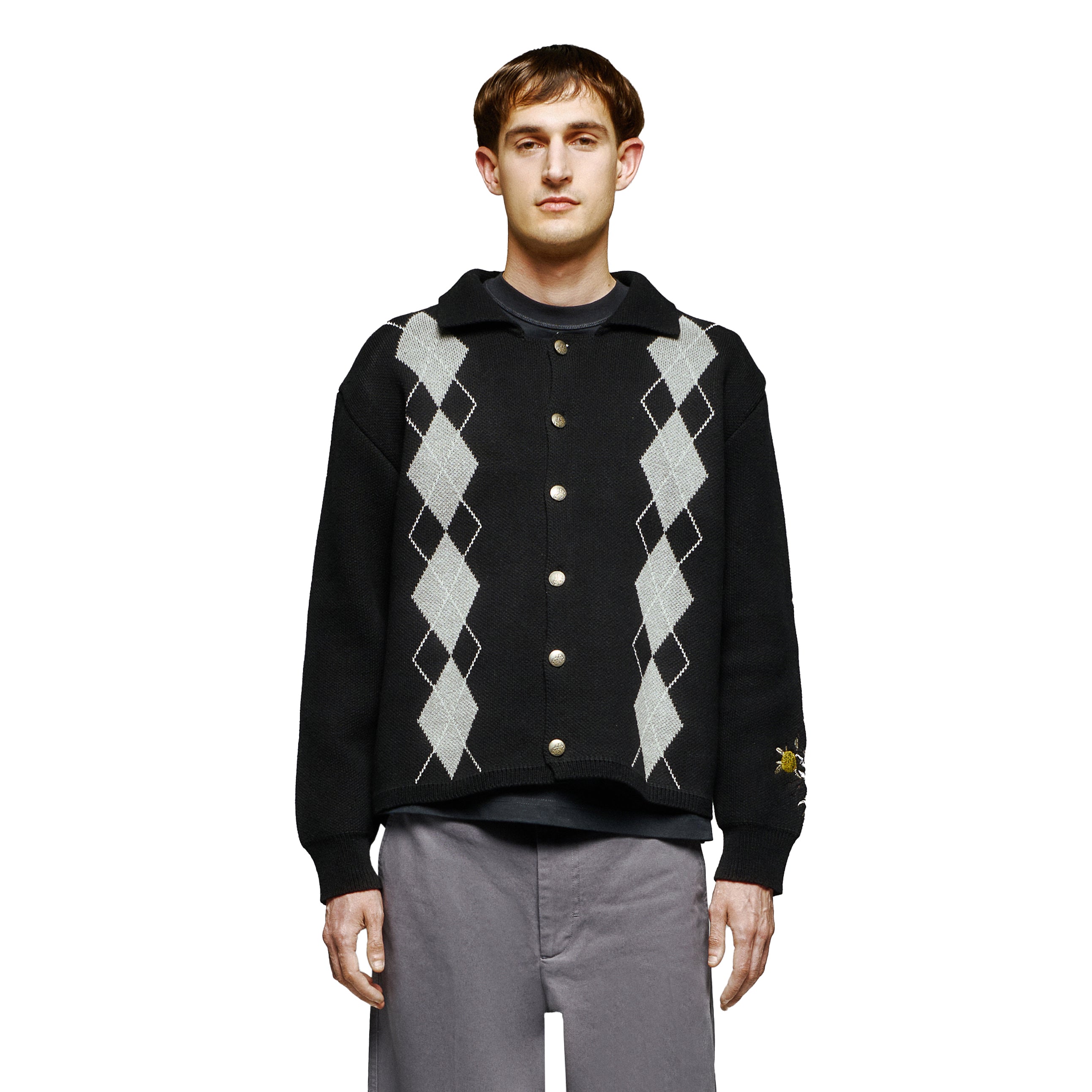 100% cotton / heavy weight knit / plaid pattern pique jacquard on front and back / embroidery on back and sleeve / custom buttons / fits true to size