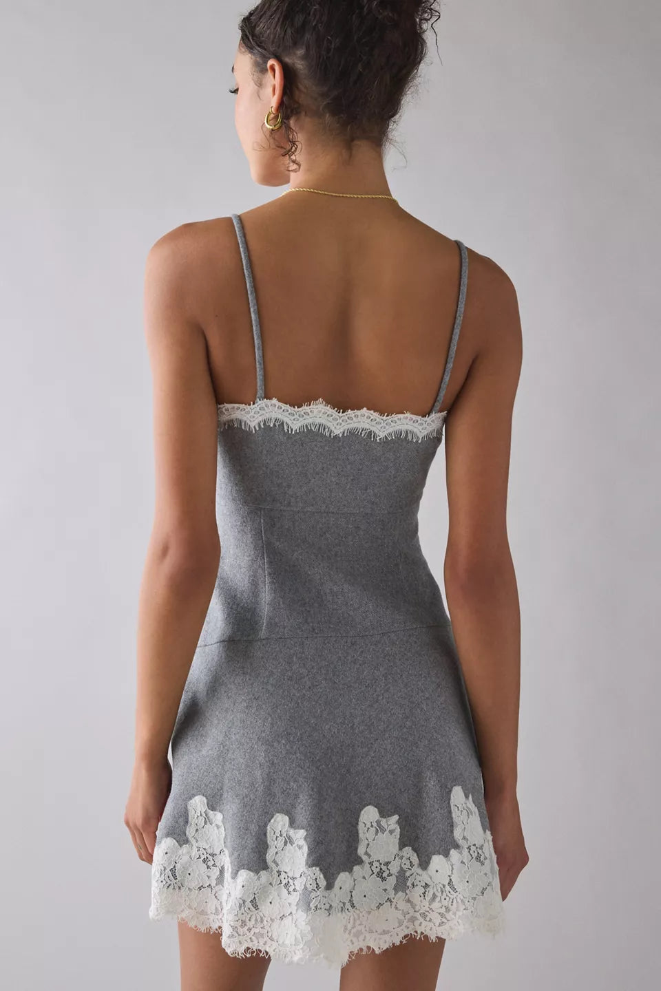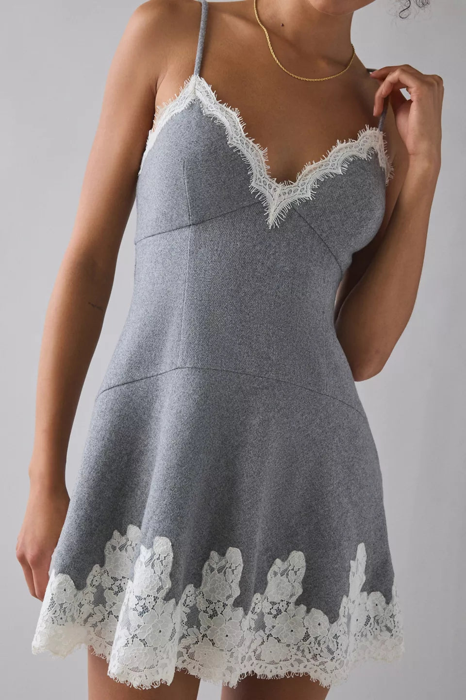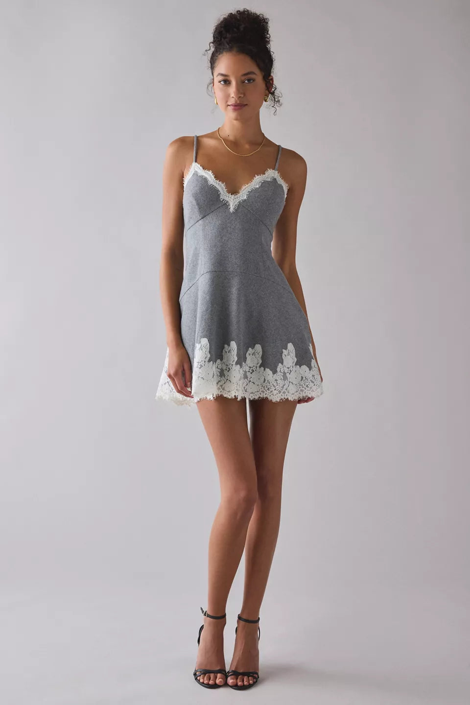 A soft grey cami mini dress with a cinched waist and A-line silhouette, finished with white lace trim at the bust and hem.