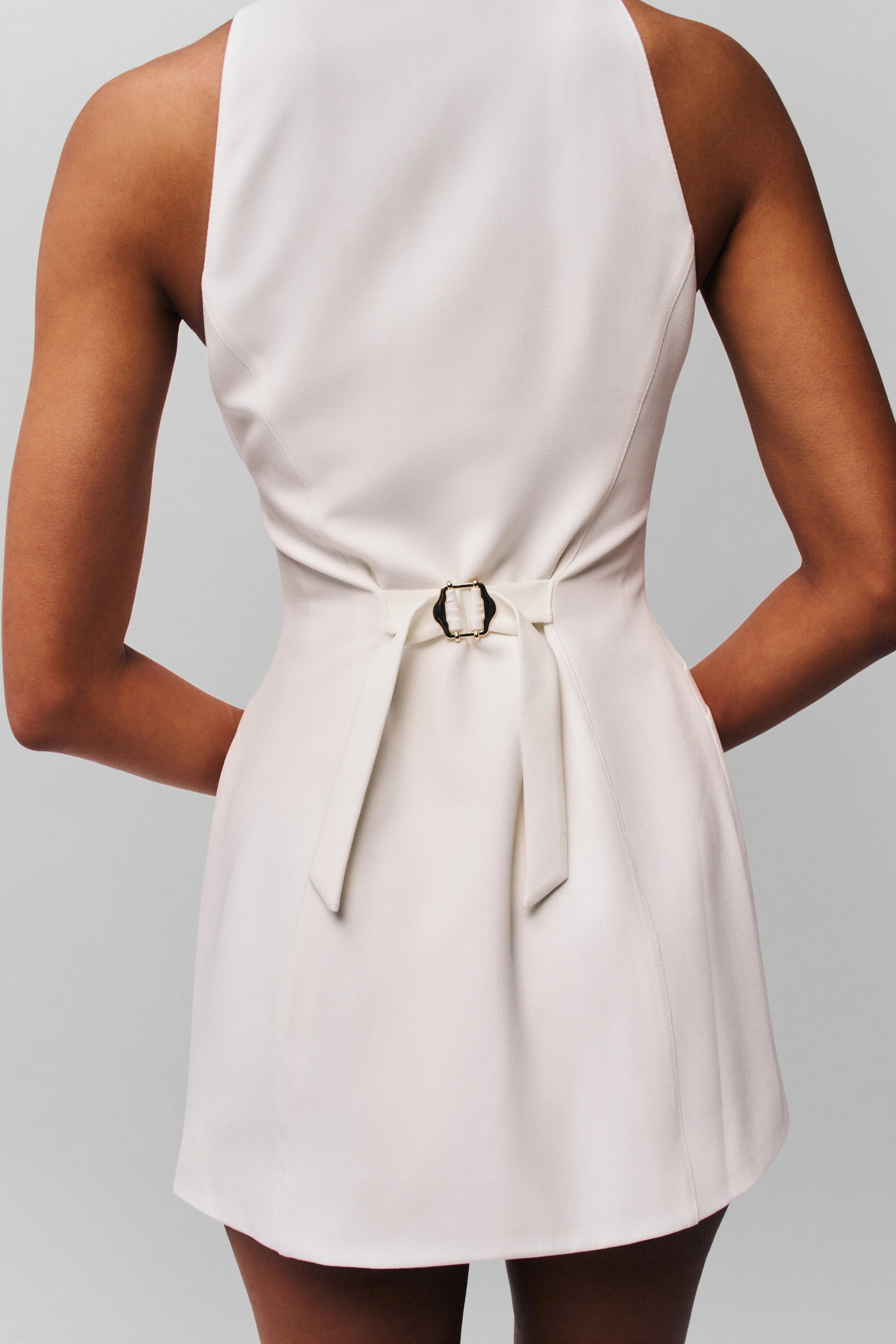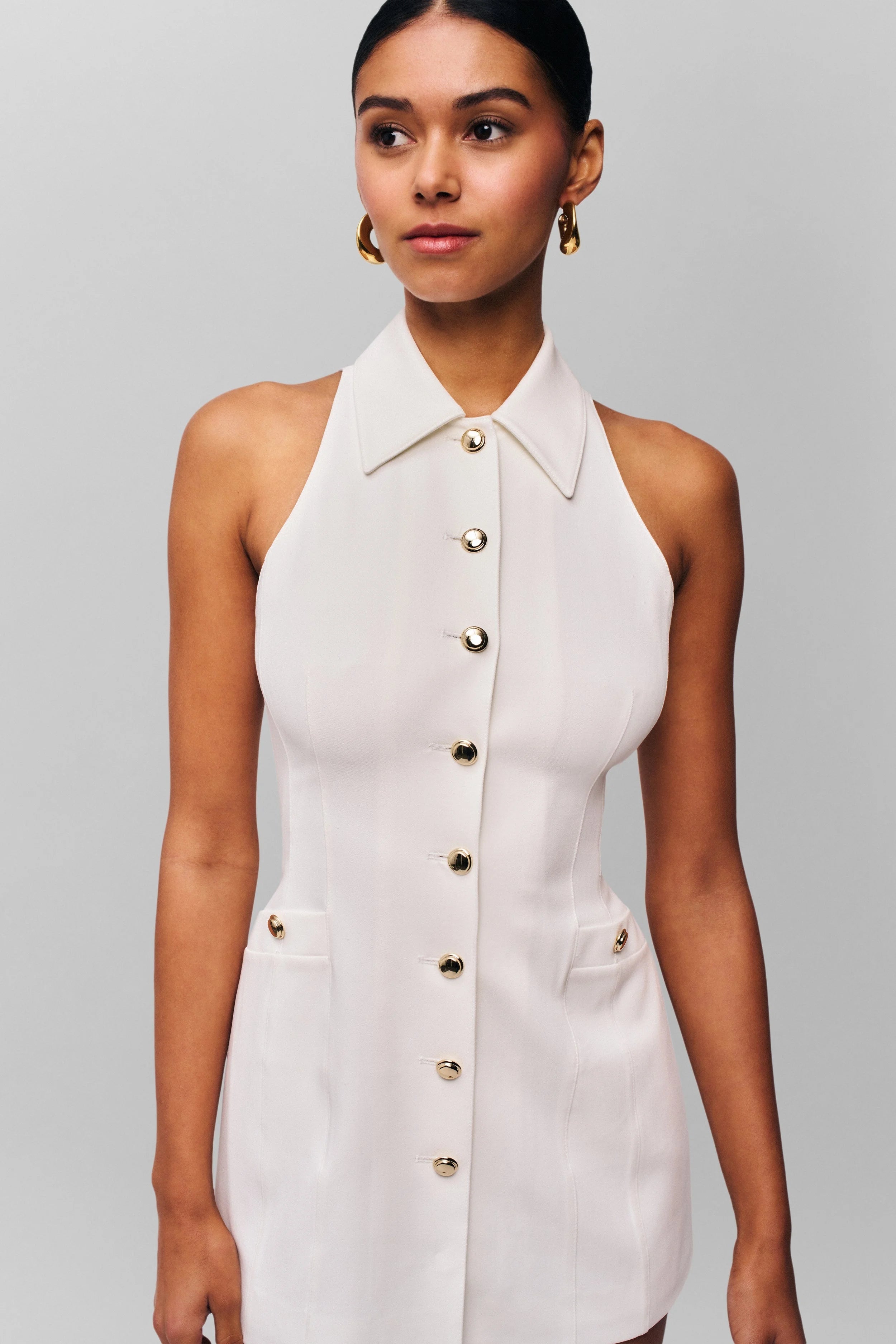 This white halter mini dress features a tailored waist and full button-front design. The clean halter neckline and fitted silhouette create a polished yet feminine look—perfect for brunches, vacations, and summer events.
