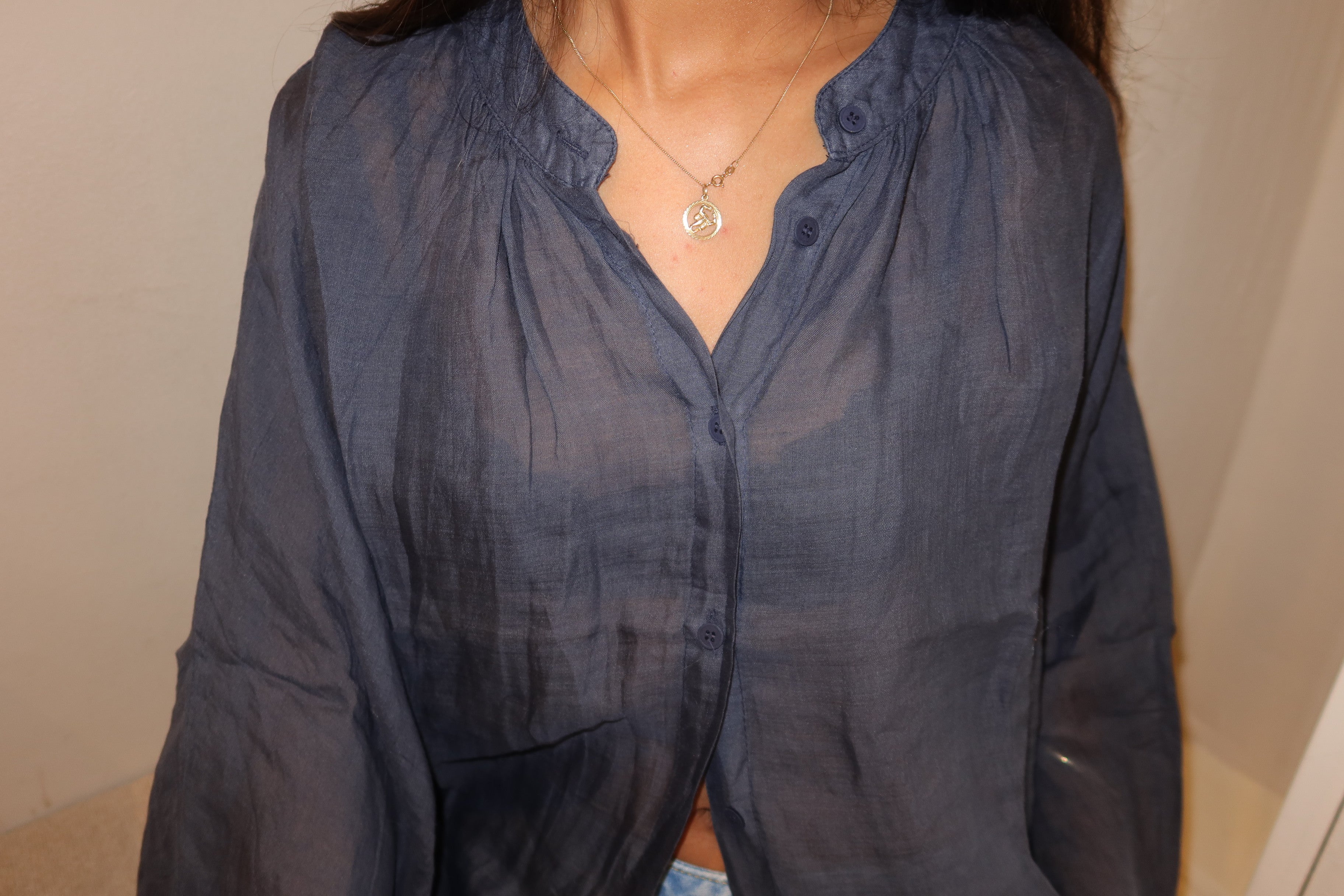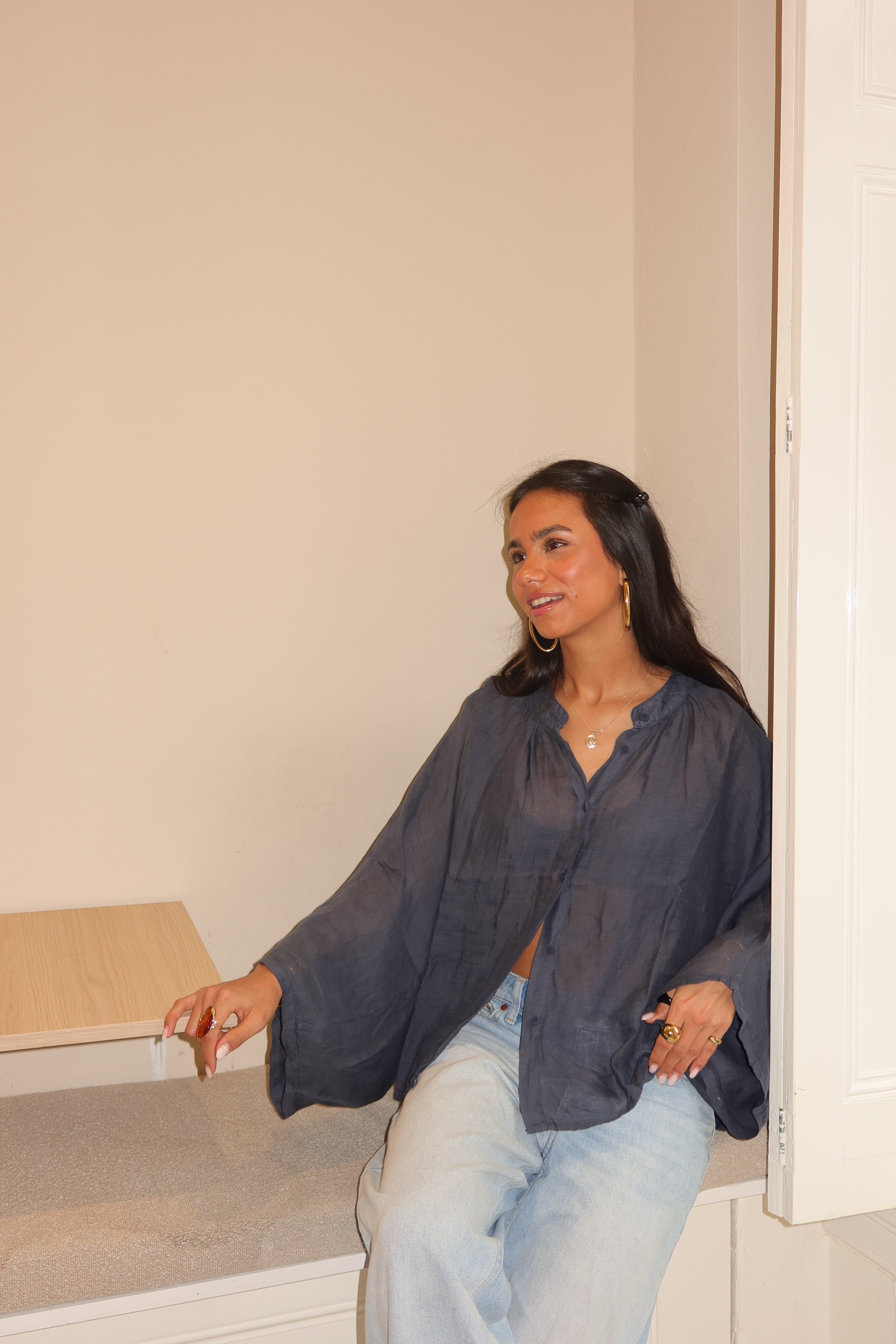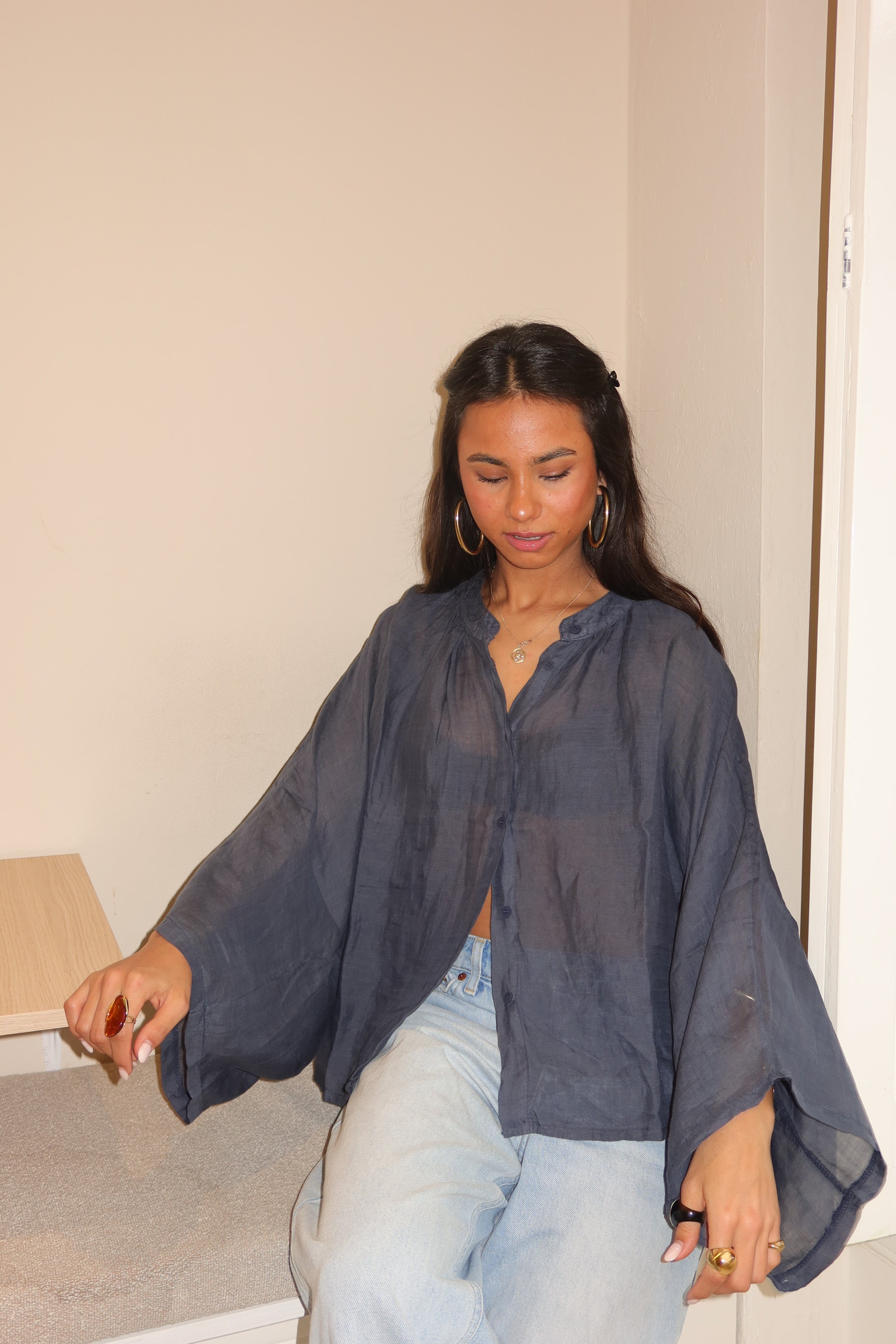 A flowy, semi-sheer blouse in a soft charcoal-grey tone, designed with wide sleeves and a relaxed silhouette for an effortlessly elegant look. The lightweight fabric drapes beautifully and adds a subtle, airy movement, while the button-down front gives it a timeless and versatile finish. Perfect to wear loosely over denim for a laid-back chic vibe or styled with tailored pieces for a more elevated feel.