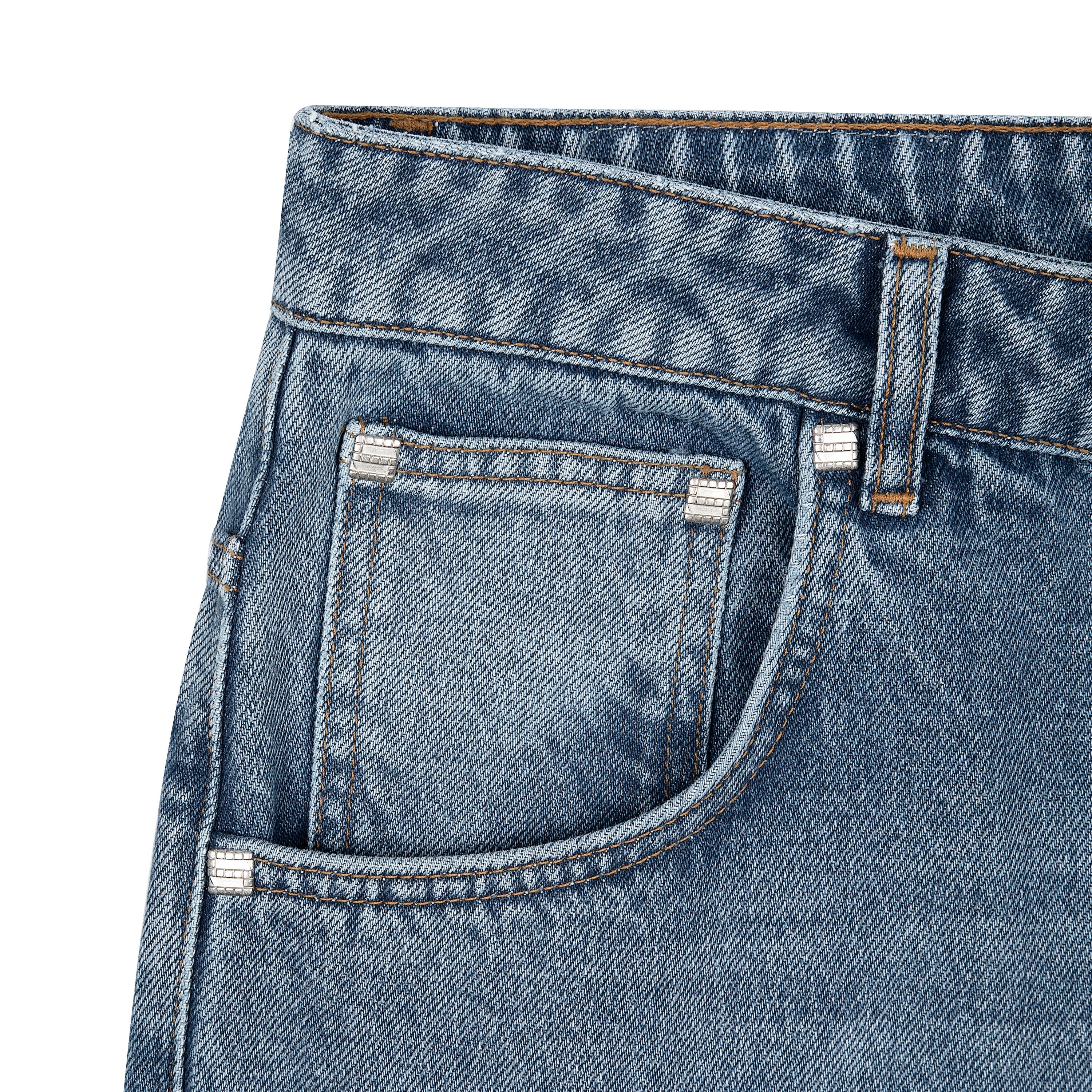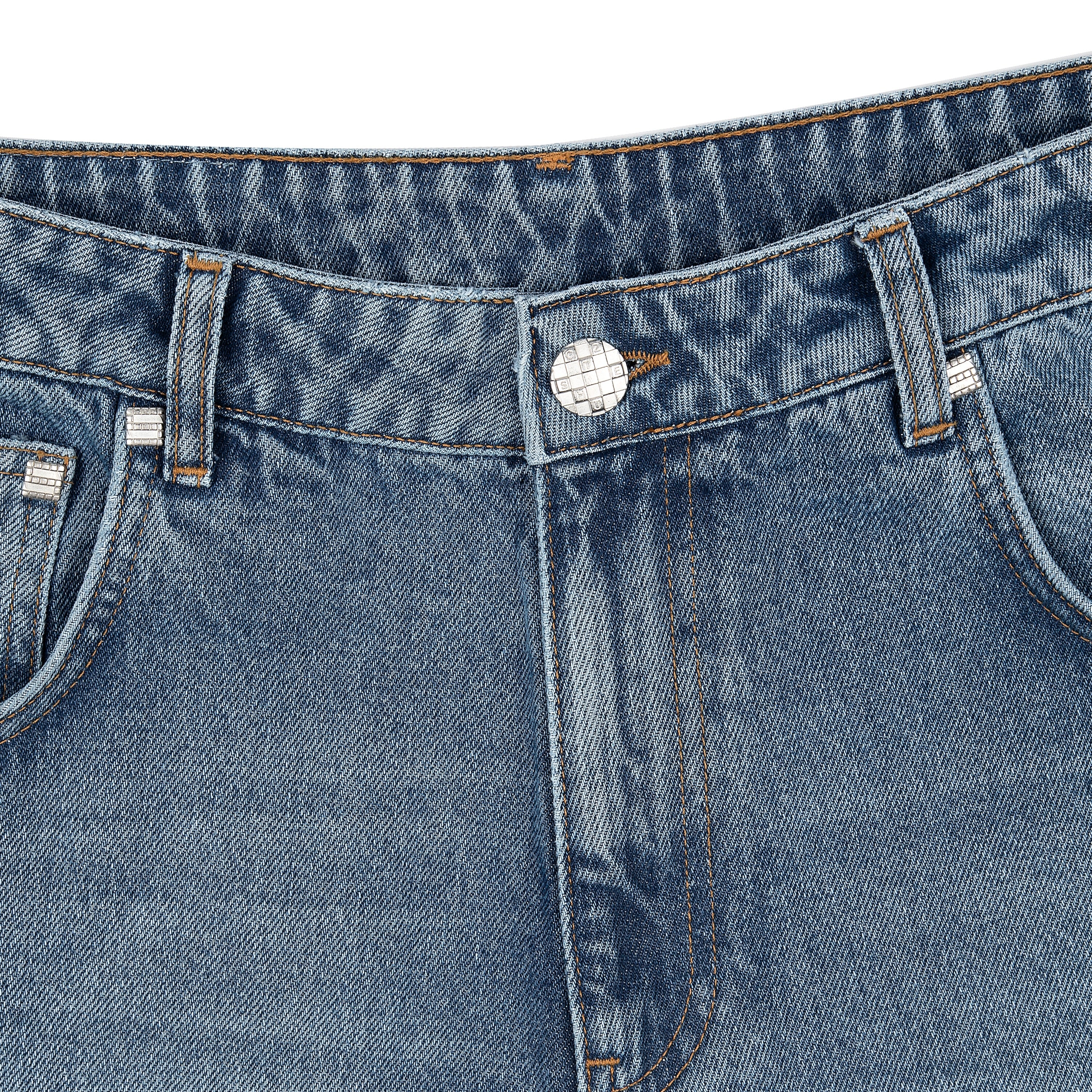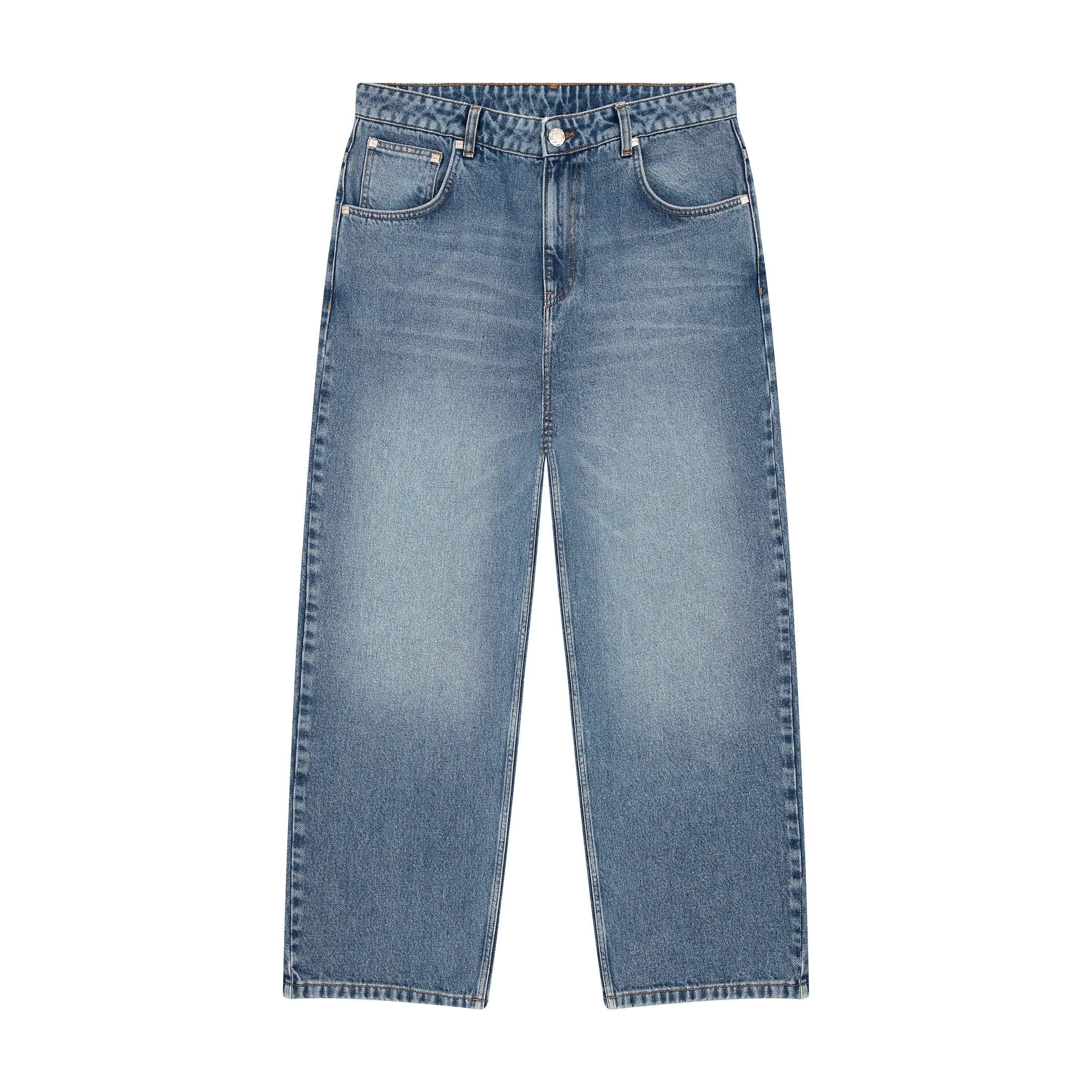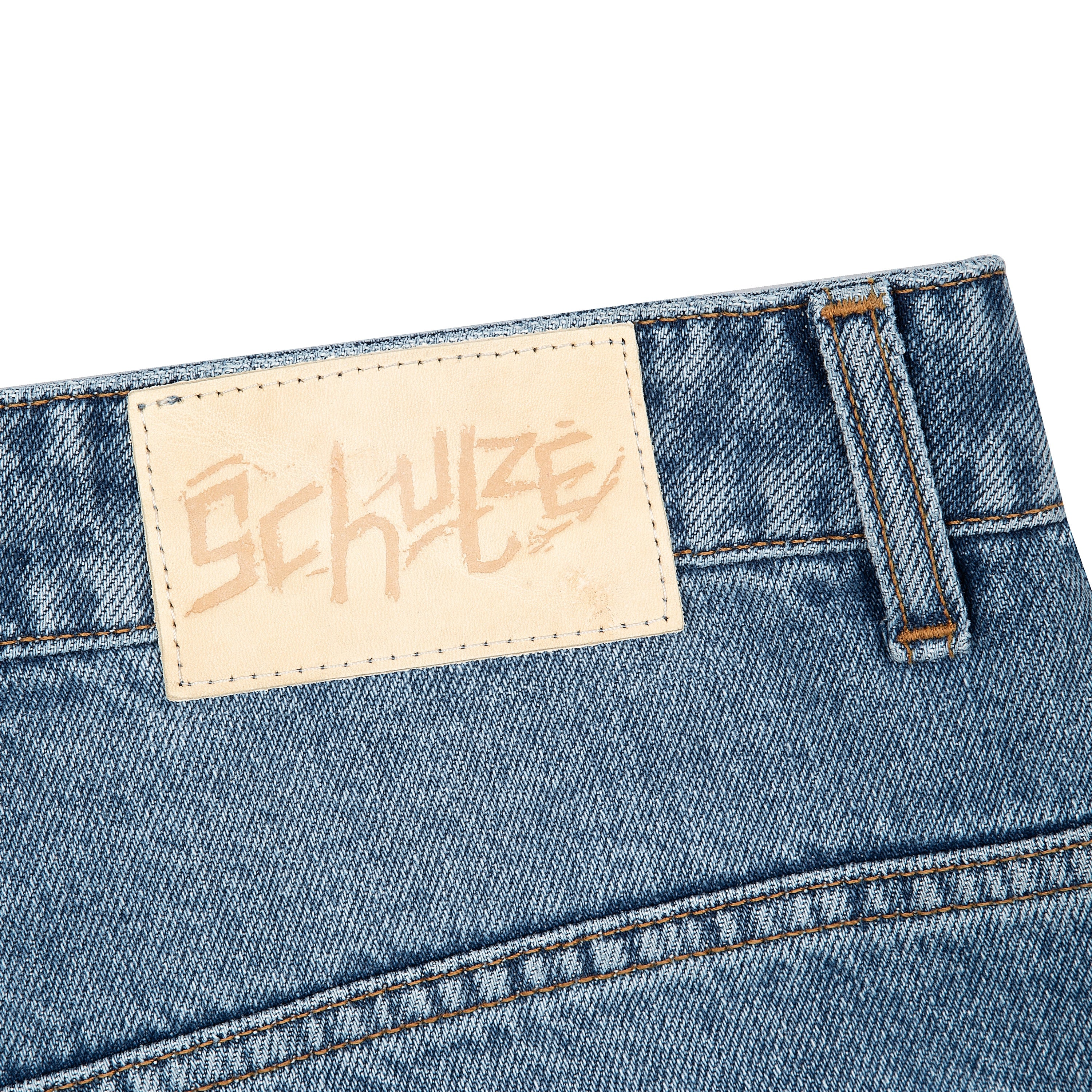 14,5oz denim / 100% cotton / embroidery on back / vegan woven leather details on embroidery / deboss printed leather patch / effect washing / custom button / fits true to size / allow up 2 weeks for this item to be shipped
