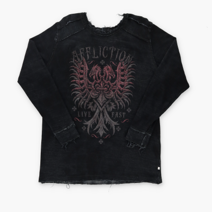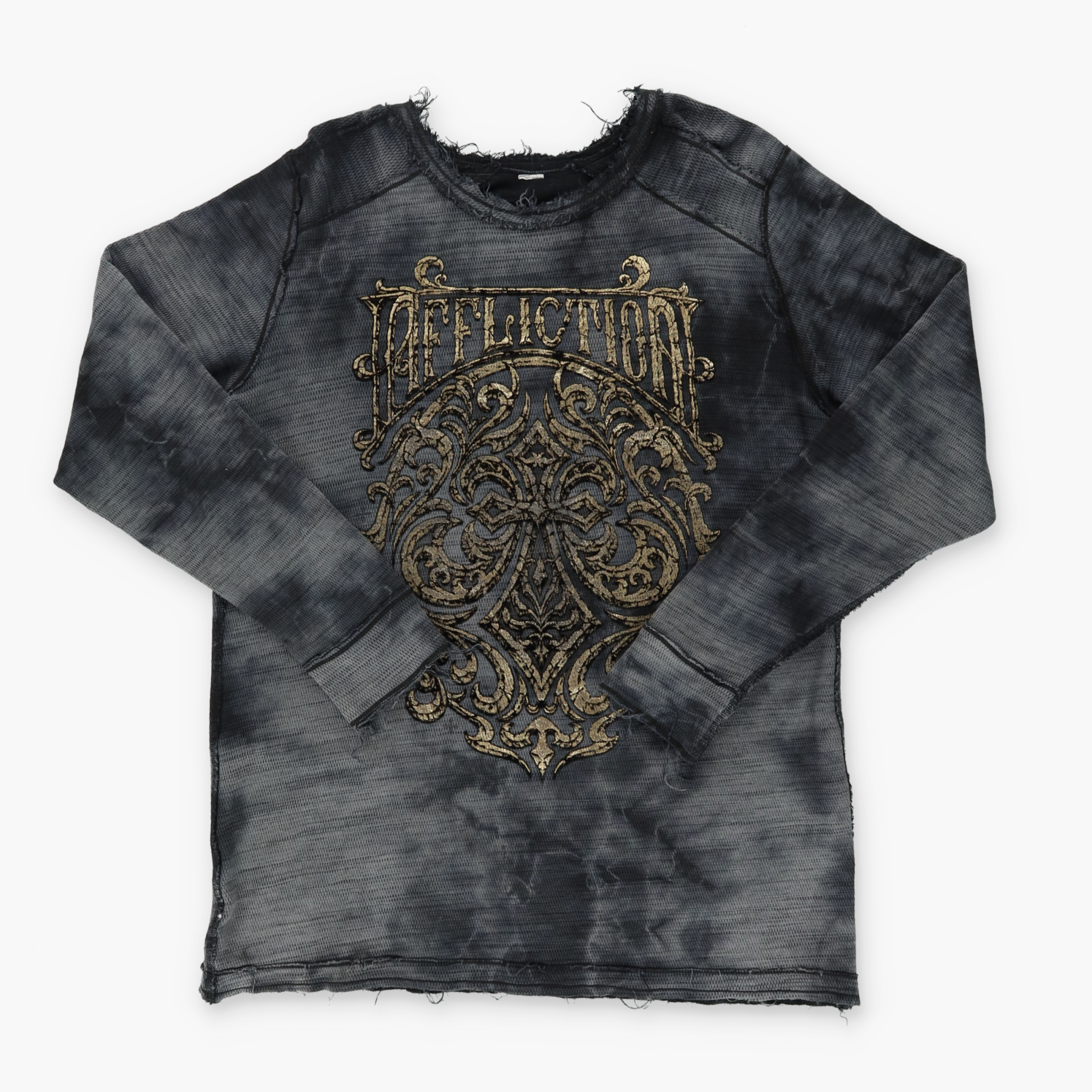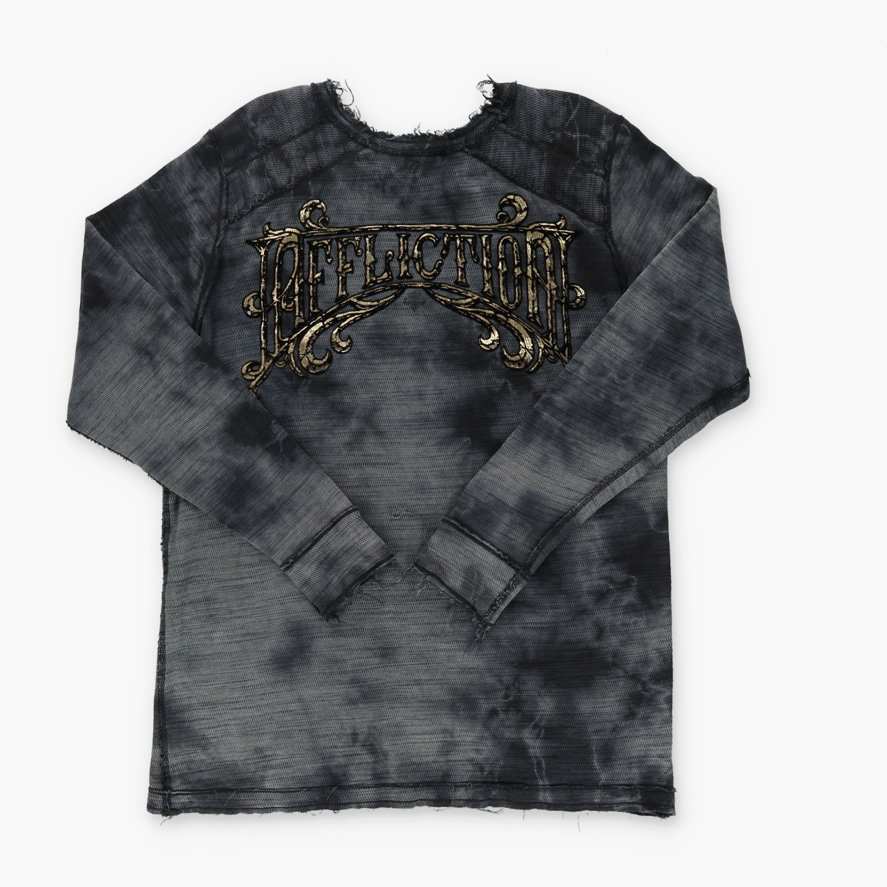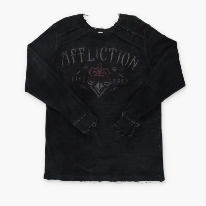 AFFLICTION Y2K Distressed Reversible Gold Letter Long Sleeve Tee (L-XL)