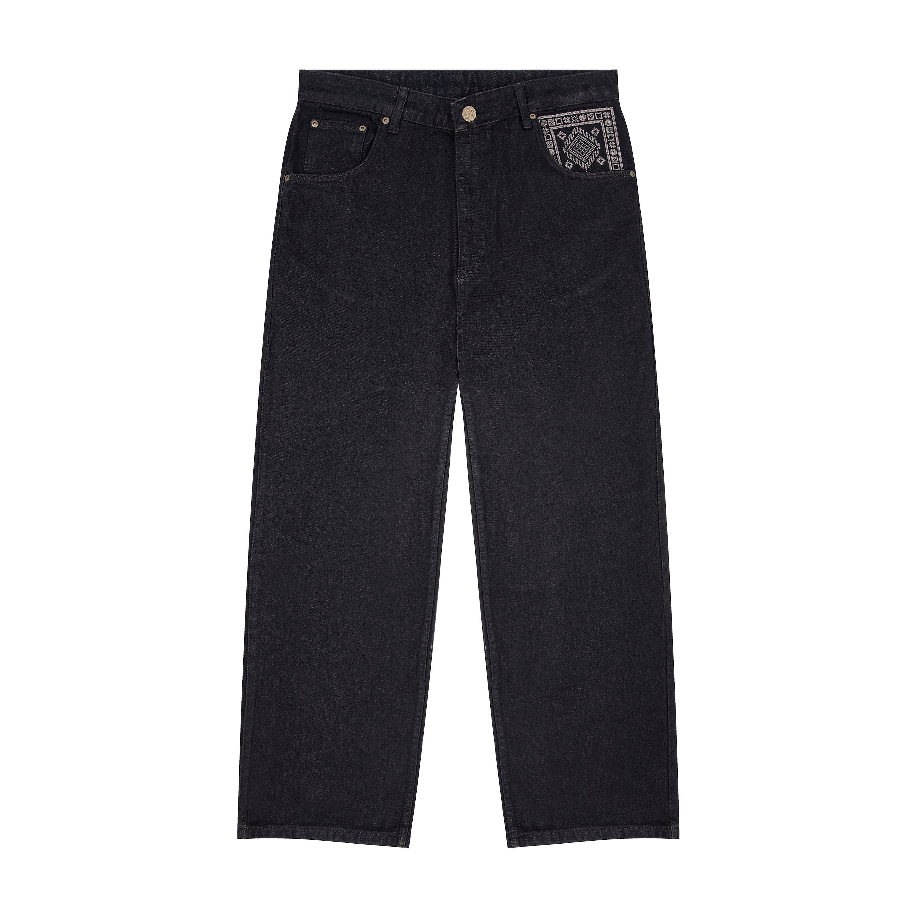 14,5oz denim / 100% cotton / embroidery on front pocket / embroidered patches on back / debossed printed leather patch / custom button / red tinted effect washing / wash inside out / fits true to size