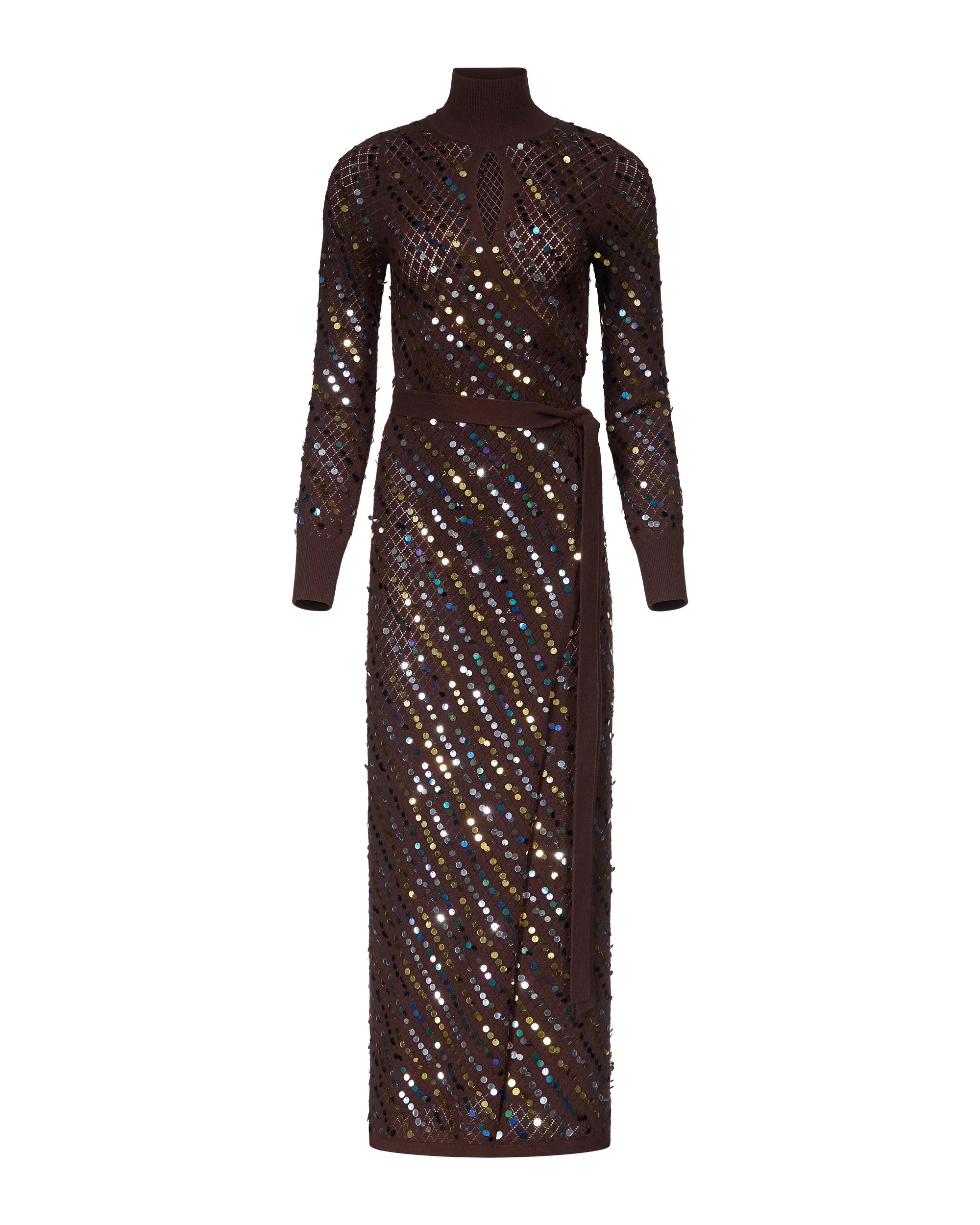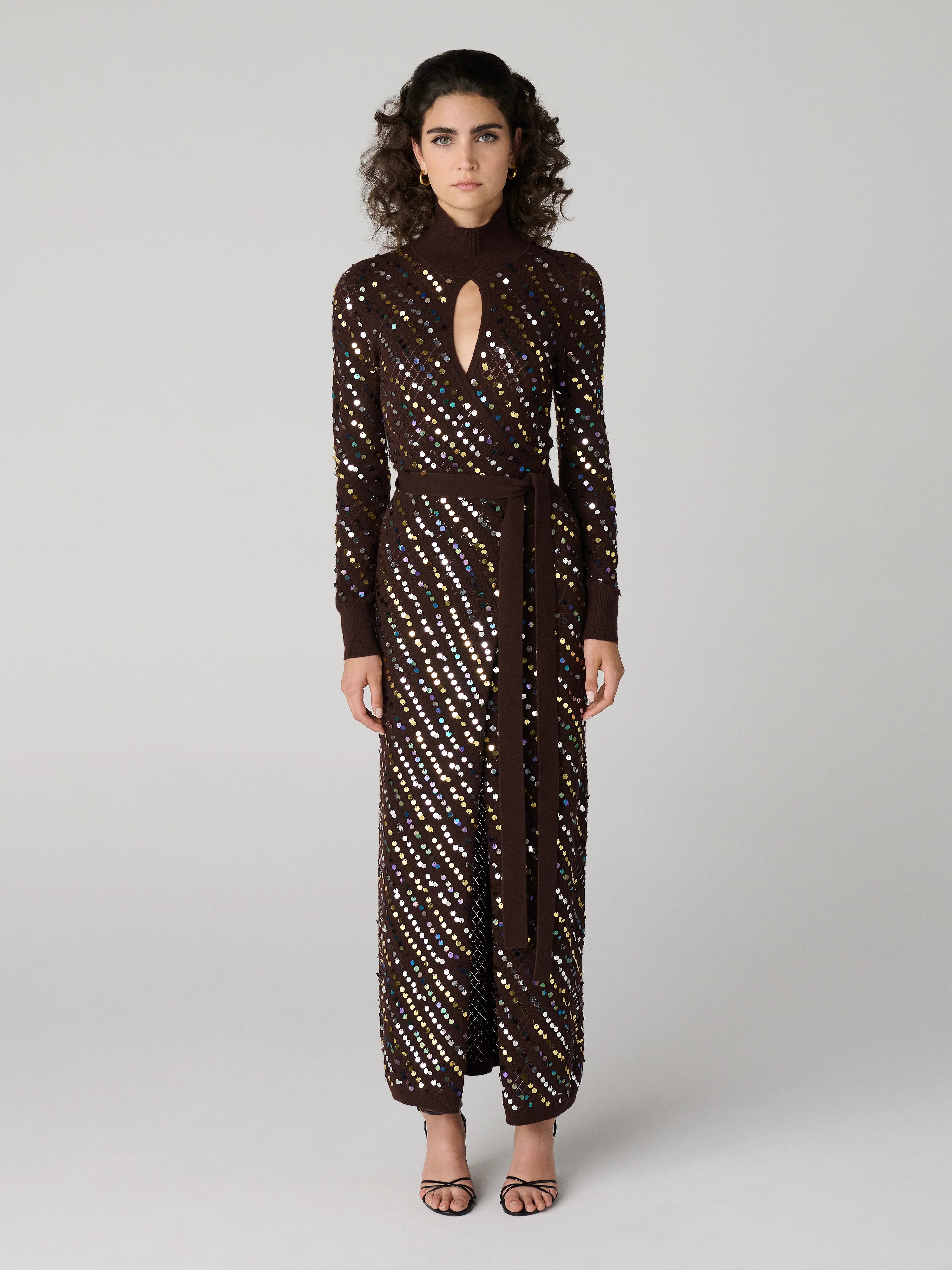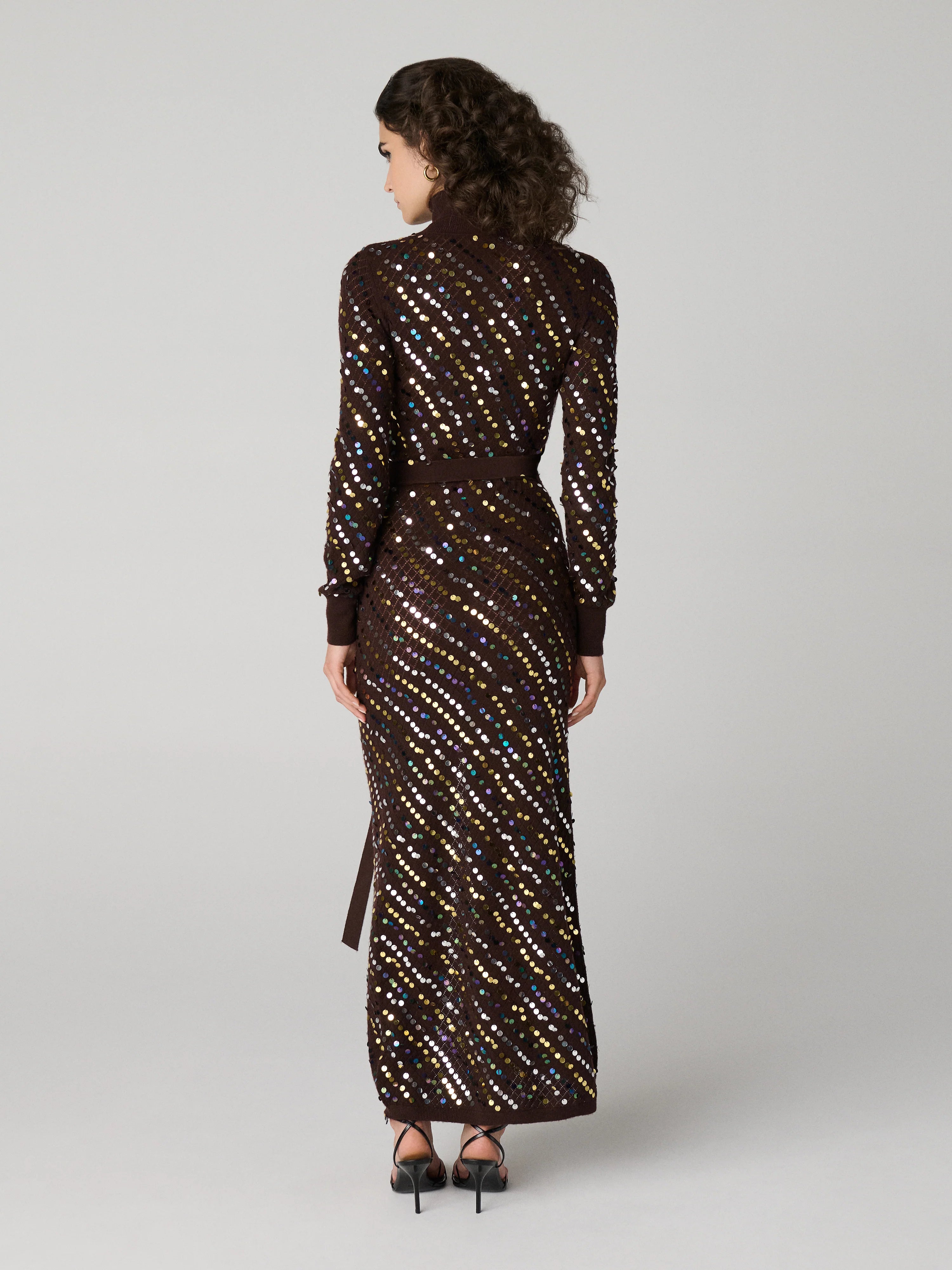 Elegant, sexy, and built to sparkle—this brown knit maxi dress brings effortless holiday glam.