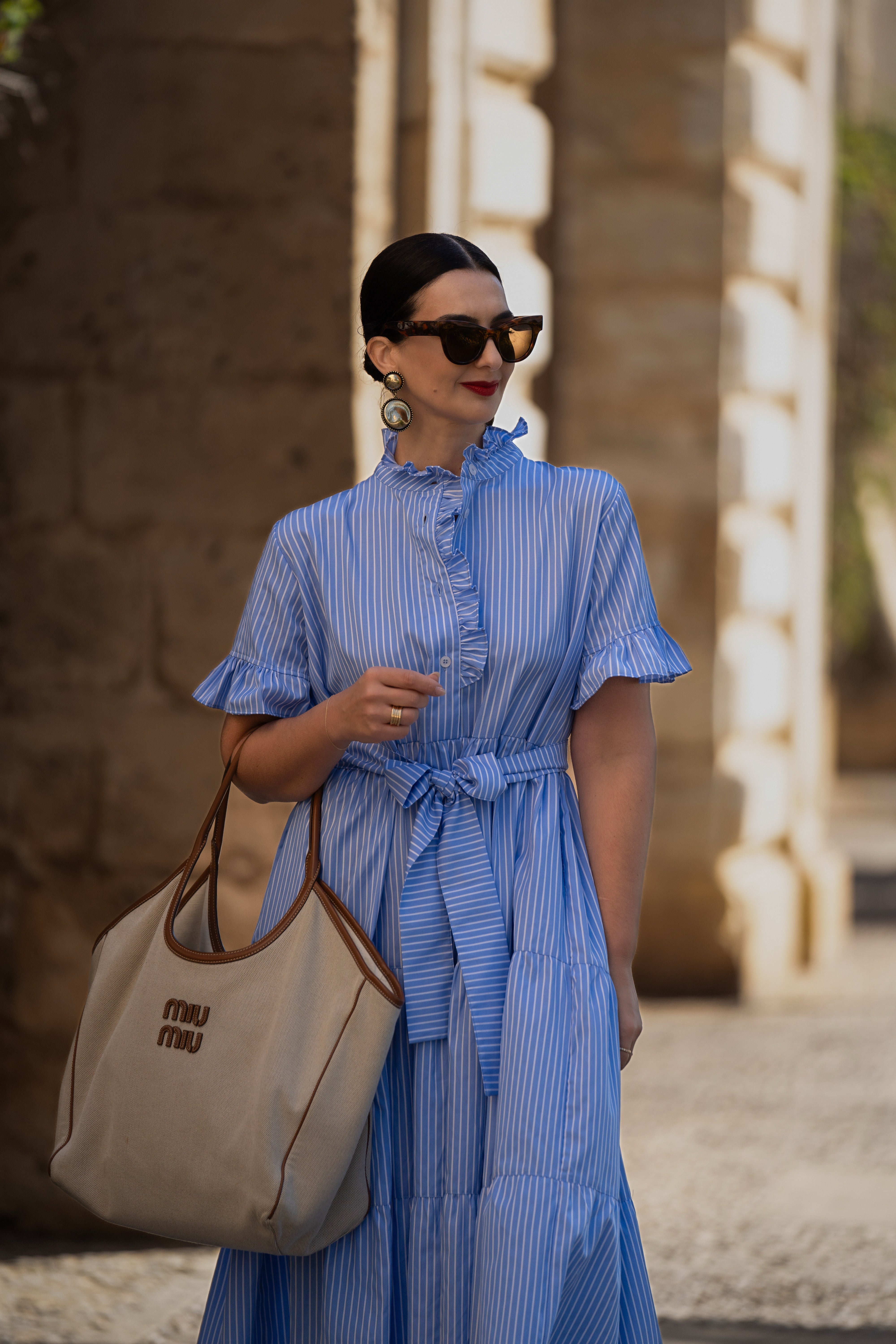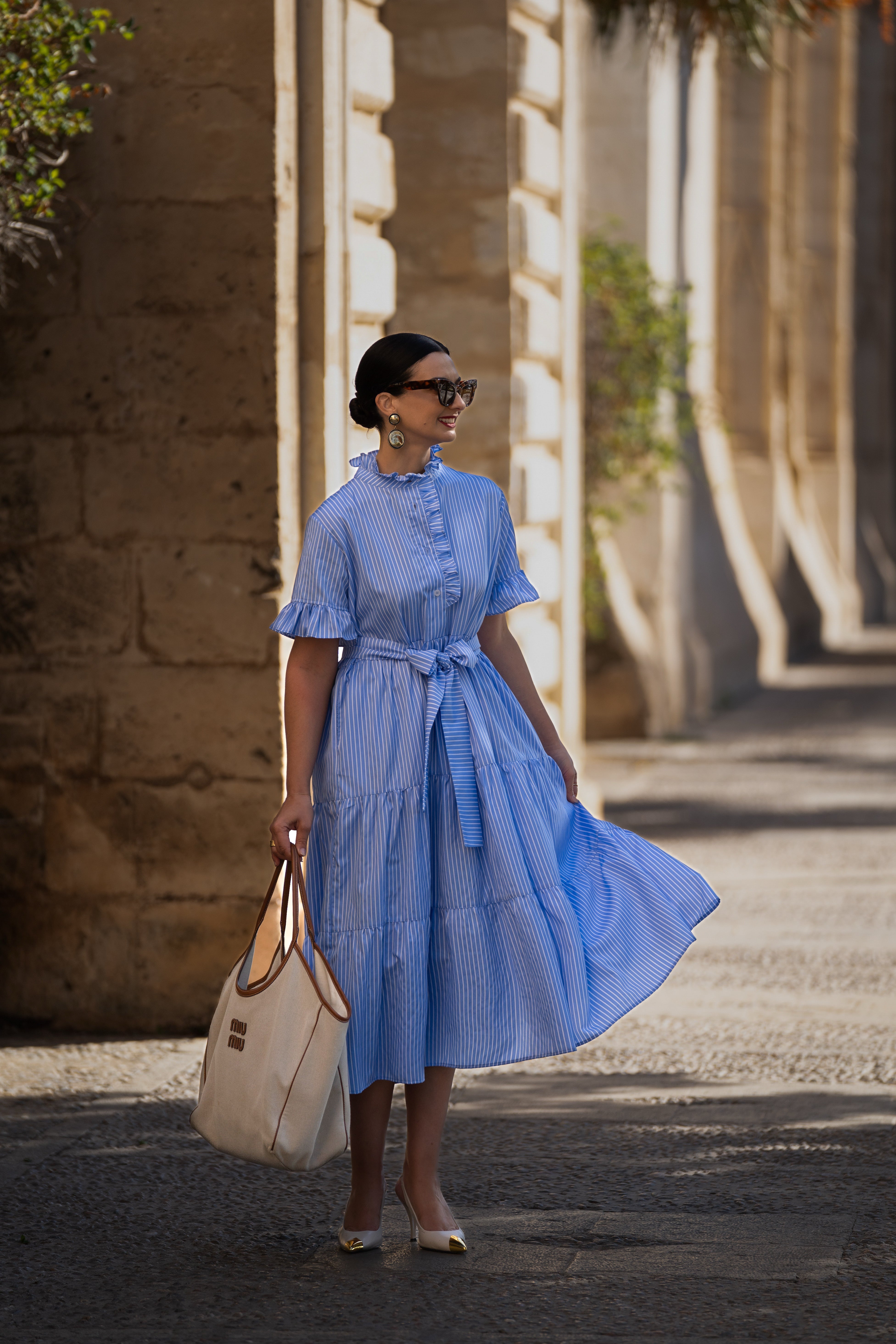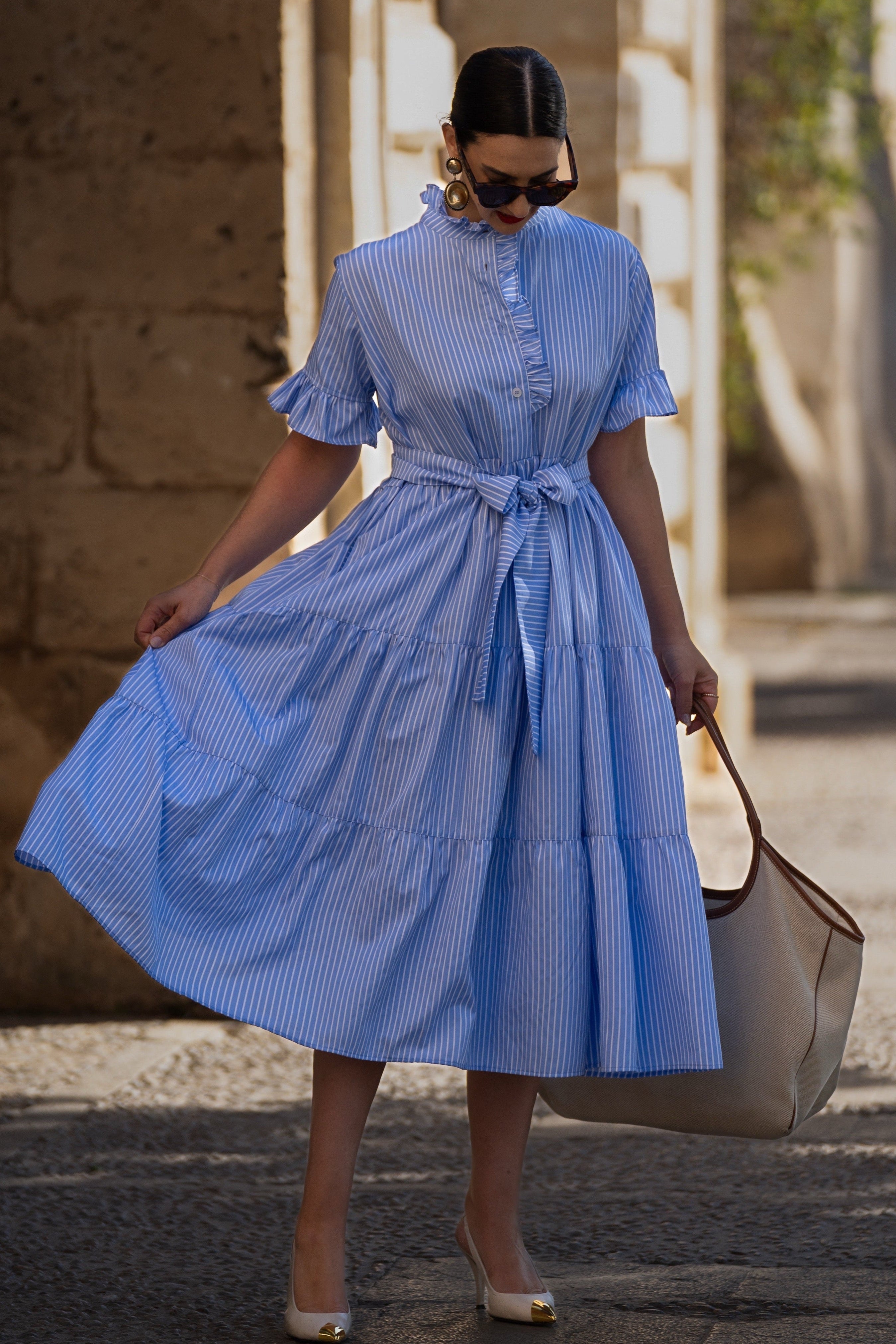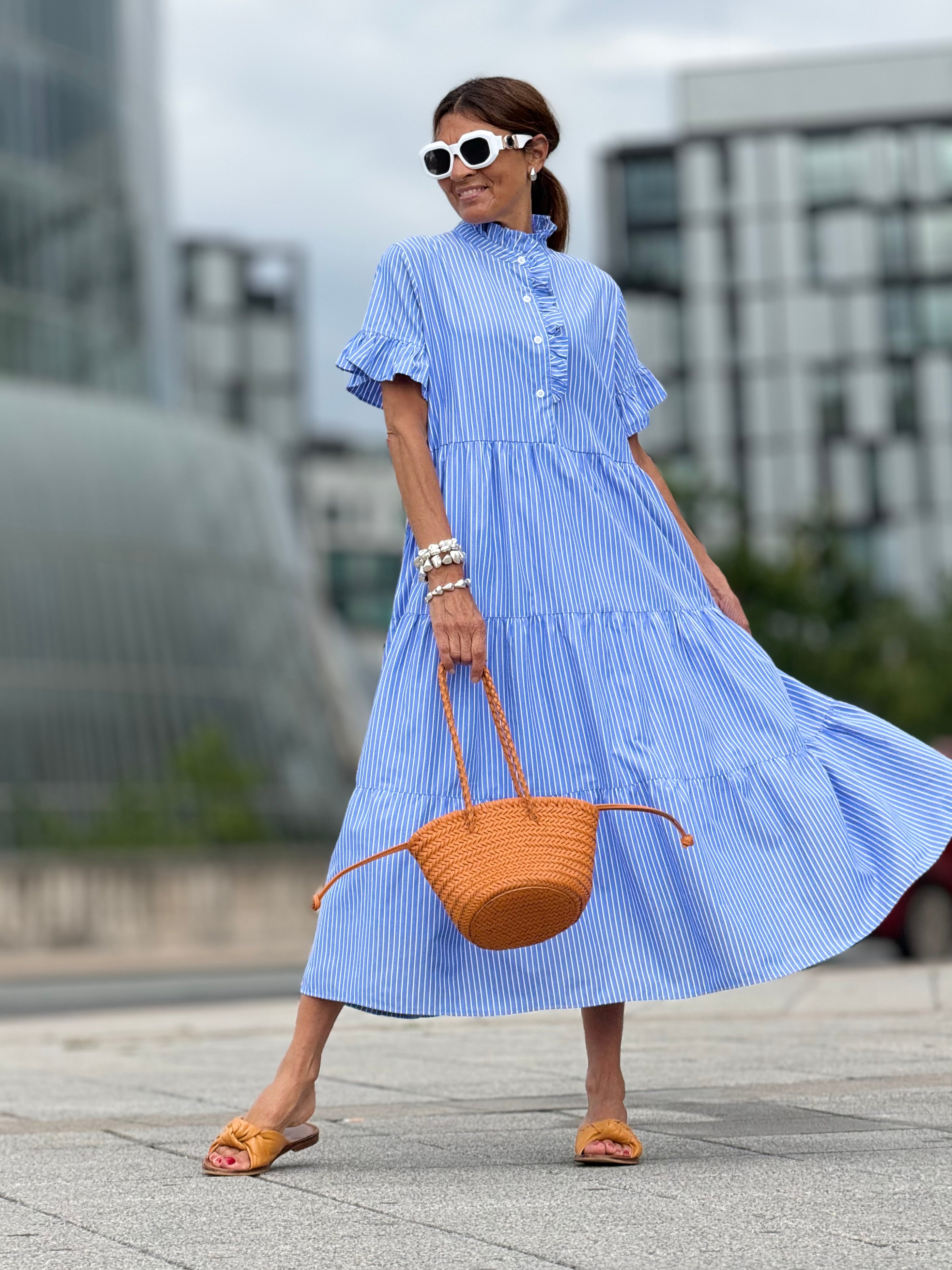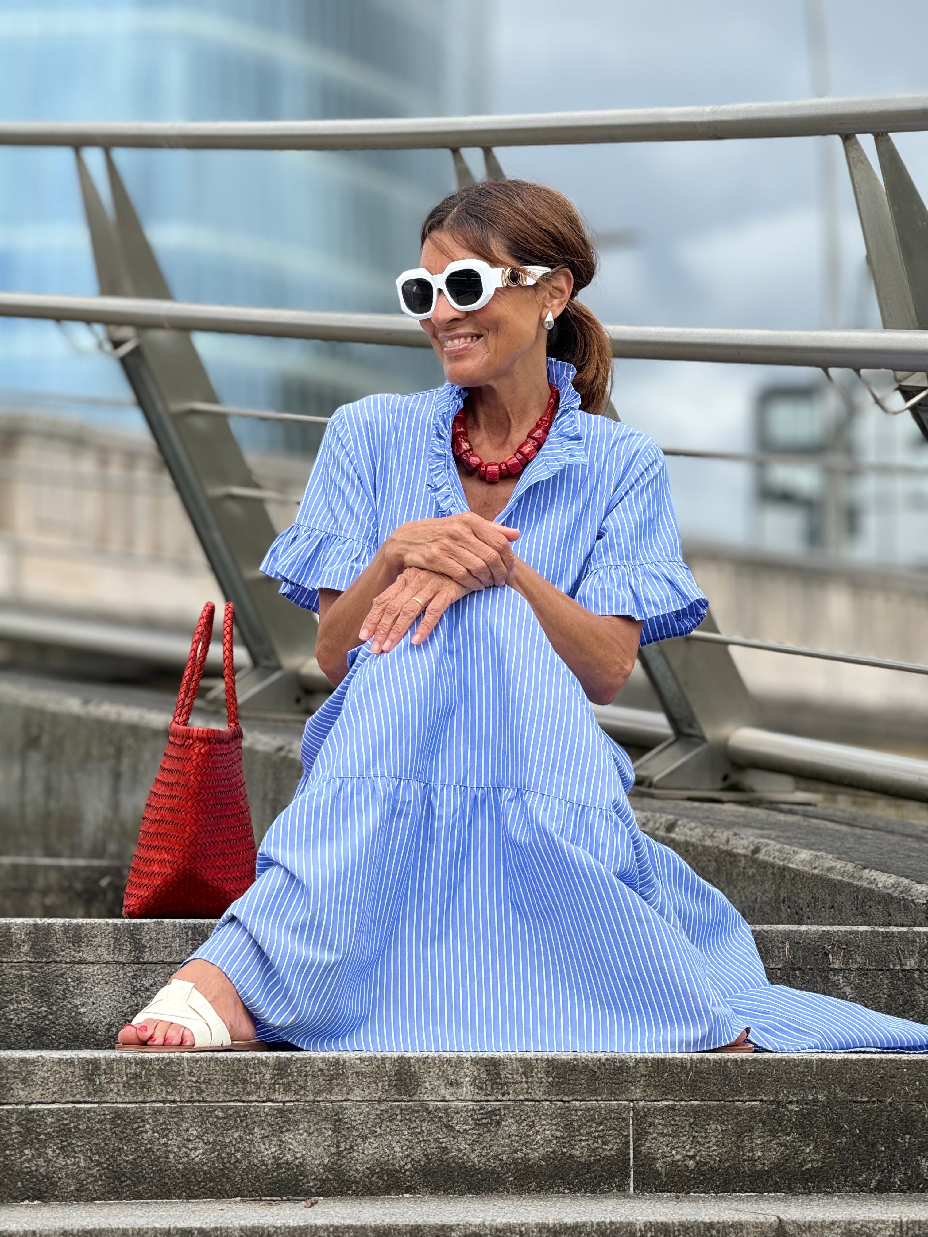 Designed by industry experts, the Dress Igone Stripes is a stylish and elegant option for any occasion. The blue and white striped pattern exudes sophistication, while the attached belt highlights your waistline for a flattering silhouette. Perfect for a professional or casual look, this dress is a must-have in any wardrobe!Dress Igone Stripes has side pockets. The length of the dress is 126 cm / 49.6 inch