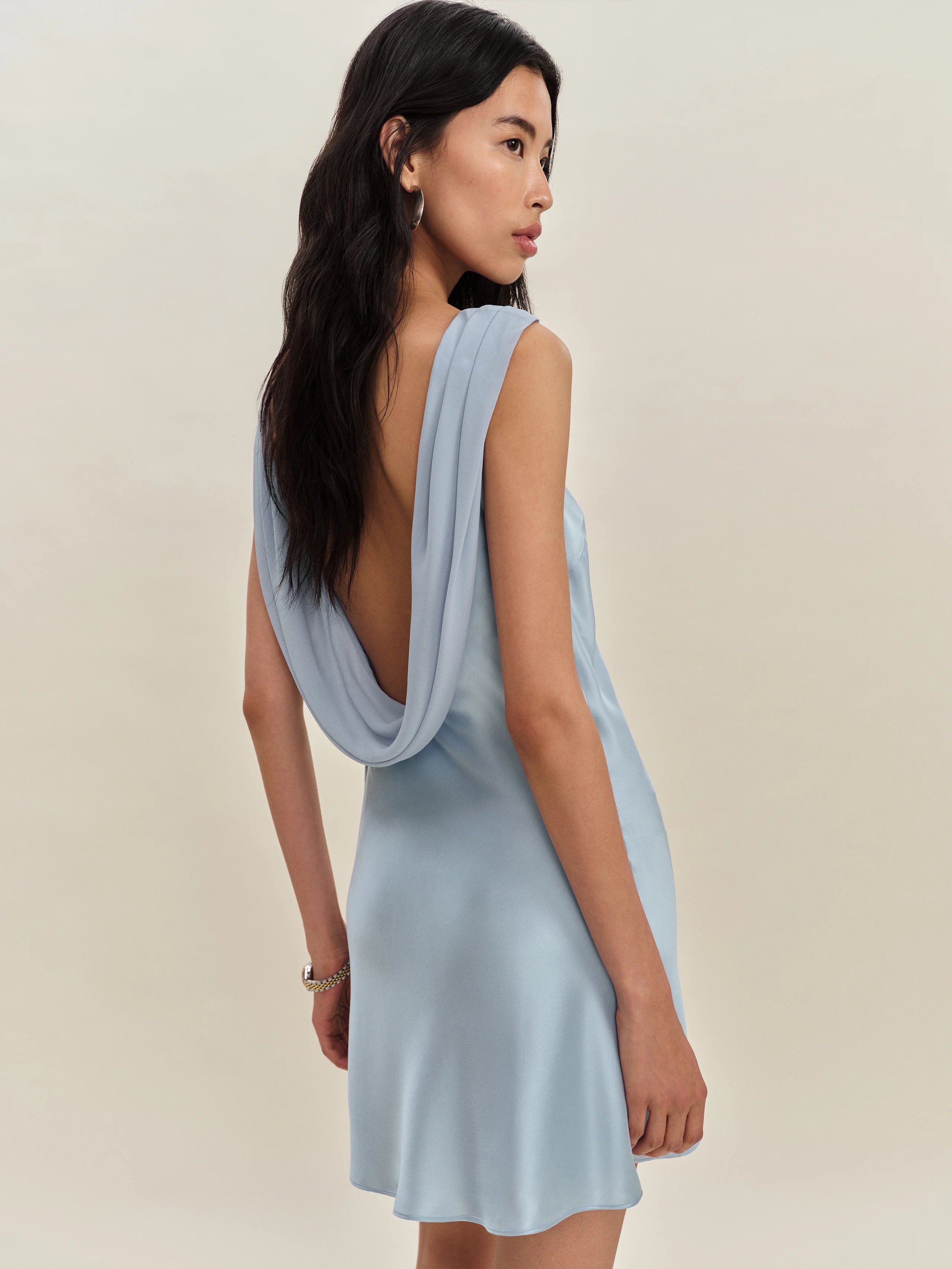 Refined and unforgettable. This ice blue satin mini dress features soft front draping that enhances the silhouette, while the dramatic open-back design creates a bold yet elegant statement.