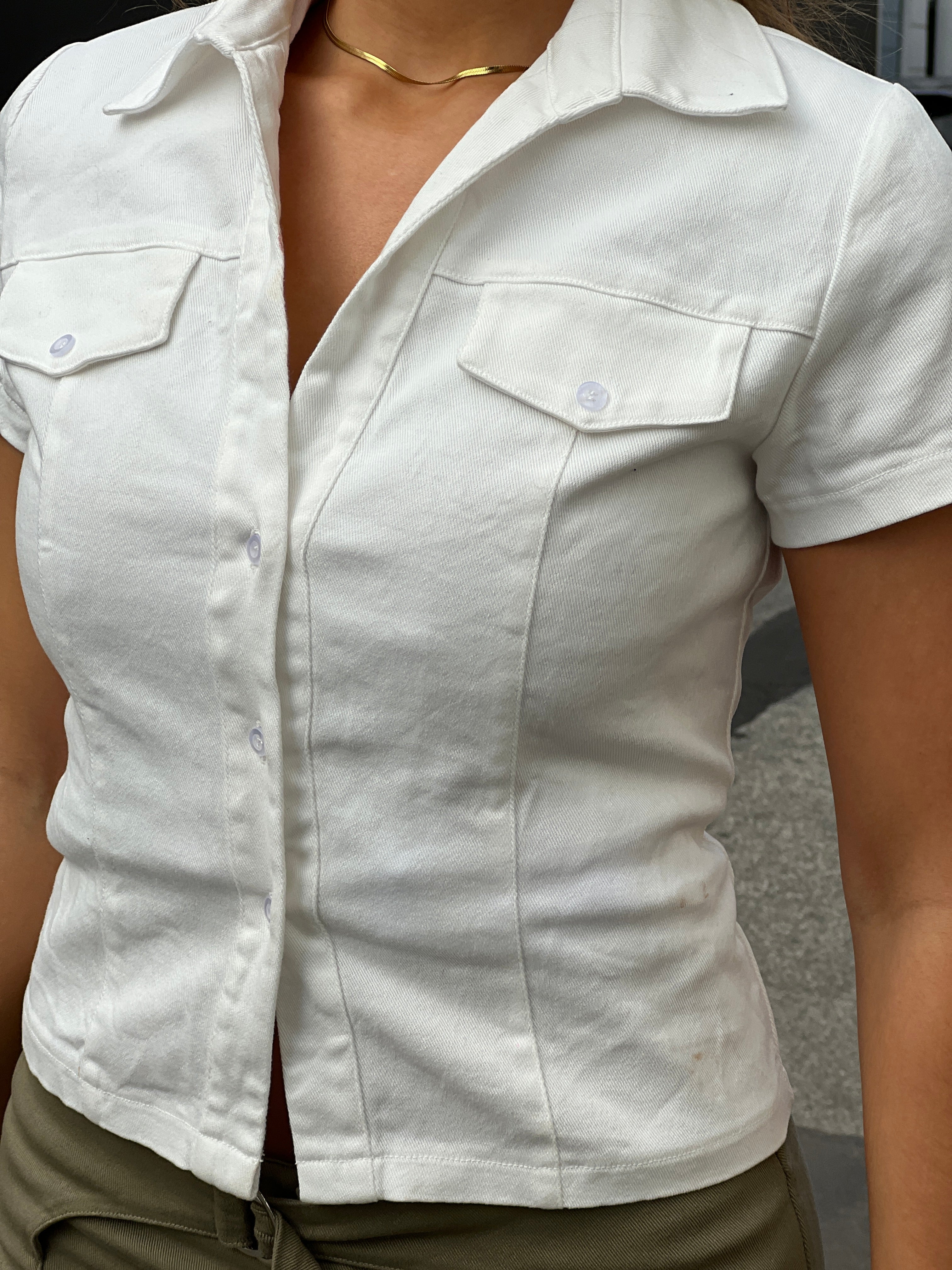 Our Elara fitted top in white is a timeless and elegant addition to your wardrobe. It is fitted for a flattering fit and has short sleeves, a V-neck, and a deep cutout for a feminine look. The button closure at the front and chest pockets add fine, classic details, while the visible stitching gives the top a modern twist. With its collar at the neck and clean lines, Elara is perfect for work, everyday wear, and events—style it with jeans, shorts, or a skirt for a stylish and versatile look.