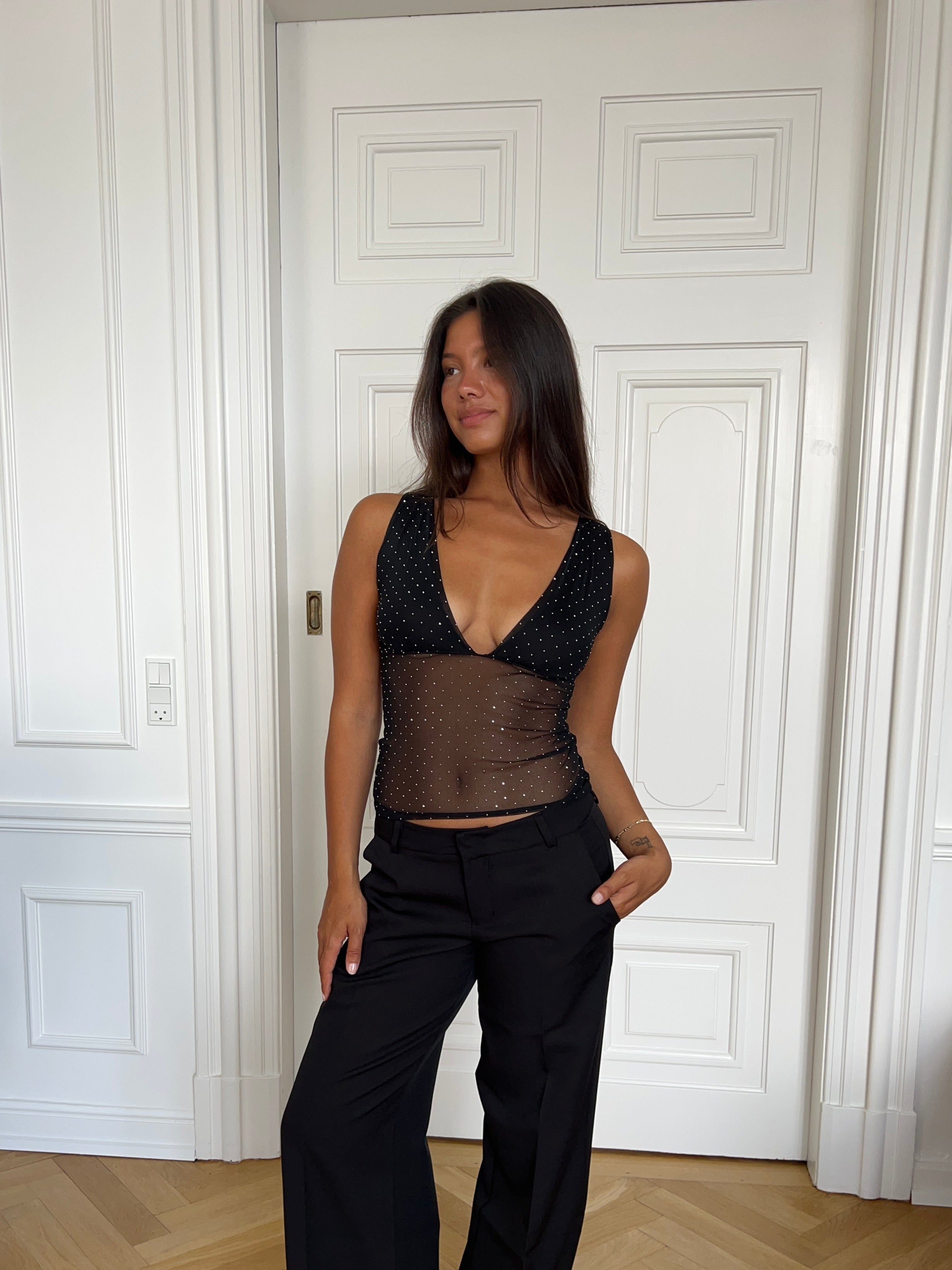 The Francesca V-neck top is fitted and accentuates your figure in a simple and elegant way. The classic V-neckline adds a sophisticated touch and the small studs on the top add a discreet but eye-catching detail element