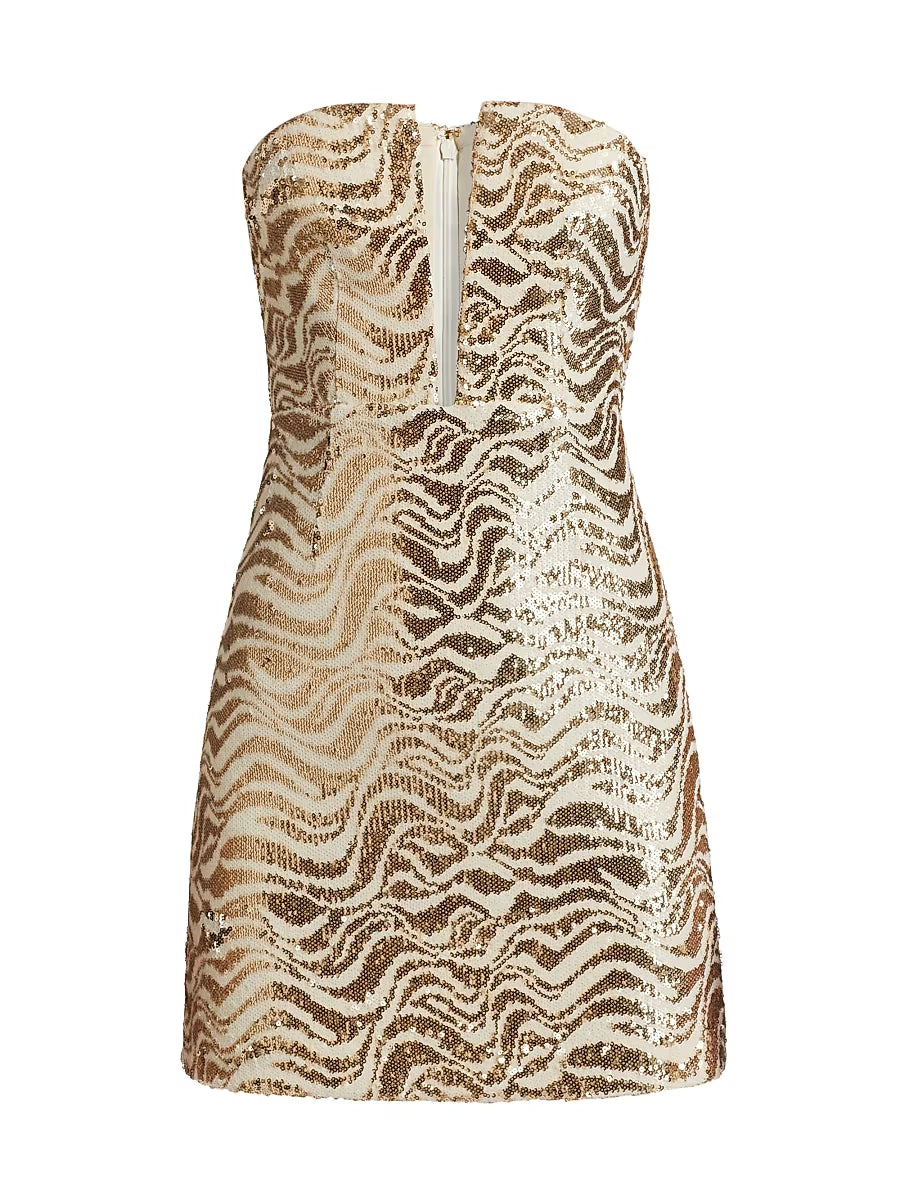 Bold, glamorous, and unforgettable. This strapless mini dress features heavy sequin zebra patterns with a deep V neckline, designed to command attention at any party.