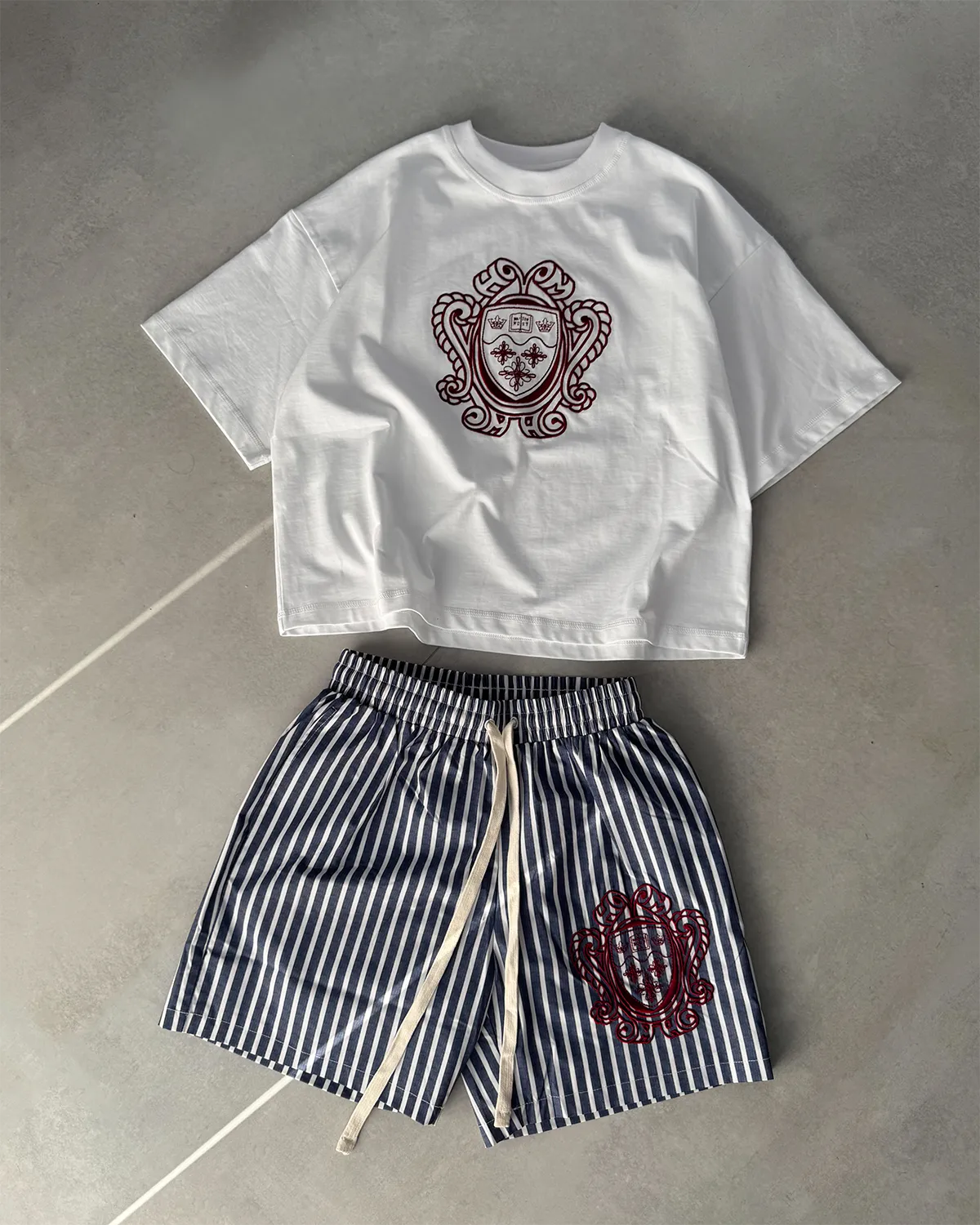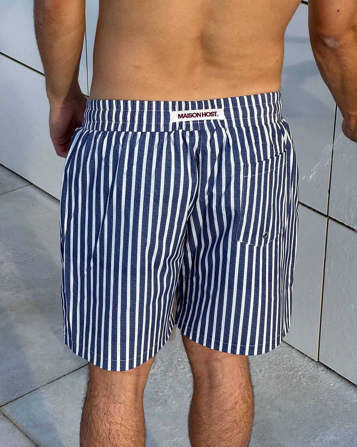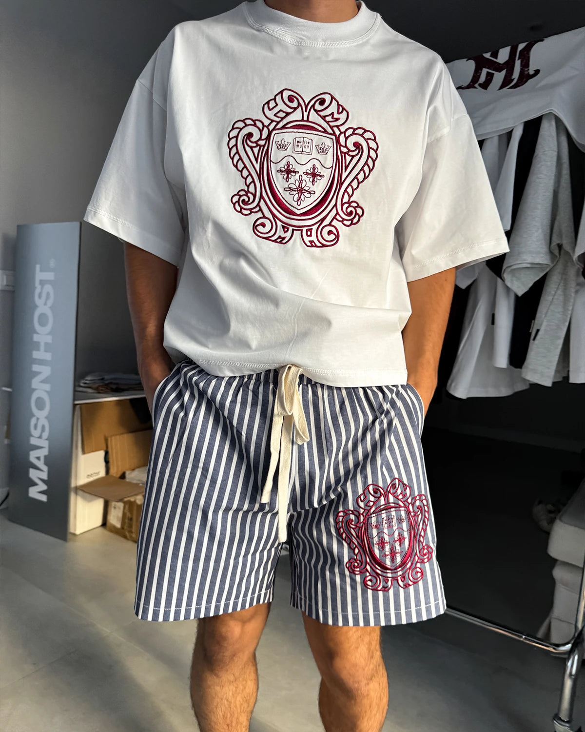 Long Cotton drawstrings. Stitched Heritage shield on the front. "MaisonHost" woven tag on the back side.