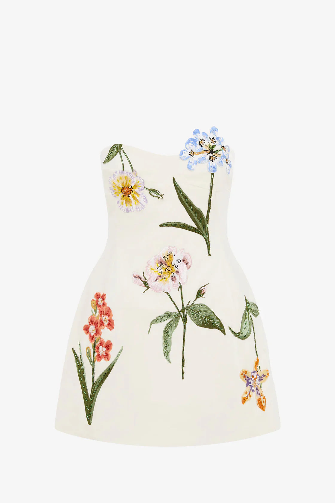 Soft, romantic, and effortlessly elegant. This strapless white mini features delicate 3D floral details and an A-line silhouette that flatters while keeping things light and feminine.