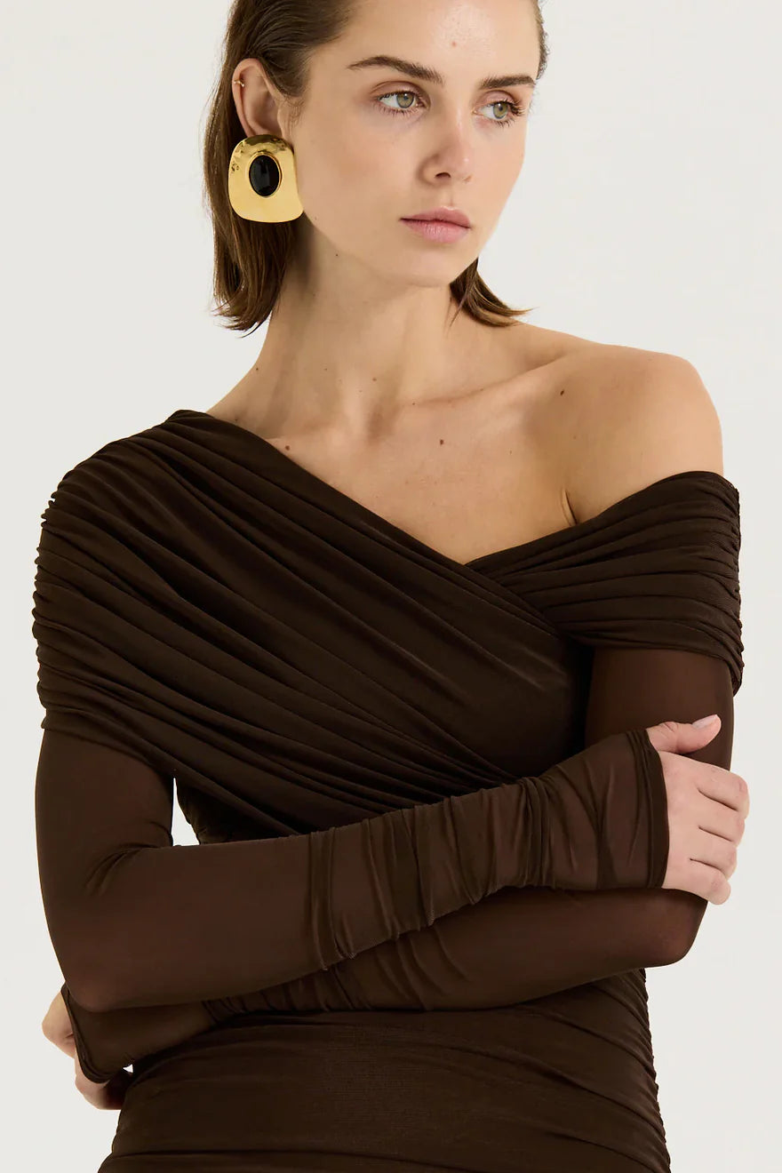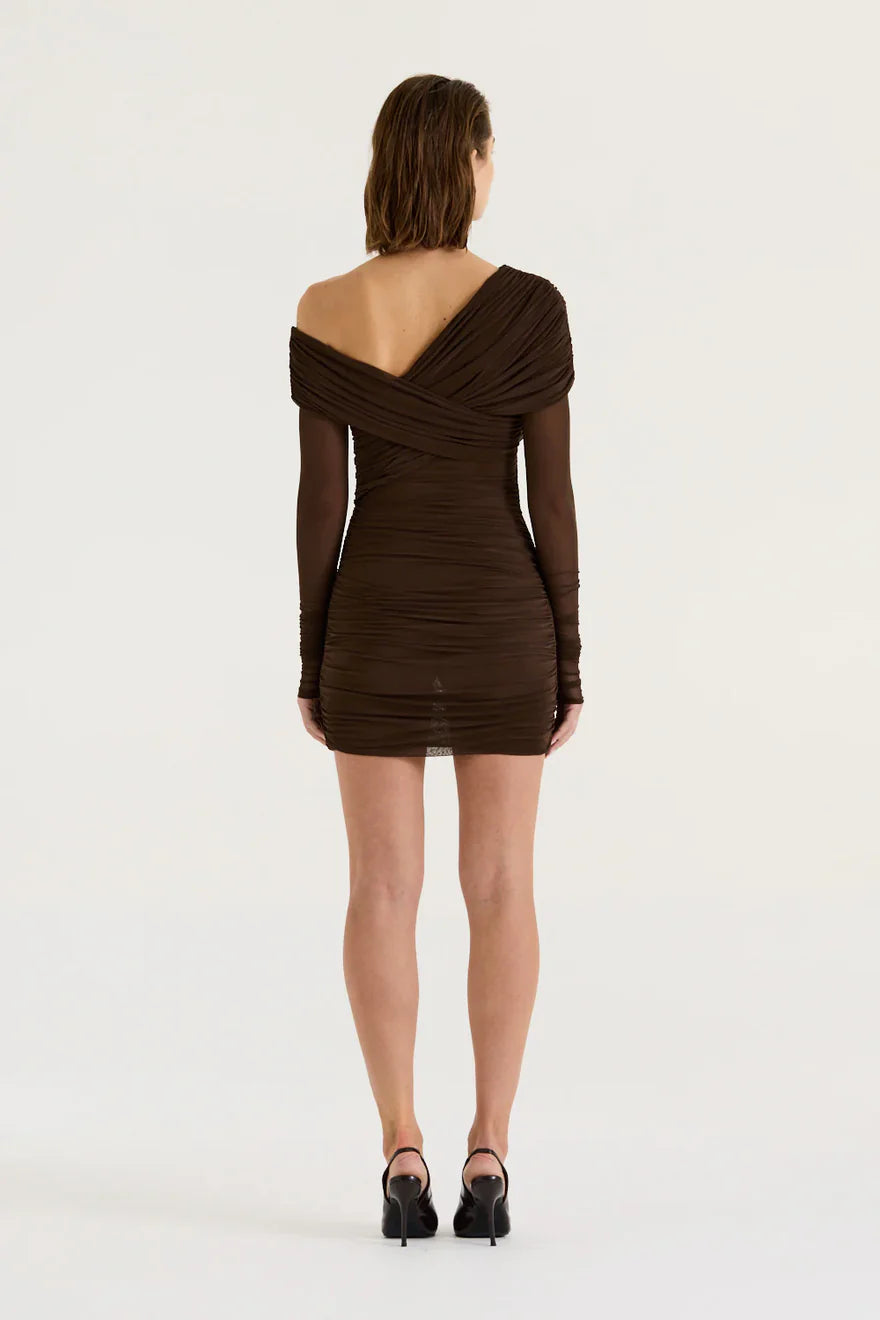 Designed to contour and captivate. This mocha mini dress features an asymmetrical one-shoulder neckline, sheer mesh long sleeve, and ruched bodycon fit that sculpts your curves with subtle drama—perfect for nights that call for elegance with edge.