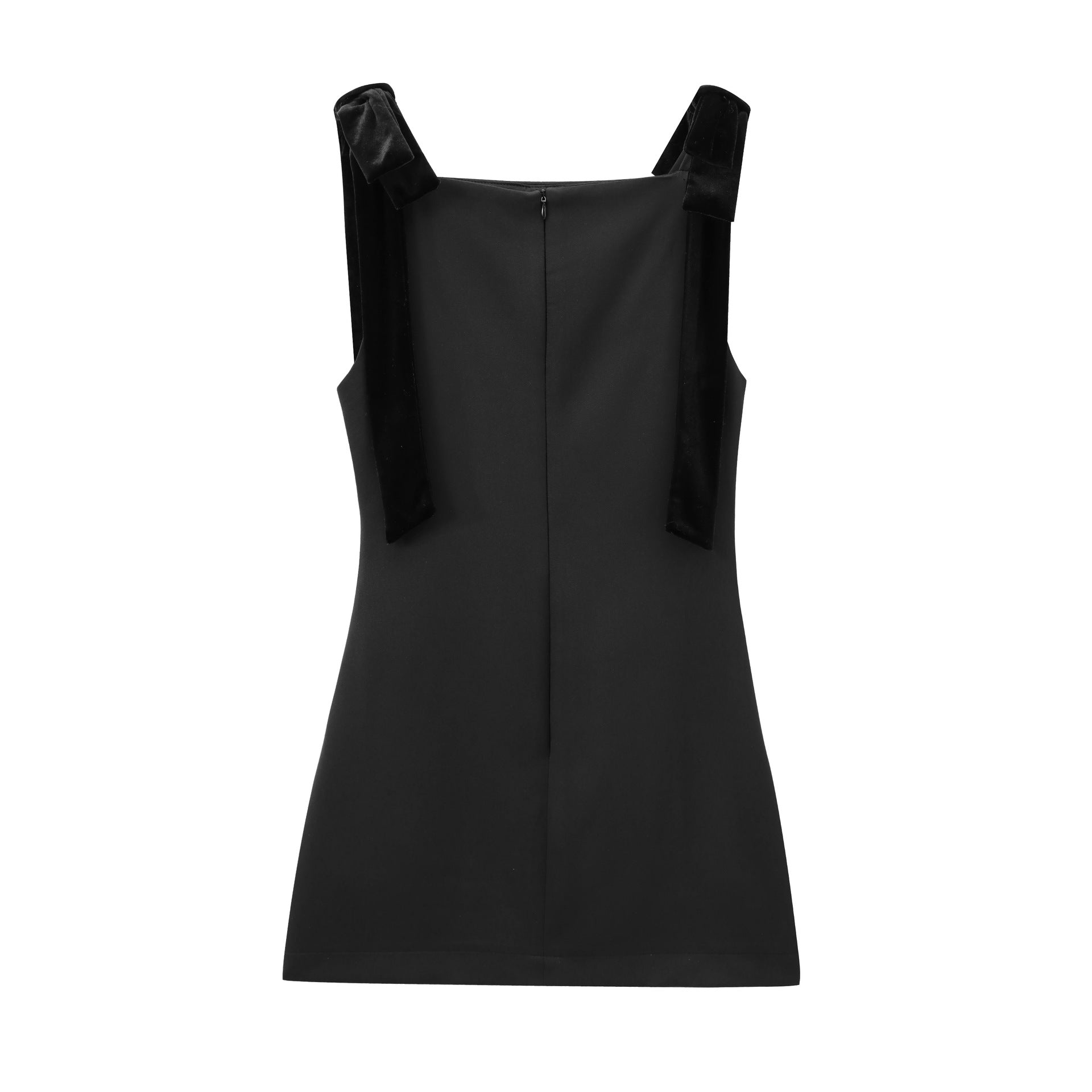 This black A-line mini dress features a refined square neckline and velvet bow straps for a soft, feminine touch. Clean lines and a structured fit make it perfect for cocktail parties, dinners, or elevated evening looks.