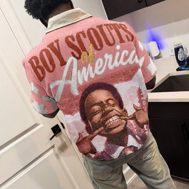 Boy Scout Tapestry Print Short Sleeve Button Lapel Jacket