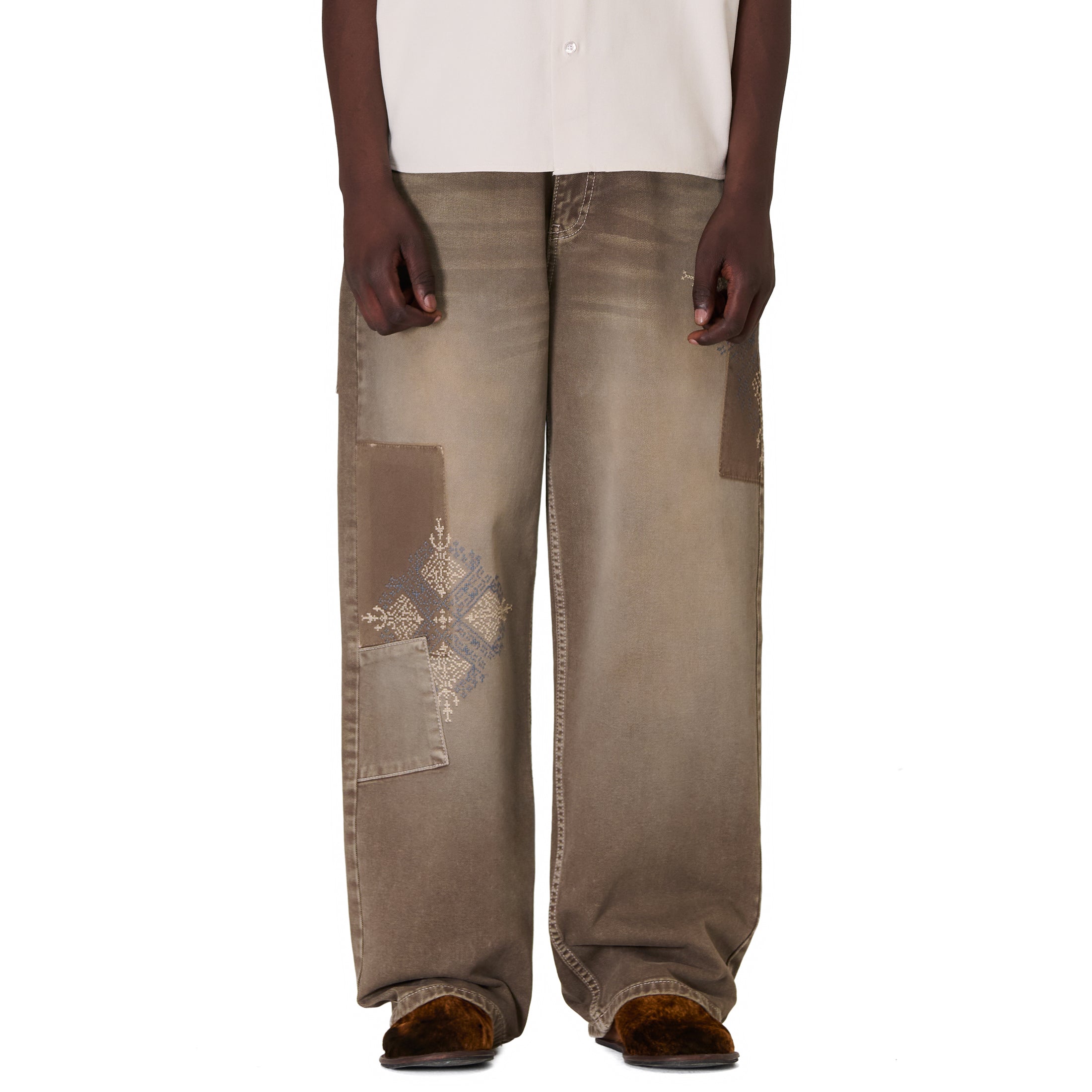 14,5oz denim / 100% cotton / embroidery on front and back / patches on front and back / embroidered leather patch / custom button / brown washed effect / wash inside out / fits true to size