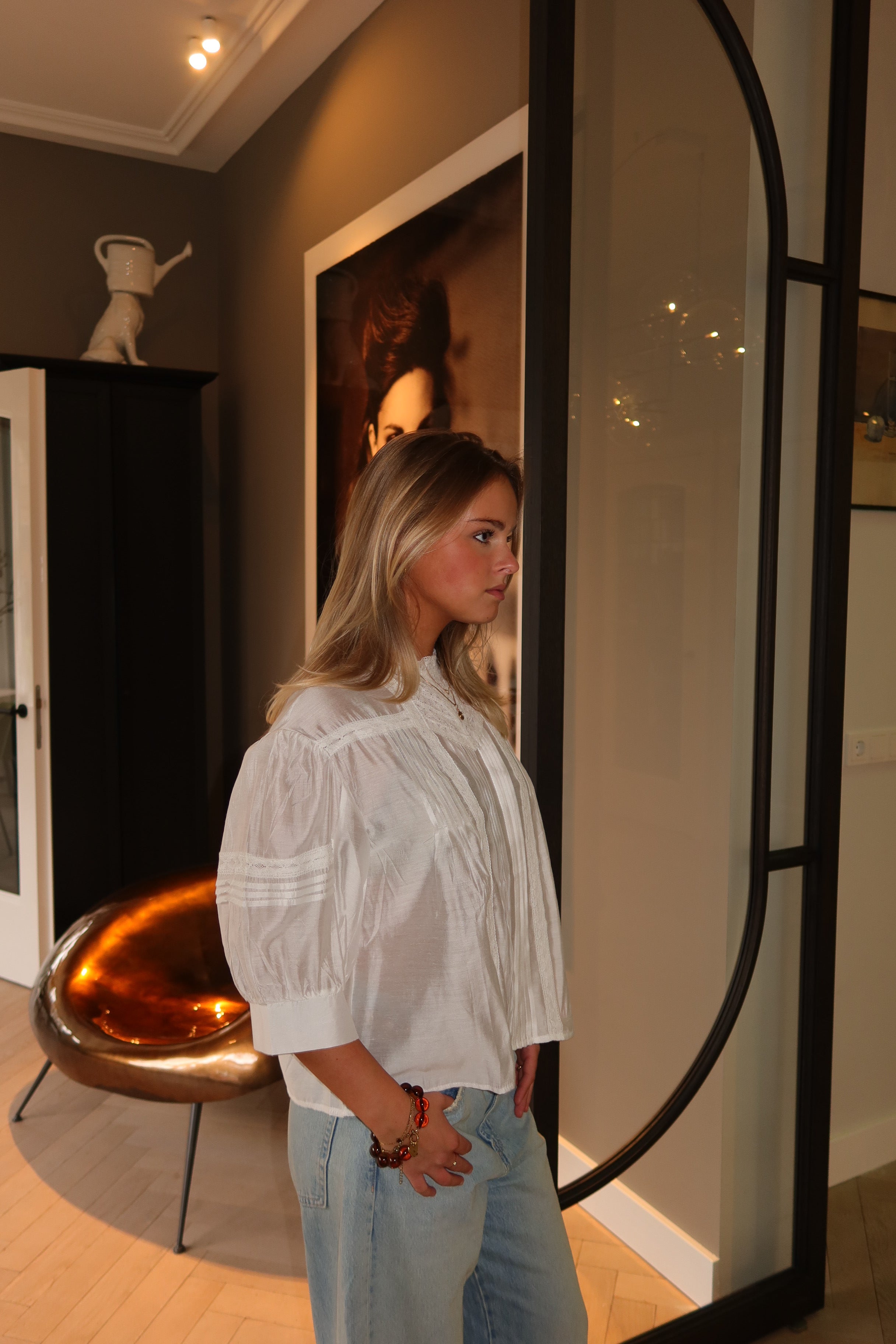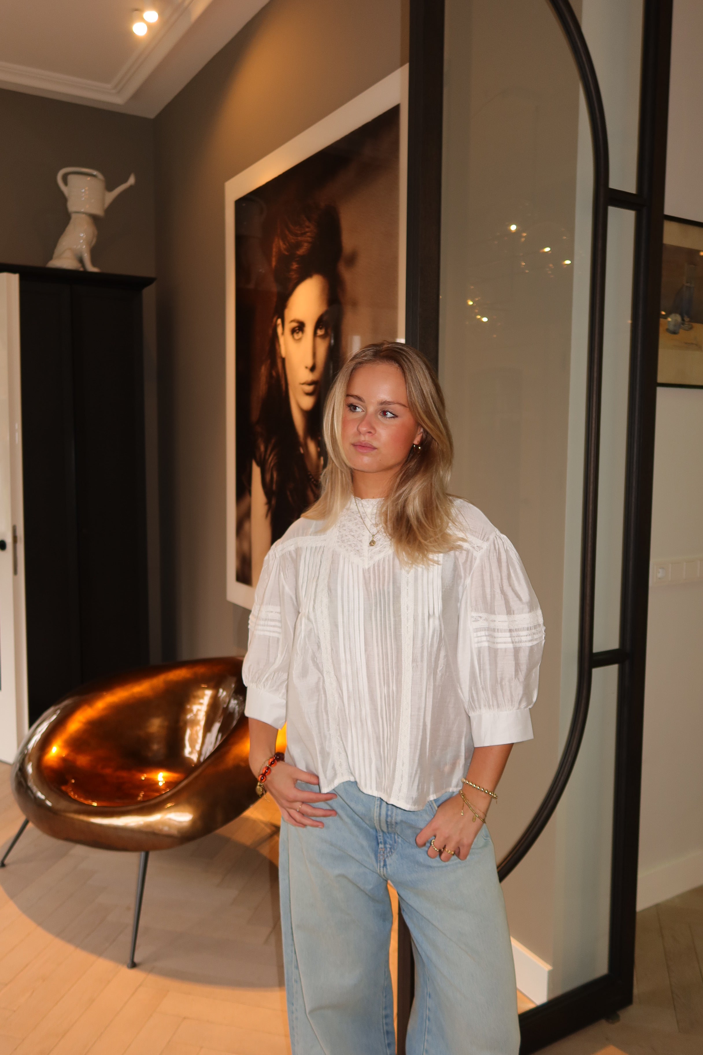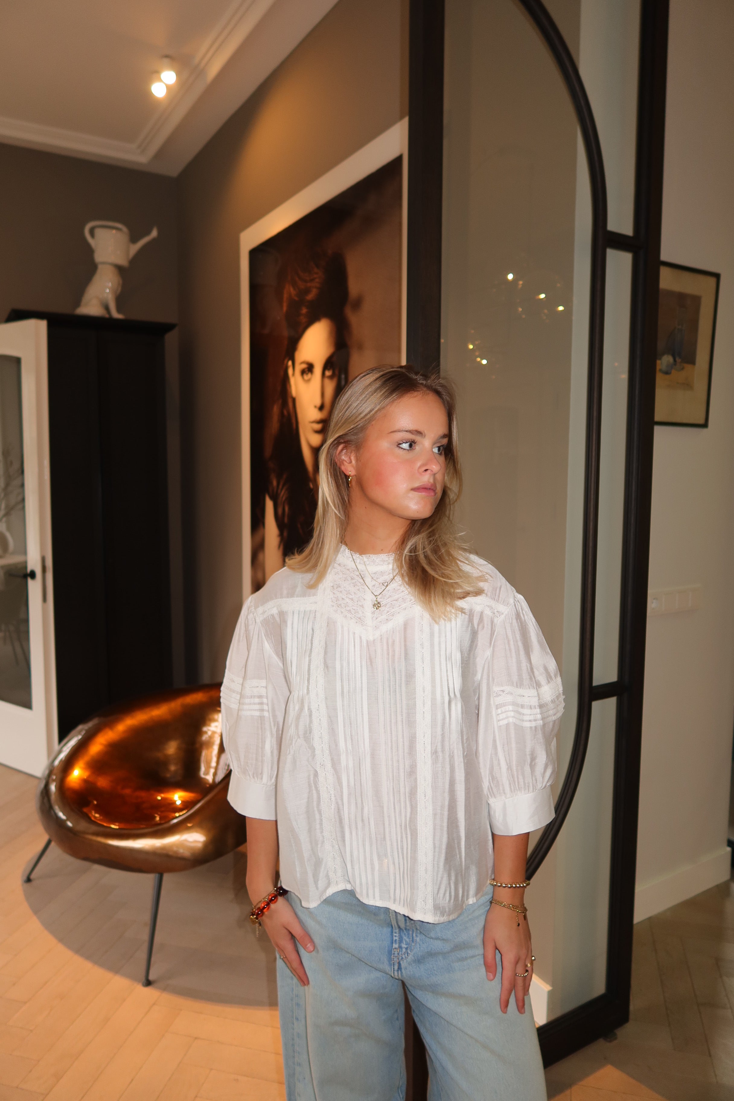 Romantic white blouse with a delicate lace yoke and refined pintuck pleats. The soft, lightweight fabric and gently puffed sleeves create a feminine, vintage-inspired silhouette, while lace trims add elegant detail. Perfect to pair with denim or tailored pieces for an effortless, polished look.