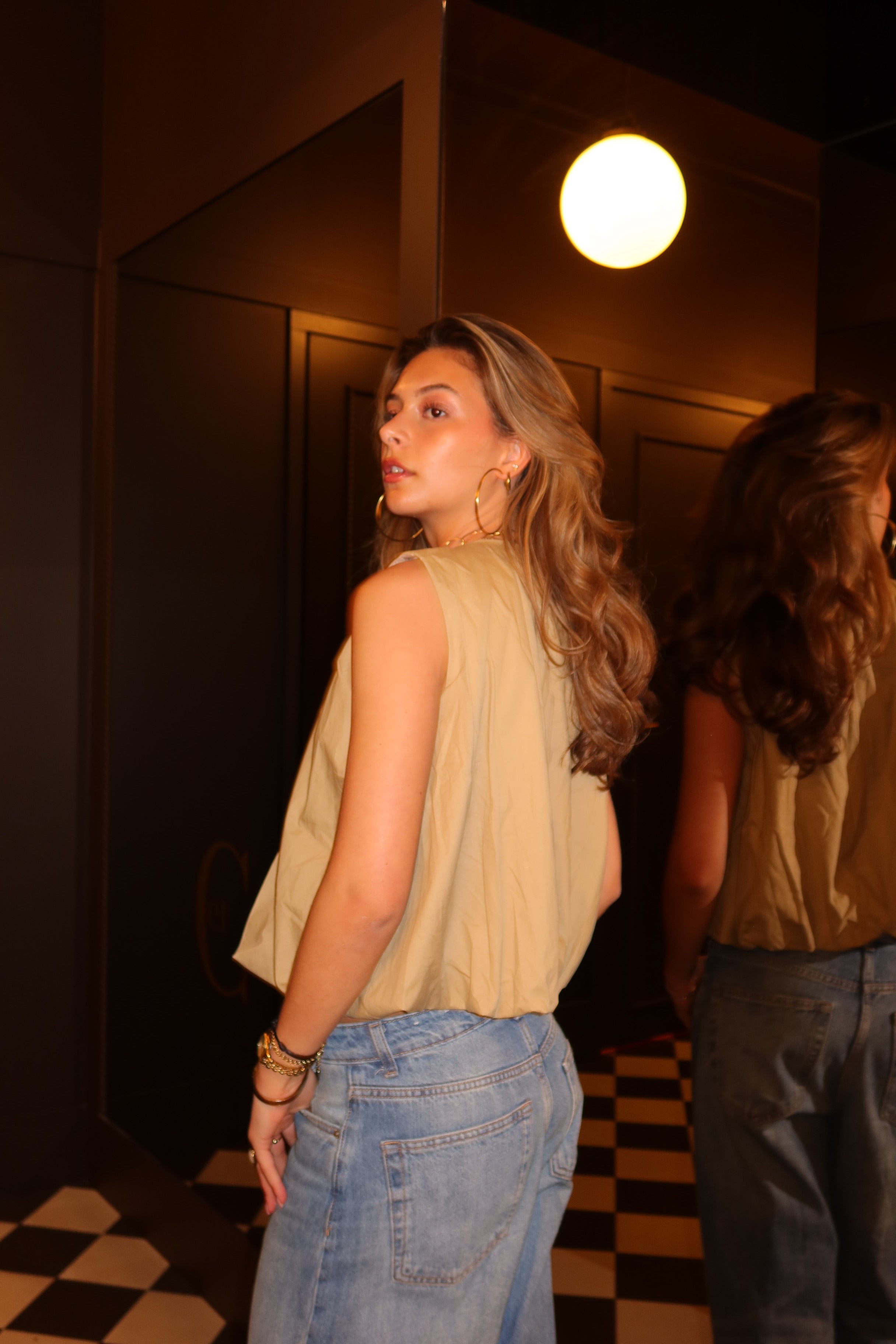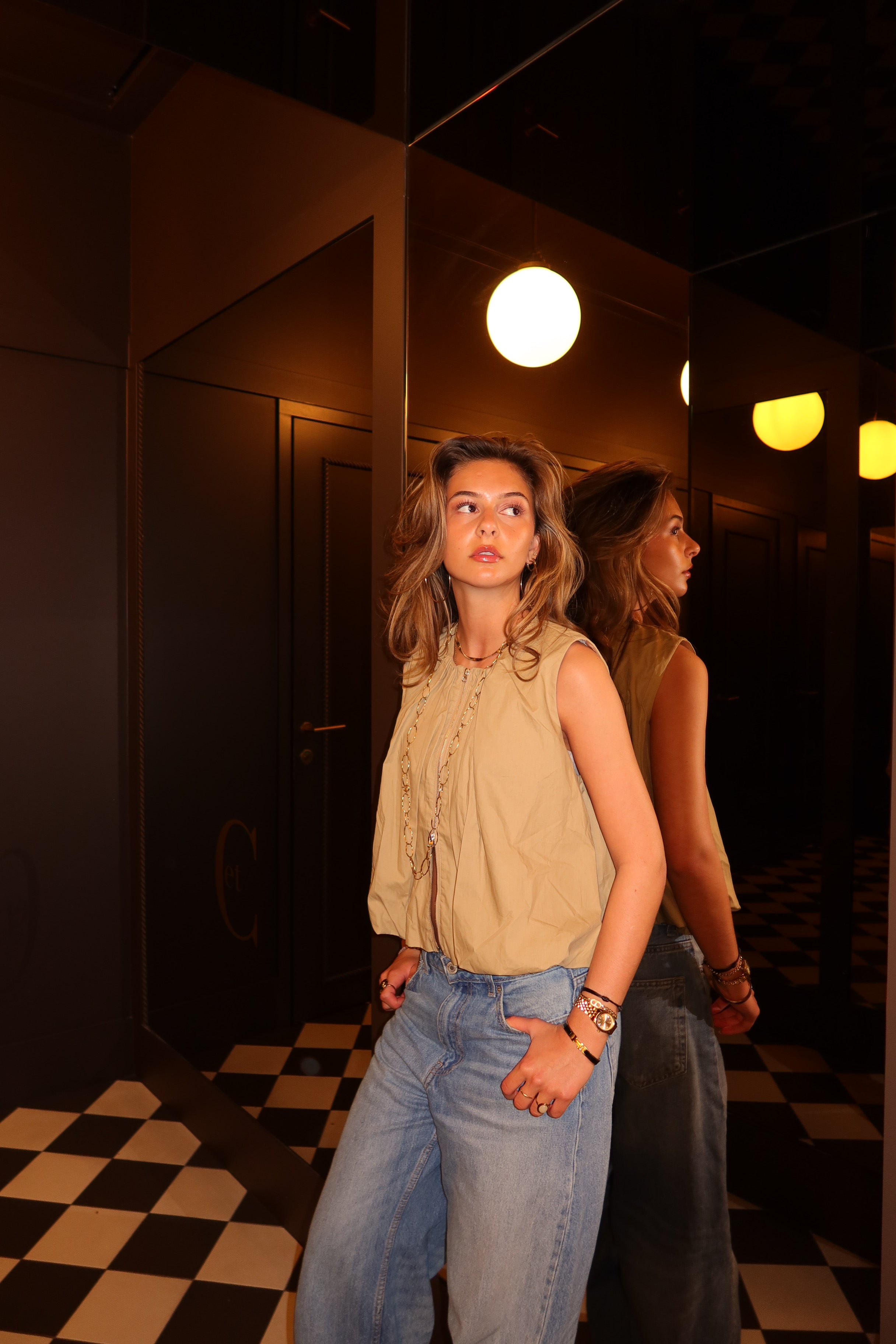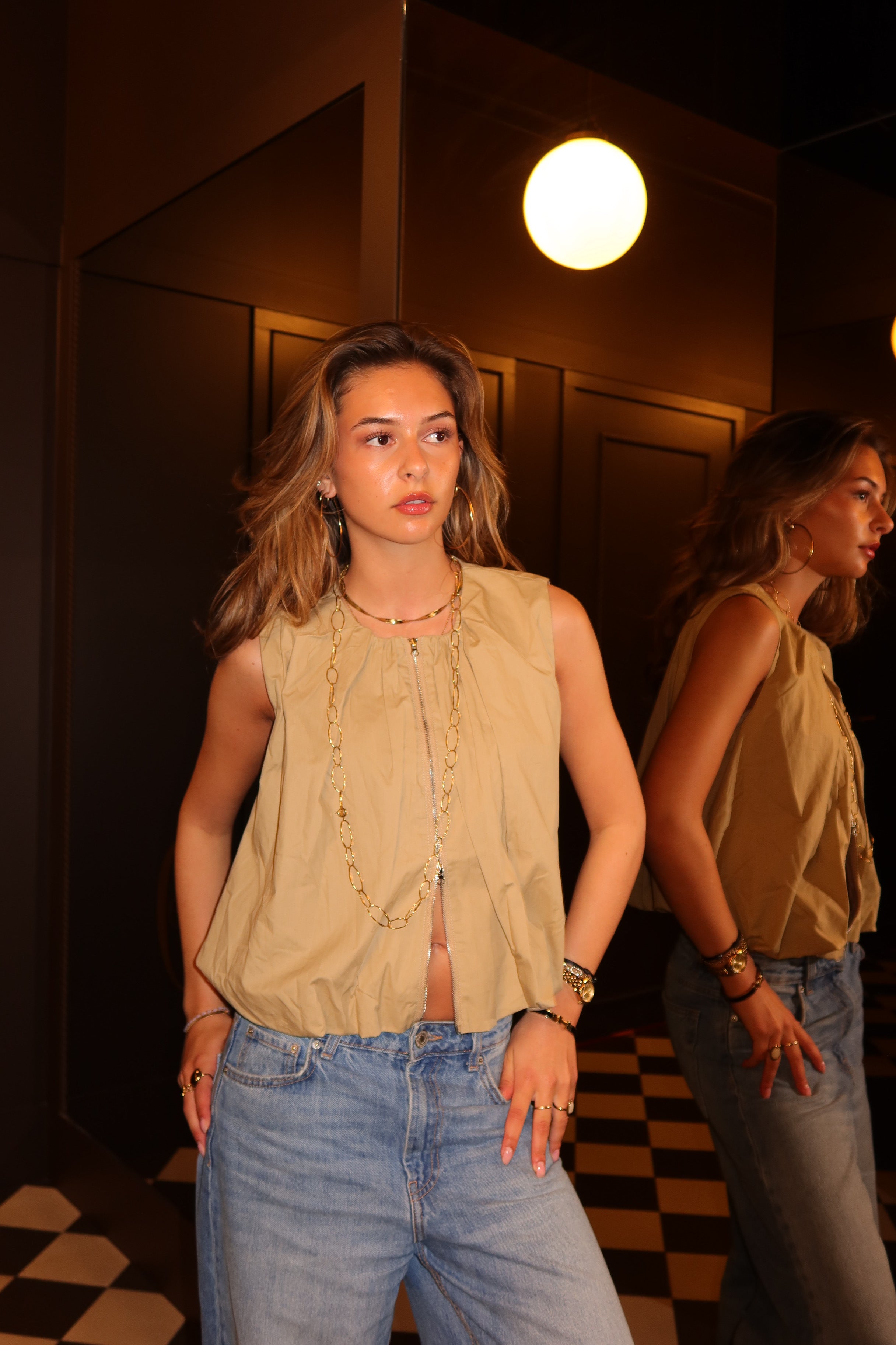 Modern sleeveless top in a warm golden hue with a sculptural, voluminous silhouette. The gathered neckline and front zip detail create a bold yet refined look, while the lightweight structured fabric adds shape without heaviness. A statement piece that pairs effortlessly with both tailored and casual styles