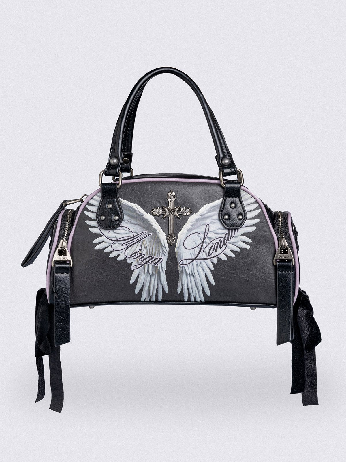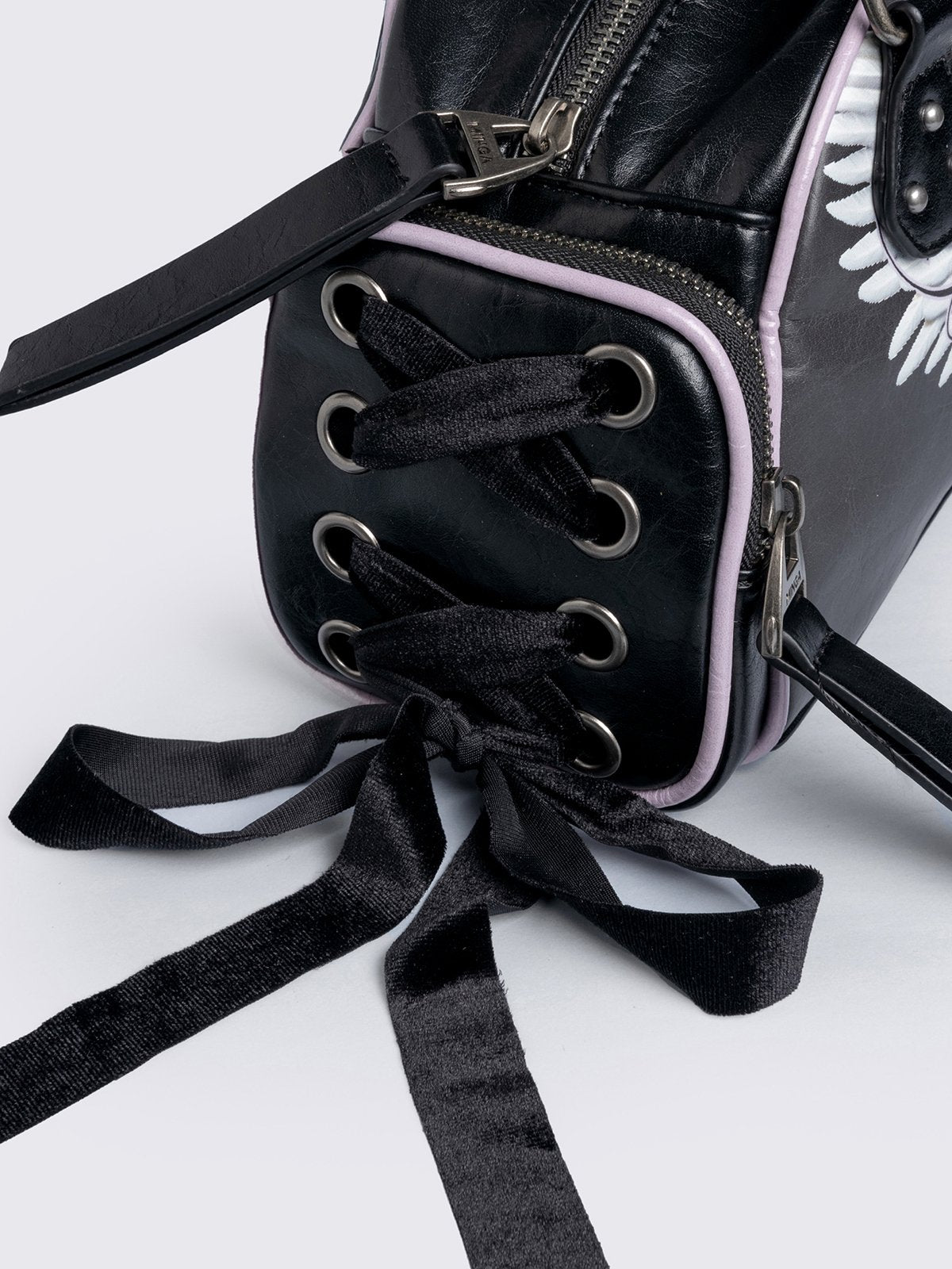 - Side exterior pockets with lace up bows