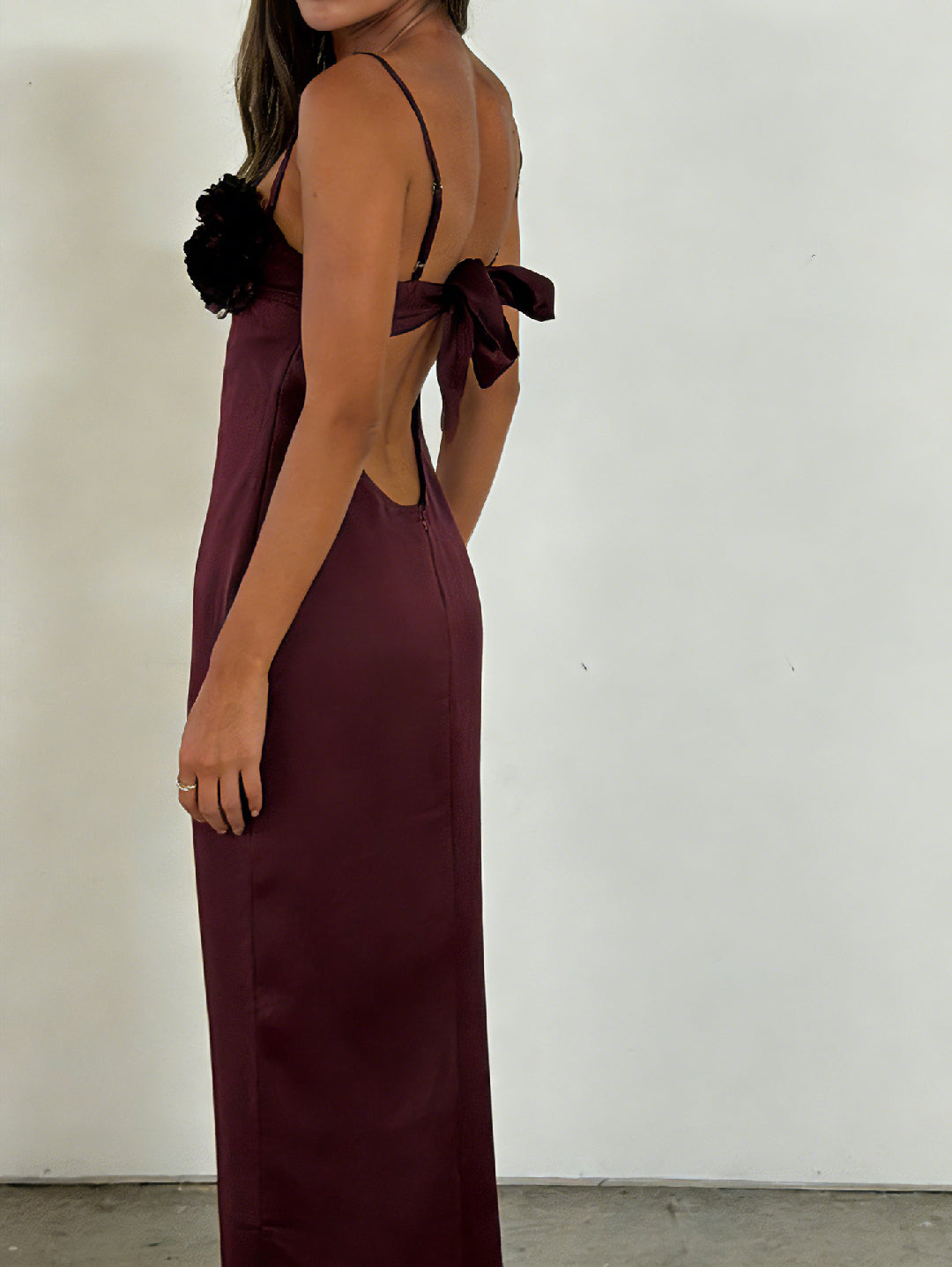 This burgundy satin maxi dress features a sultry open back with adjustable straps and two 3D floral appliqués at the bust. Smooth satin drapes beautifully, creating an elegant and romantic evening silhouette.
