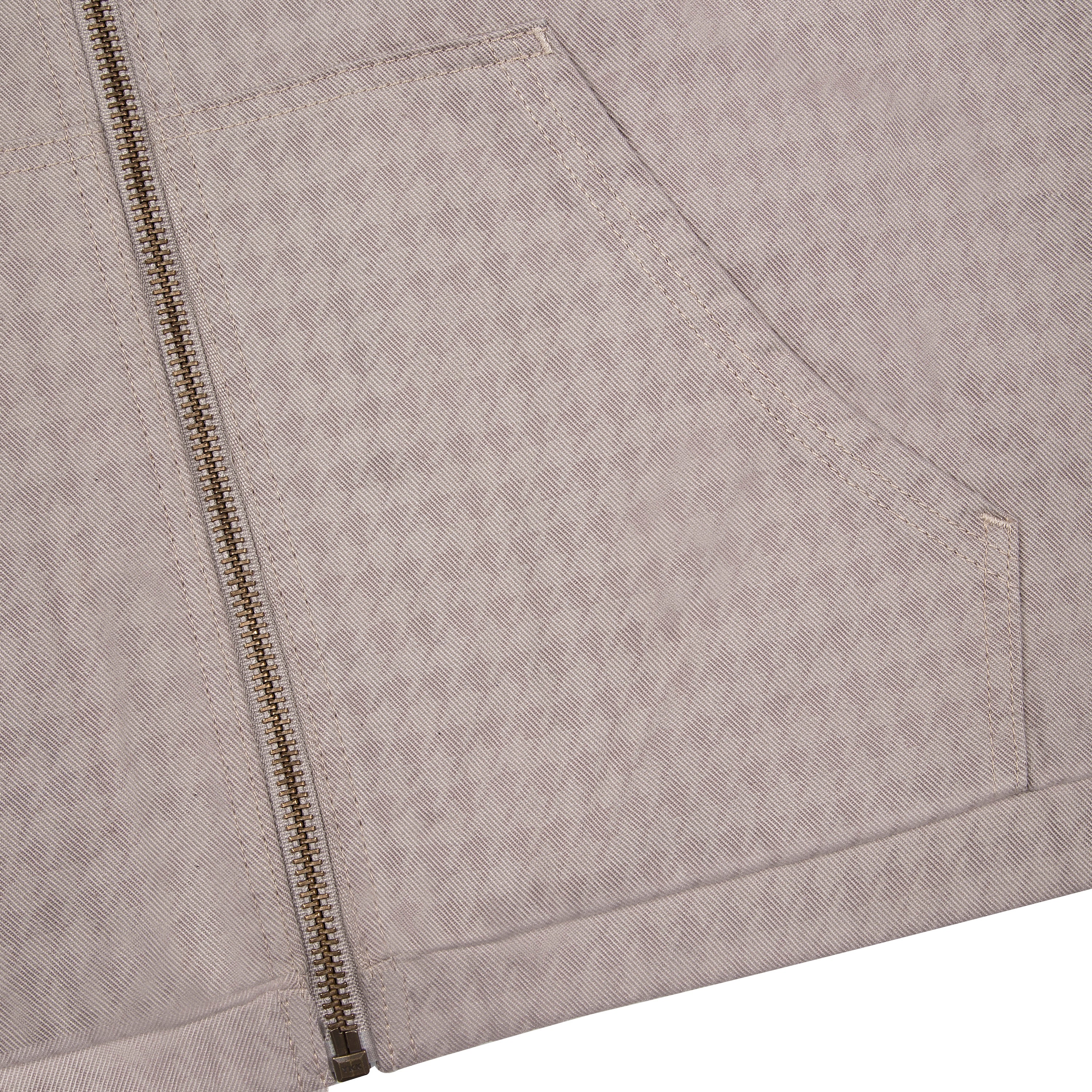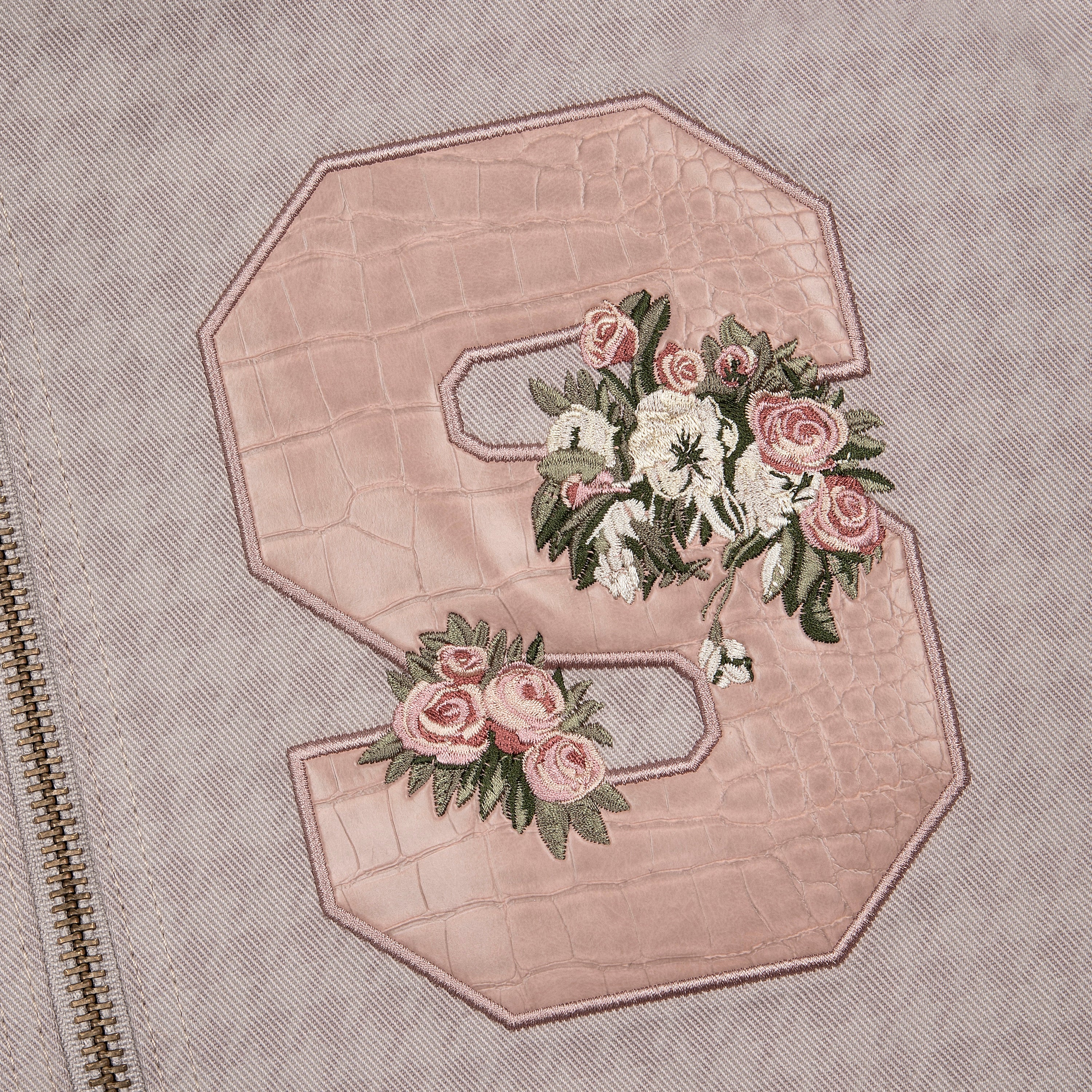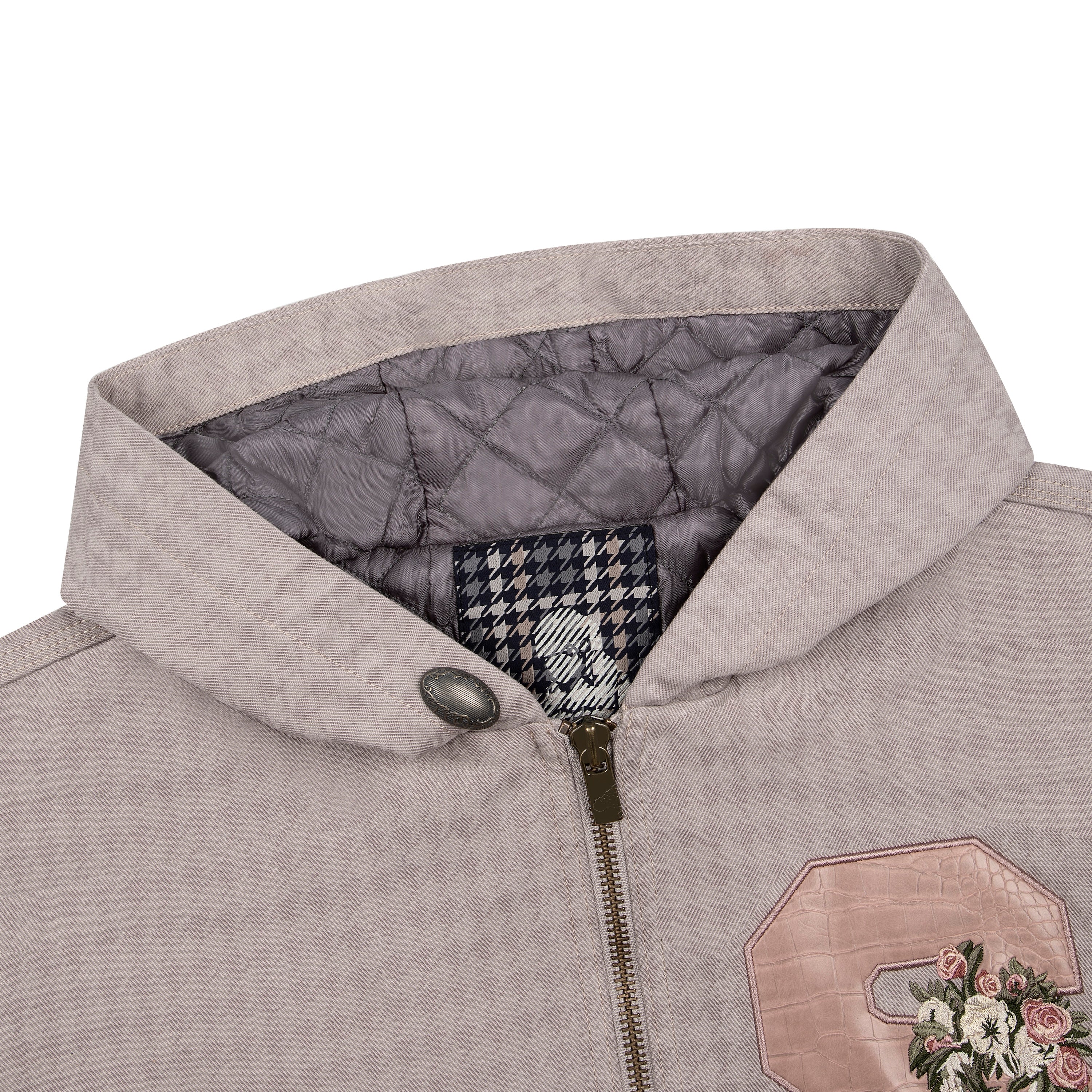 14oz canvas denim / 100% cotton / pied-de-poule patterned laser printed fabric / embroidery on front with appliqué made from vegan leather / pin on collar / with YKK zipper / fits true to size